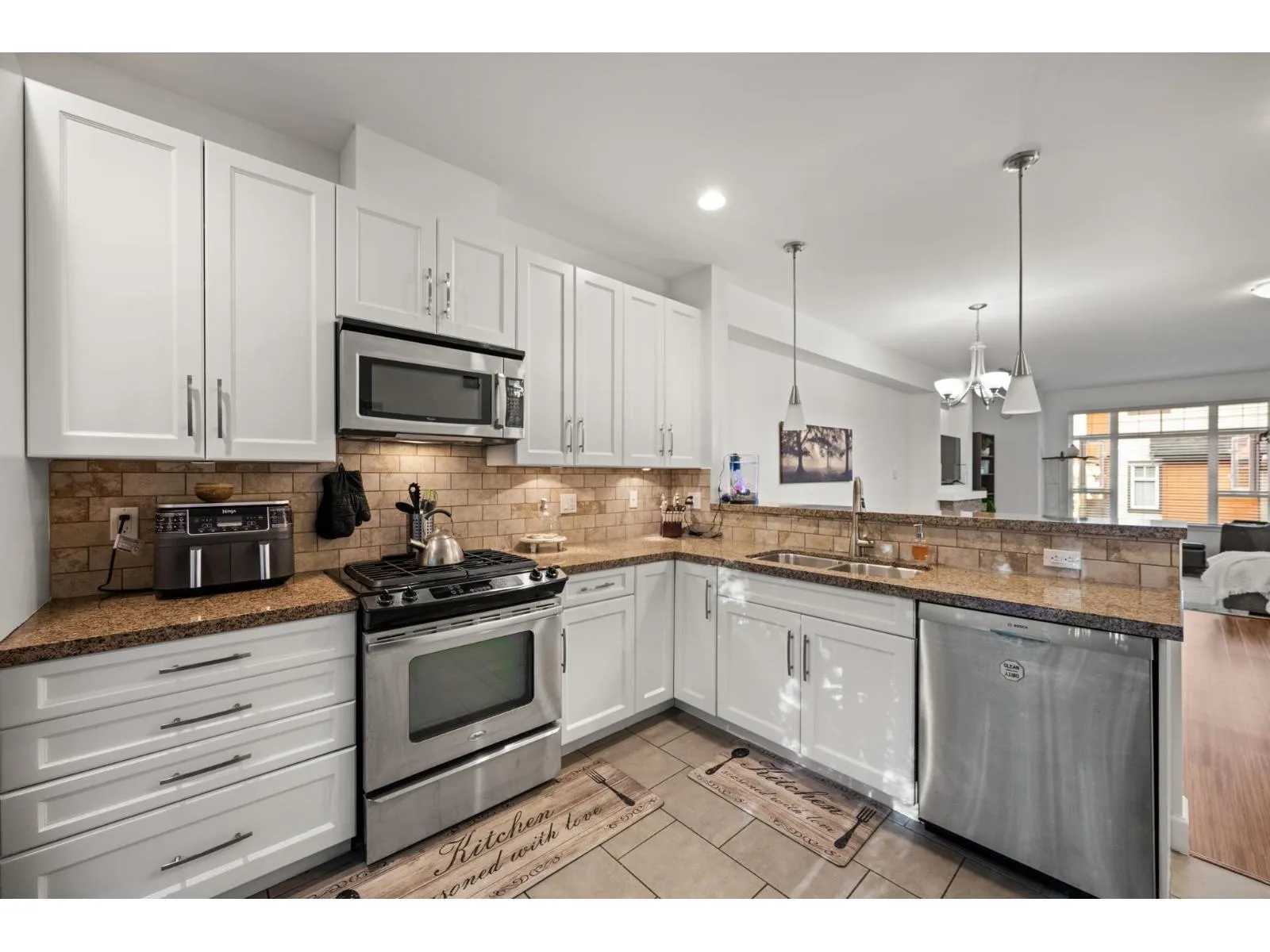 Backed by a serene greenbelt, this 2 bedroom townhome in the sought-after Enclave community has been freshly painted throughout, including updated kitchen cabinets for a light, modern feel. The main level offers an inviting open-concept design, featuring a spacious living room, a gourmet kitchen, and a dining area. Perfect for both entertaining and everyday living. Upstairs, the primary suite provides a relaxing retreat, complemented by a bright second bedroom, a full bath, as well as his and hers closets. Additional highlights include a double tandem garage, a private backyard, and close proximity to the vibrant shops and services of Grandview Heights and Morgan Crossing. Families will appreciate the Sunnyside Elementary and Semiahmoo Secondary (IB program) school catchments. (id:27476)