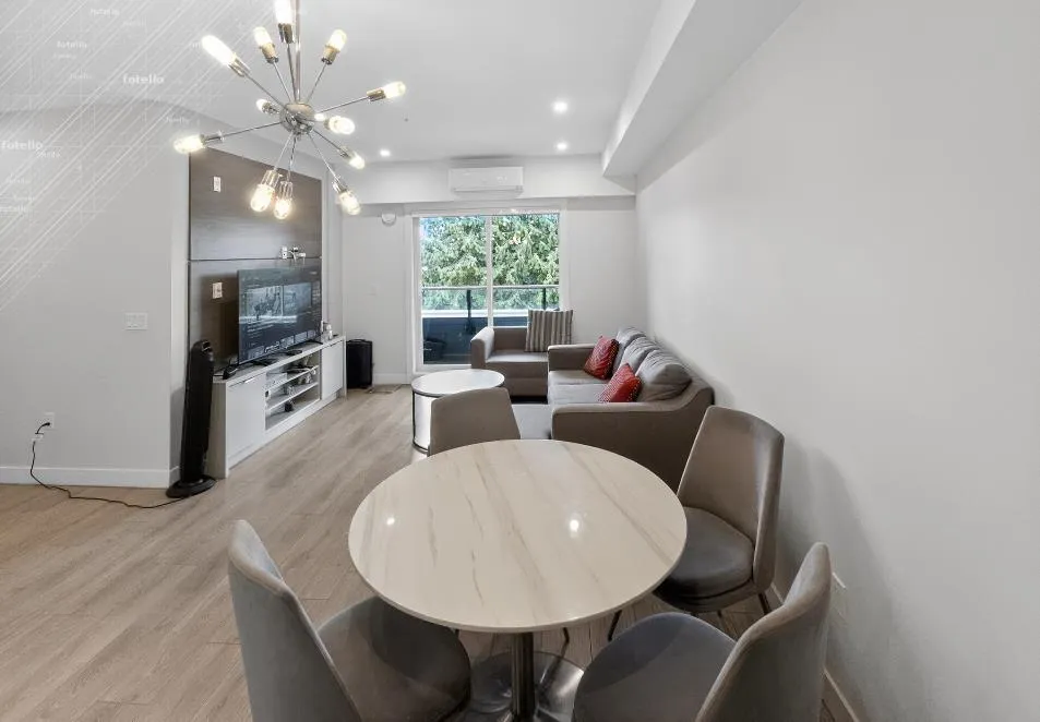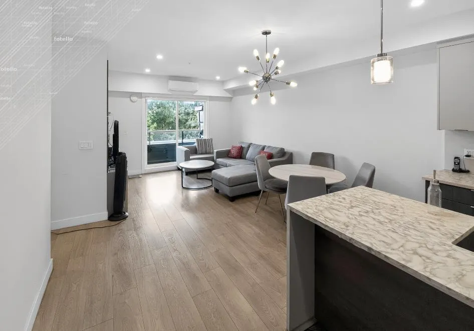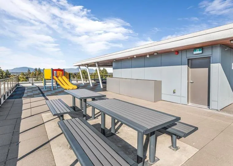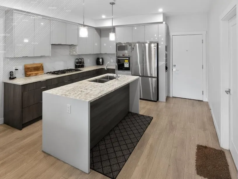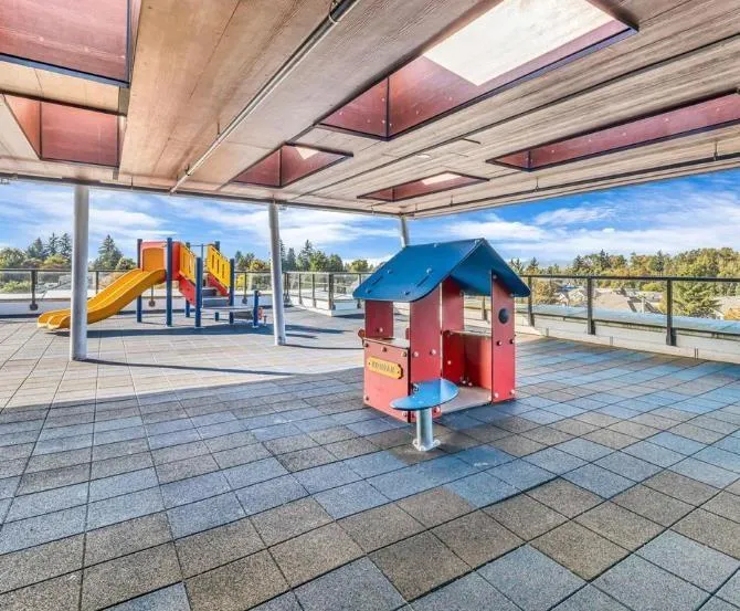 Amson Square, where comfort meets style. This 3-bedroom, 2-bath South-facing corner home offers 1,084 sqft of open, sun-filled living space with two master bedrooms for added versatility. Enjoy a chef-inspired kitchen with BOSCH appliances, a waterfall island, and elegant cabinetry. The home also features in-suite storage, two parking stalls, A/C with heat pump, custom closets, and a built-in entertainment unit. Entertain friends and family in the spacious party room equipped with a kitchen, TV, and washrooms-seamlessly connected to a patio and kids' playground for summer fun. Also offering a rooftop patio with beautiful views and convenient access to schools, restaurants, shopping, and transit, ideal for families or first-time buyers seeking comfort and community living. (id:27476)