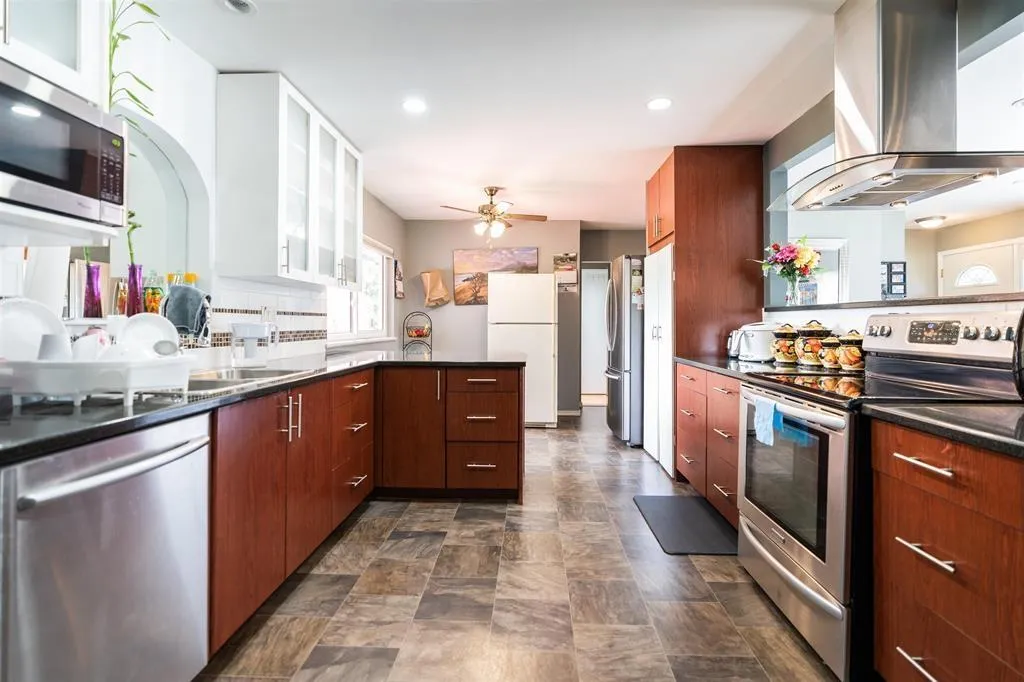 This spacious 4-bedroom, 2.5-bathroom rancher in Bolivar Heights offers comfortable living on a 7200 sq ft lot with friendly neighbors. Features include an ensuite master bedroom, living room, dining room, a gorgeously renovated kitchen with newer cabinets, countertops, and wood flooring, and a professionally upgraded solid driveway. Enjoy outdoor living with patio seating in the picturesque, fenced backyard with a stunning garden. Close to Guildford shopping center, library, & Port Mann Bridge (id:27476)