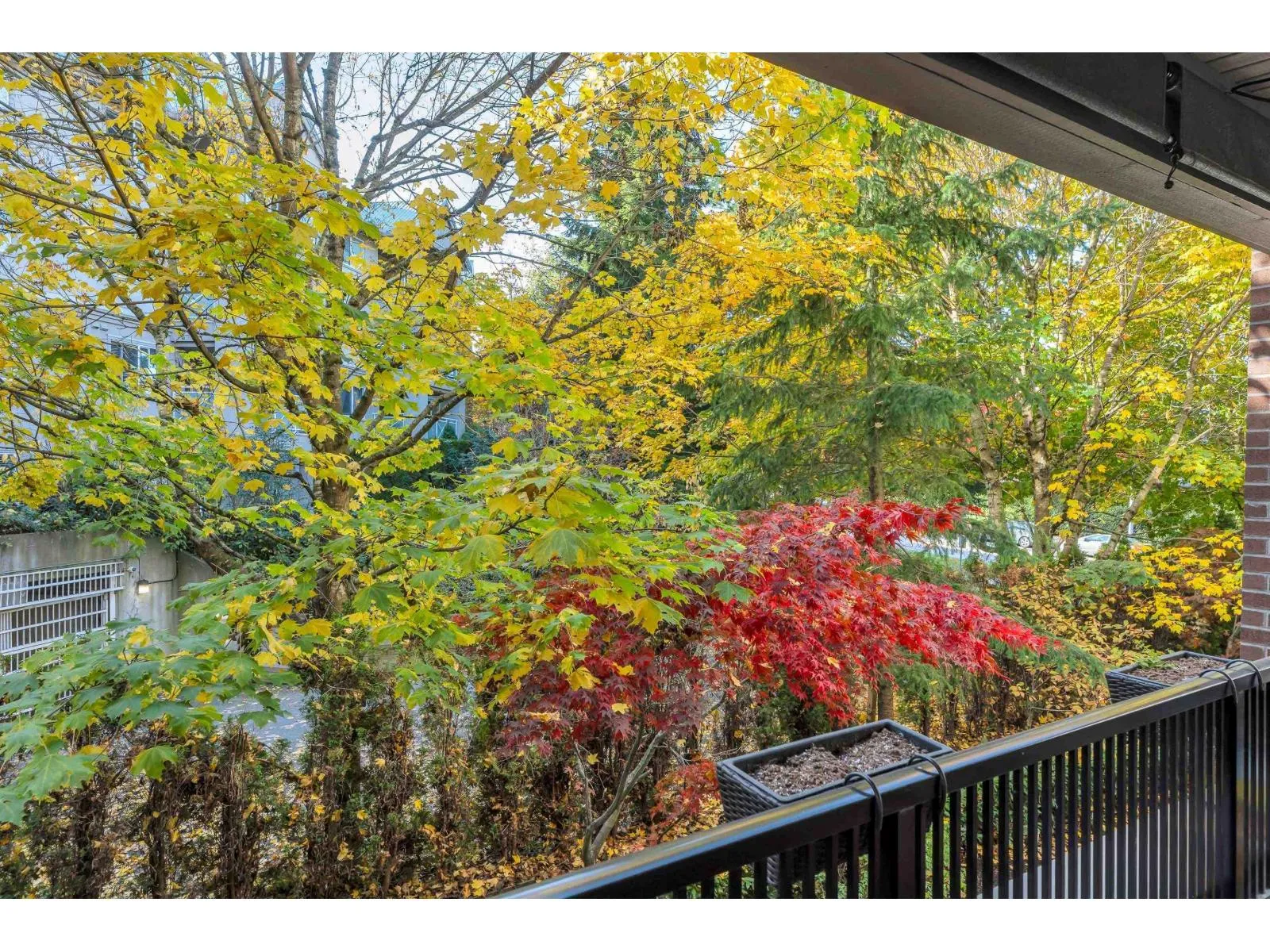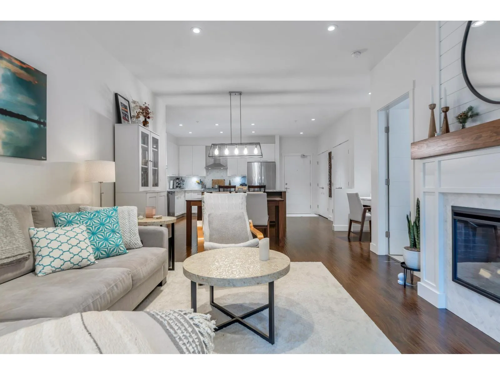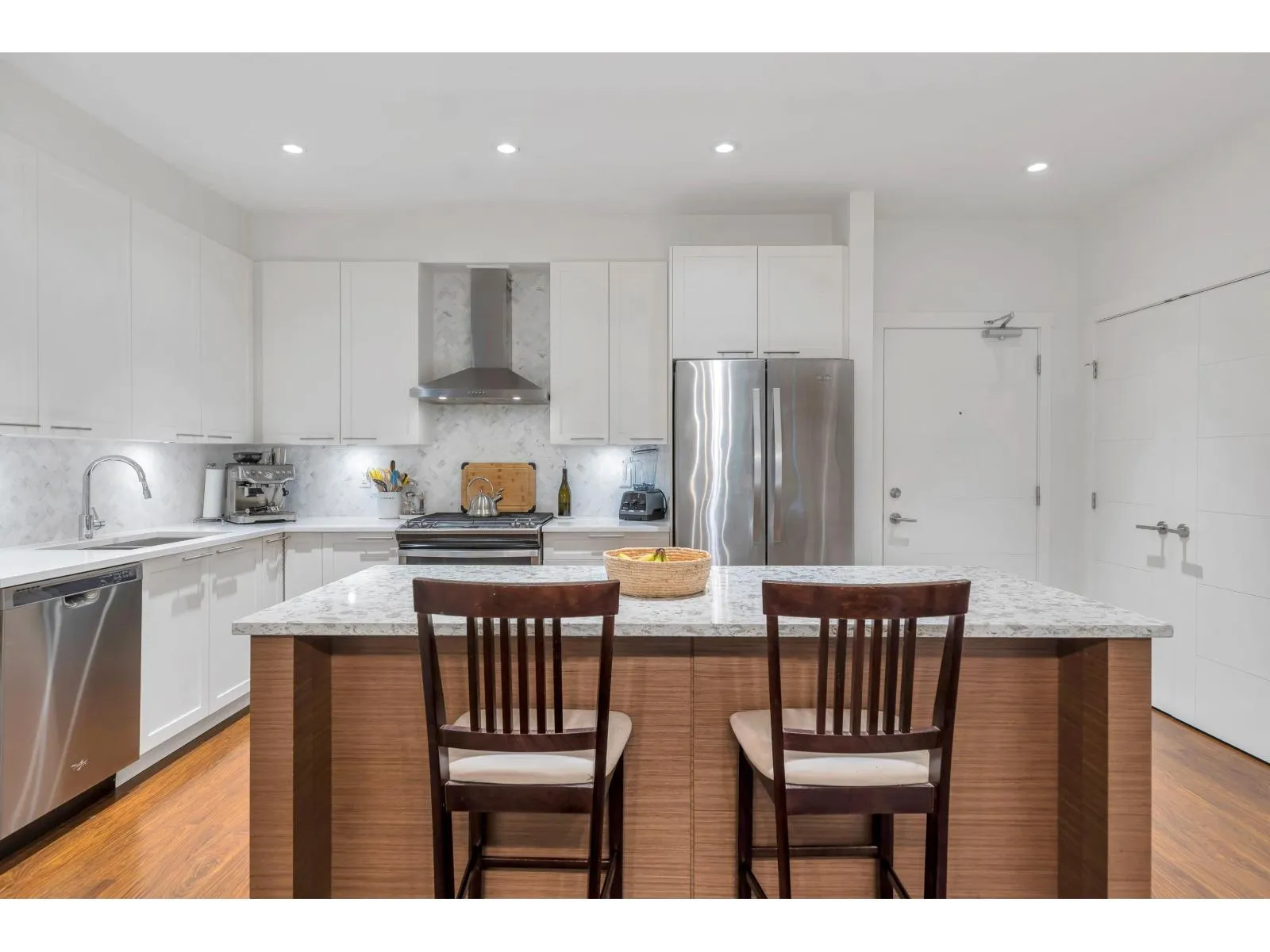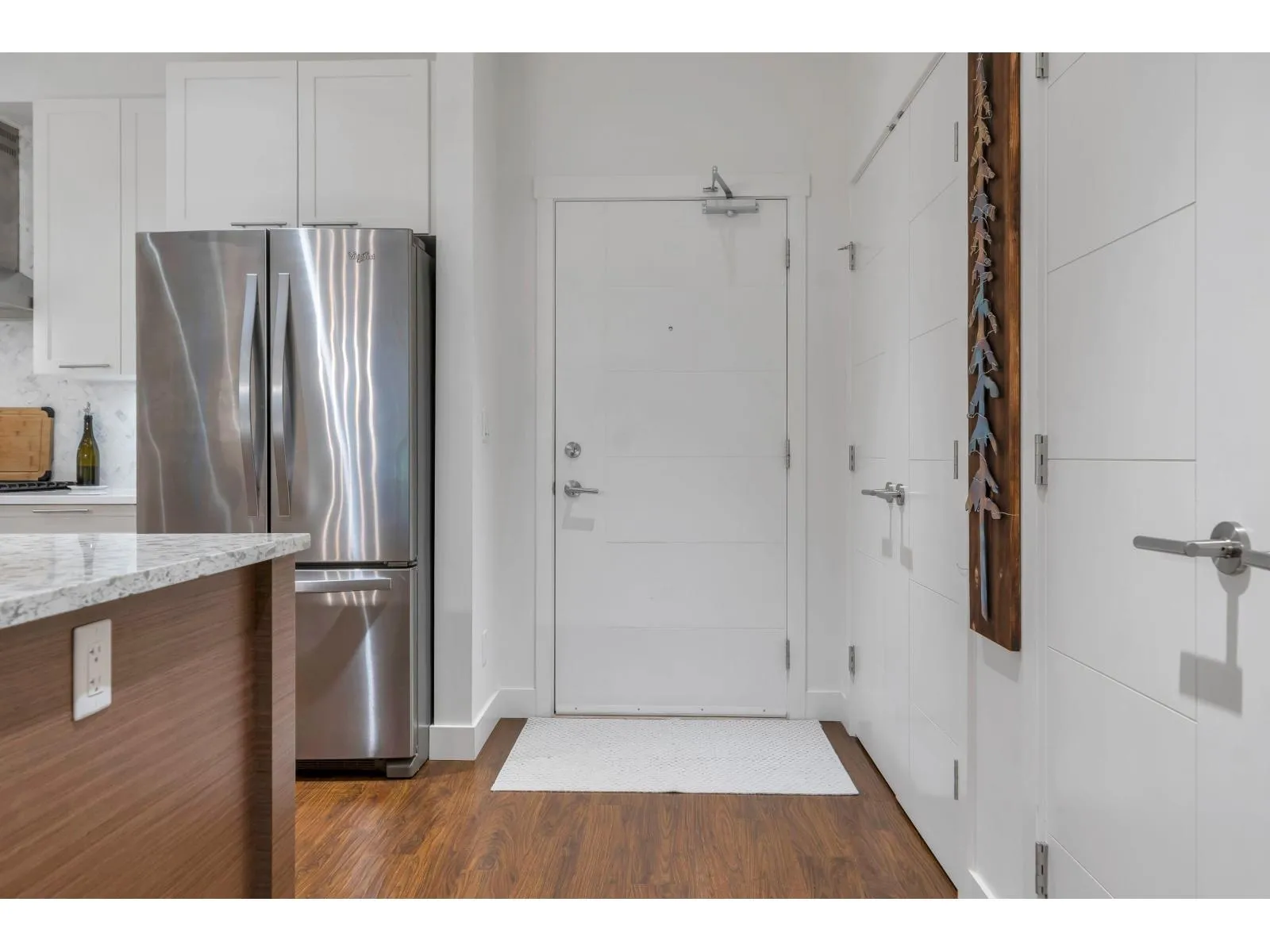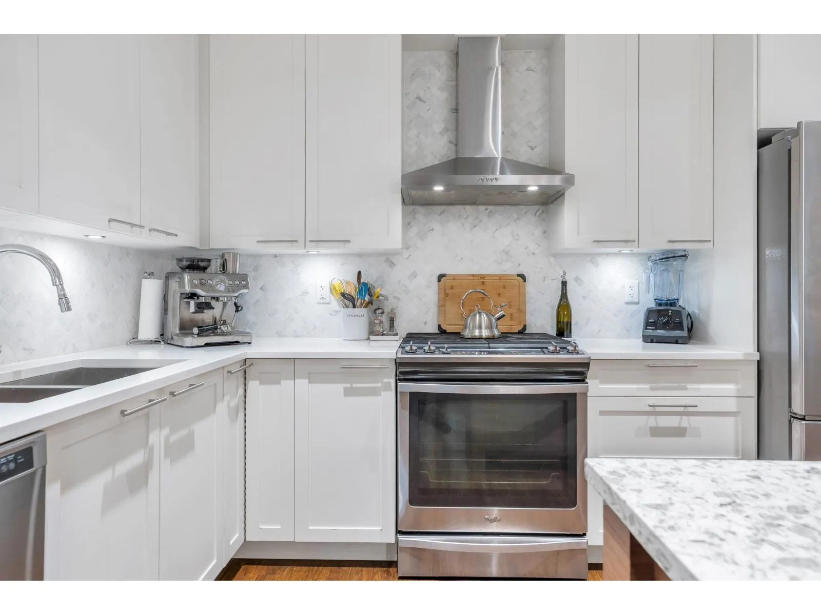 Welcome to this beautifully designed 2-bedroom, 2-bathroom unit, tucked away on the quiet side of the building for ultimate privacy. The home features a sleek, modern aesthetic with high-end finishes throughout. along with numerous upgrades. The Natural light pours into the open-concept living space, which is complemented by a stylish and cohesive color palette. The gourmet kitchen is a standout, showcasing a custom tile backsplash, a gas range, and premium appliances-perfect for both everyday meals and entertaining guests. Step outside onto your private, covered deck, where you can relax and enjoy views of a serene greenbelt. Storage locker and two side-by-side parking spots. (id:27476)
