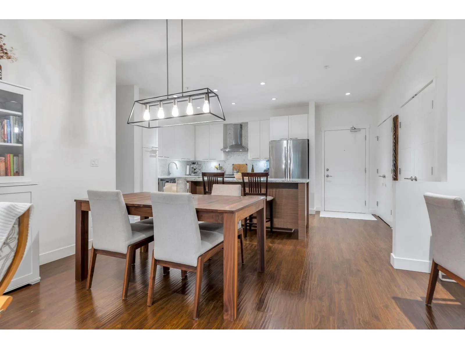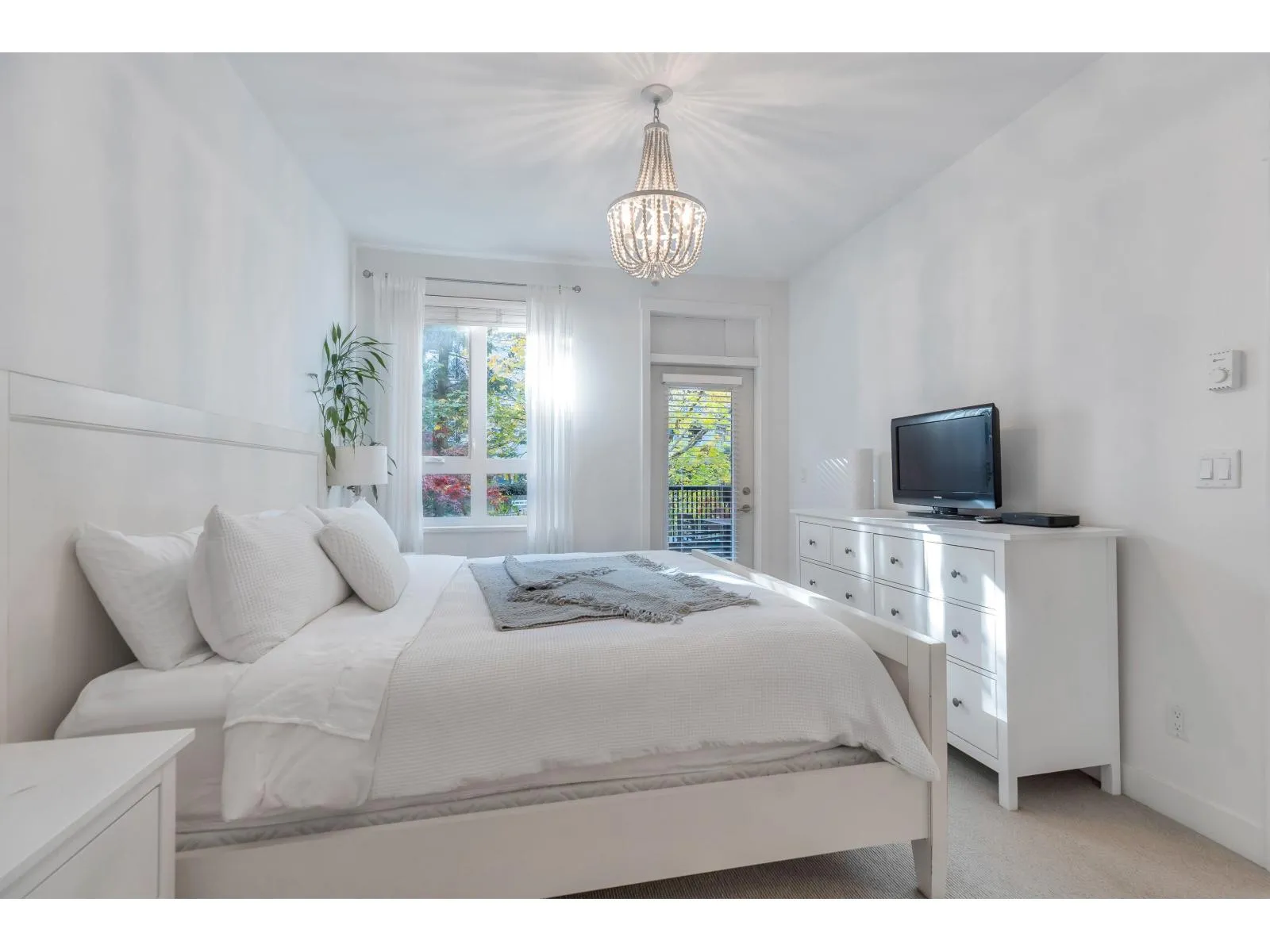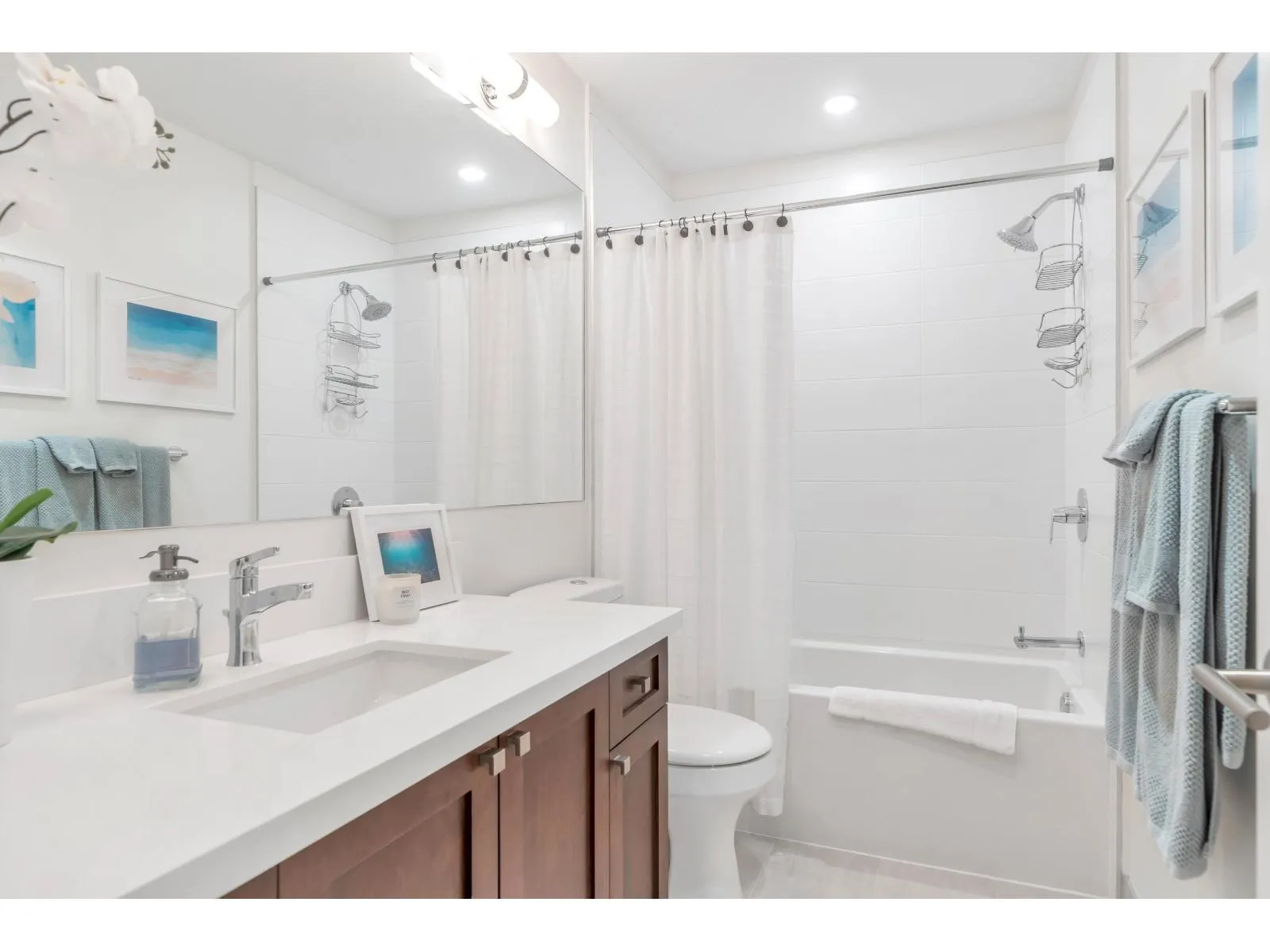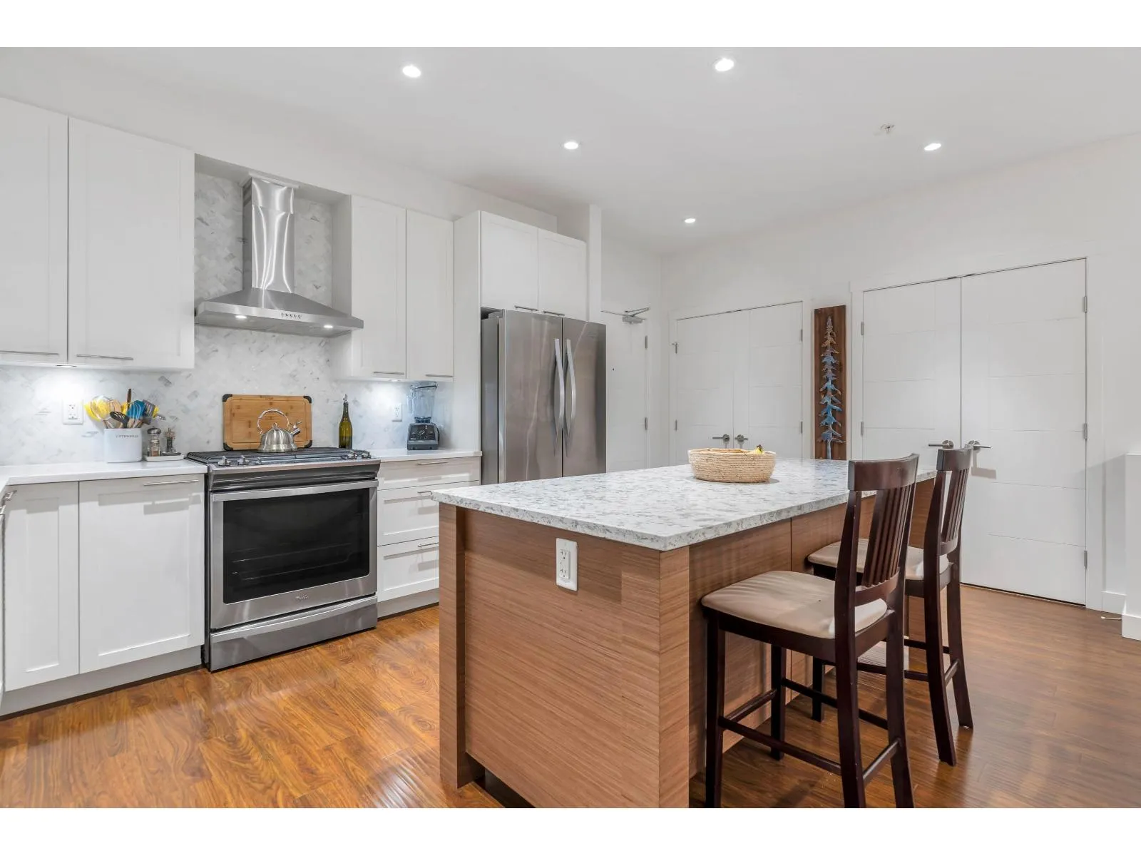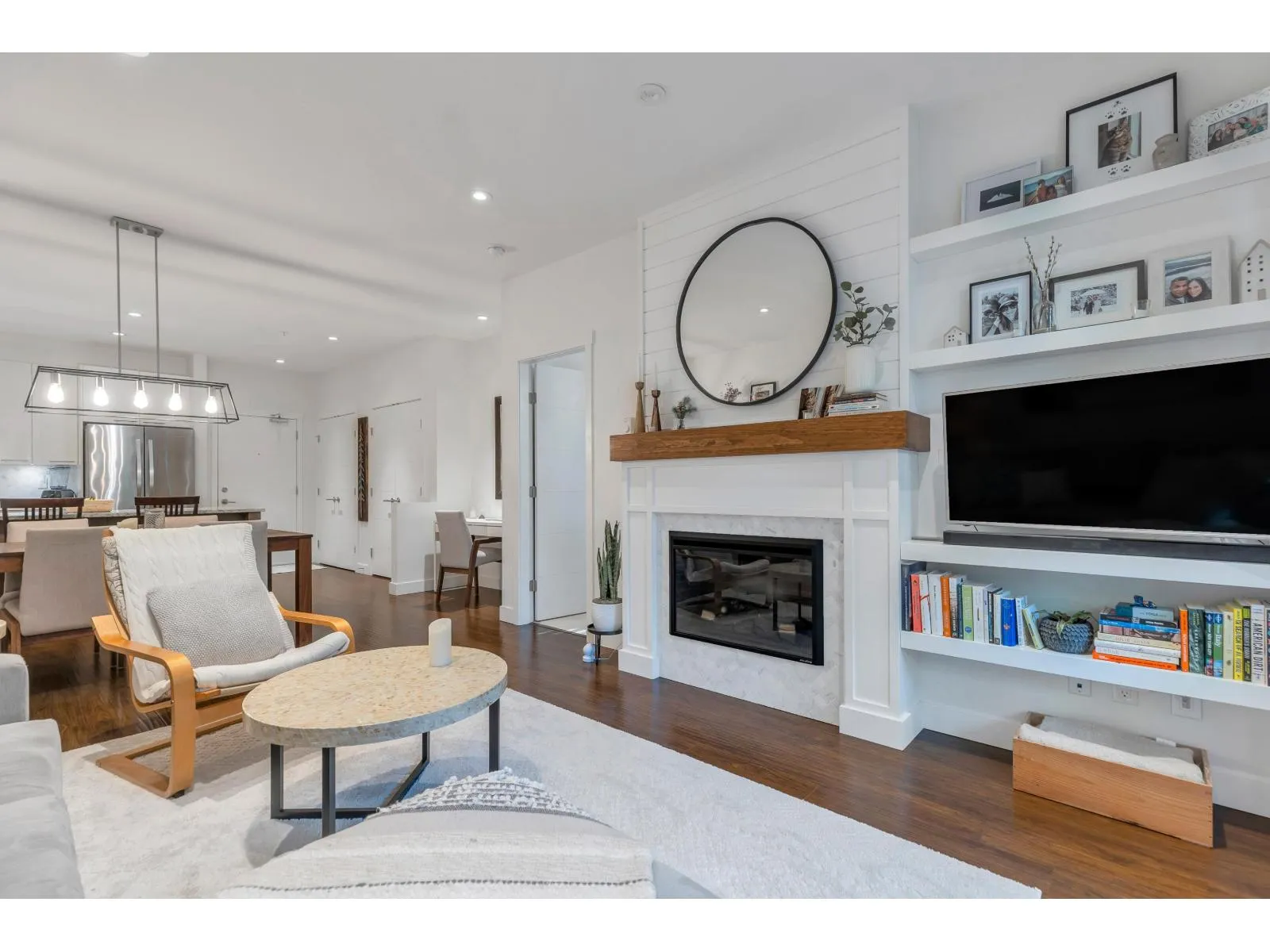 Welcome to this beautifully designed 2-bedroom, 2-bathroom unit, tucked away on the quiet side of the building for ultimate privacy. The home features a sleek, modern aesthetic with high-end finishes throughout. along with numerous upgrades. The Natural light pours into the open-concept living space, which is complemented by a stylish and cohesive color palette. The gourmet kitchen is a standout, showcasing a custom tile backsplash, a gas range, and premium appliances-perfect for both everyday meals and entertaining guests. Step outside onto your private, covered deck, where you can relax and enjoy views of a serene greenbelt. Storage locker and two side-by-side parking spots. (id:27476)