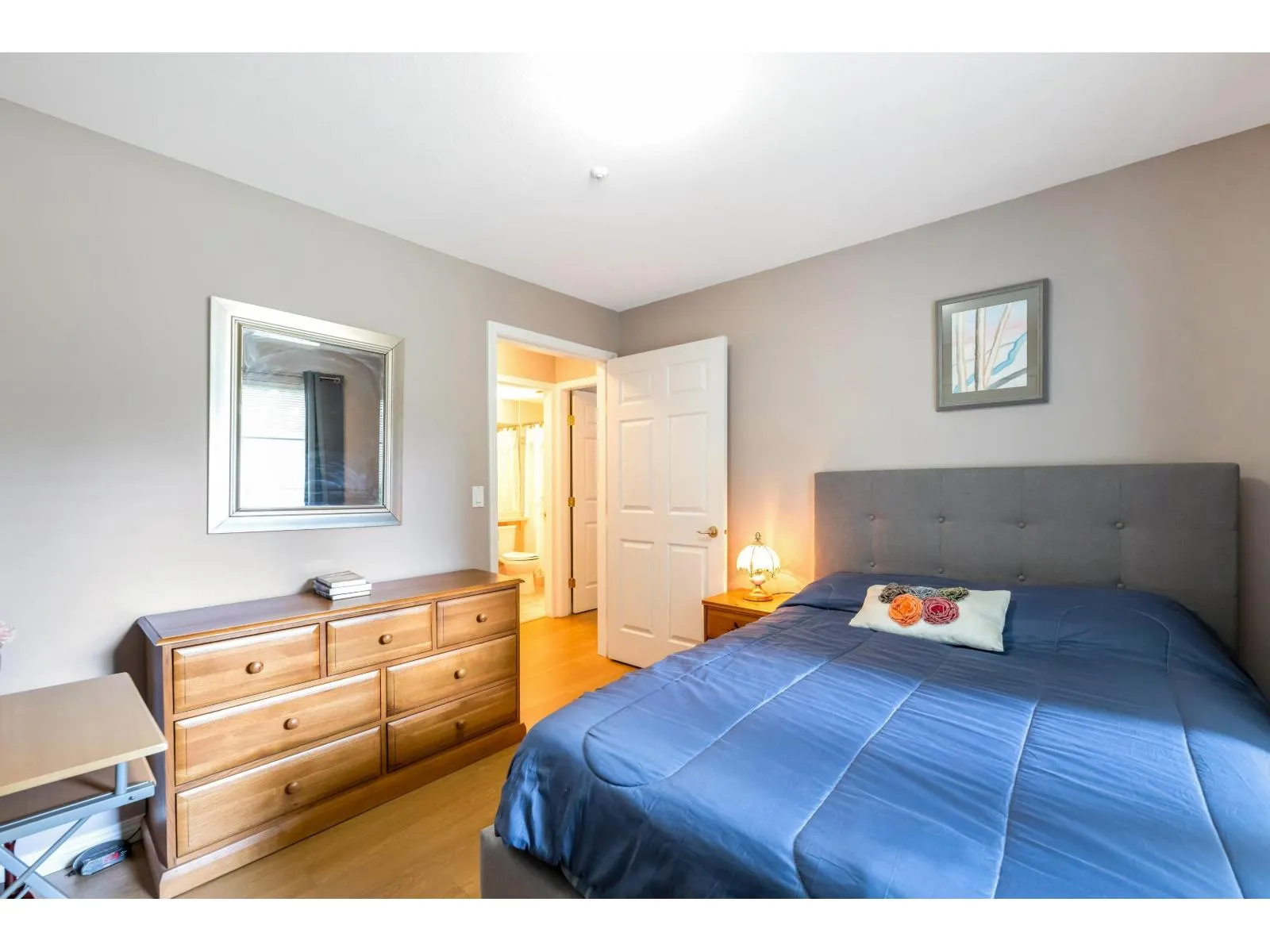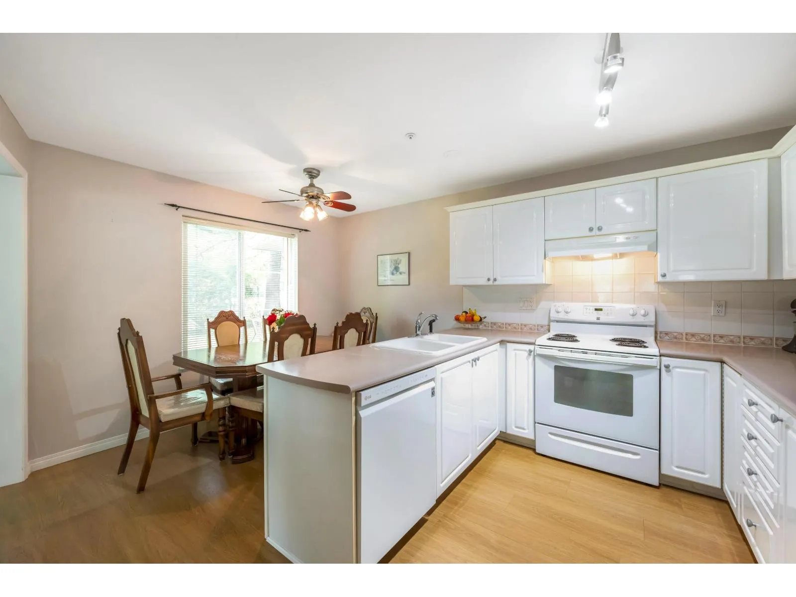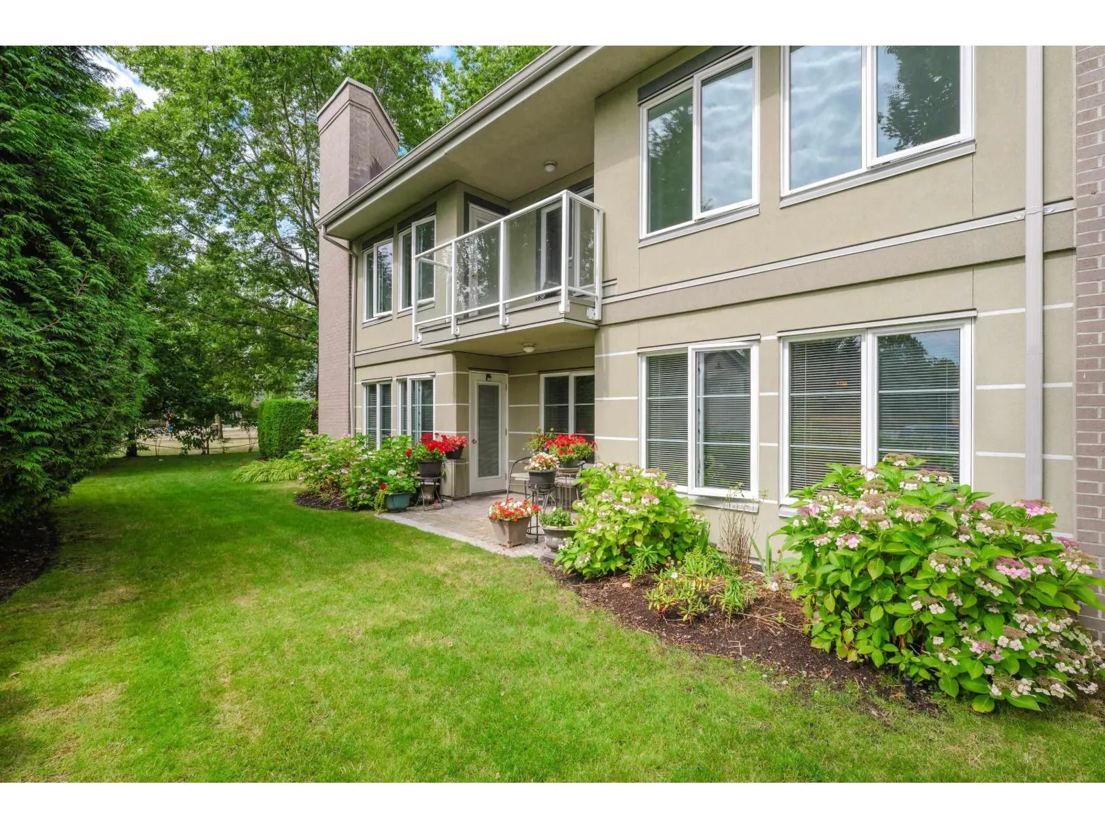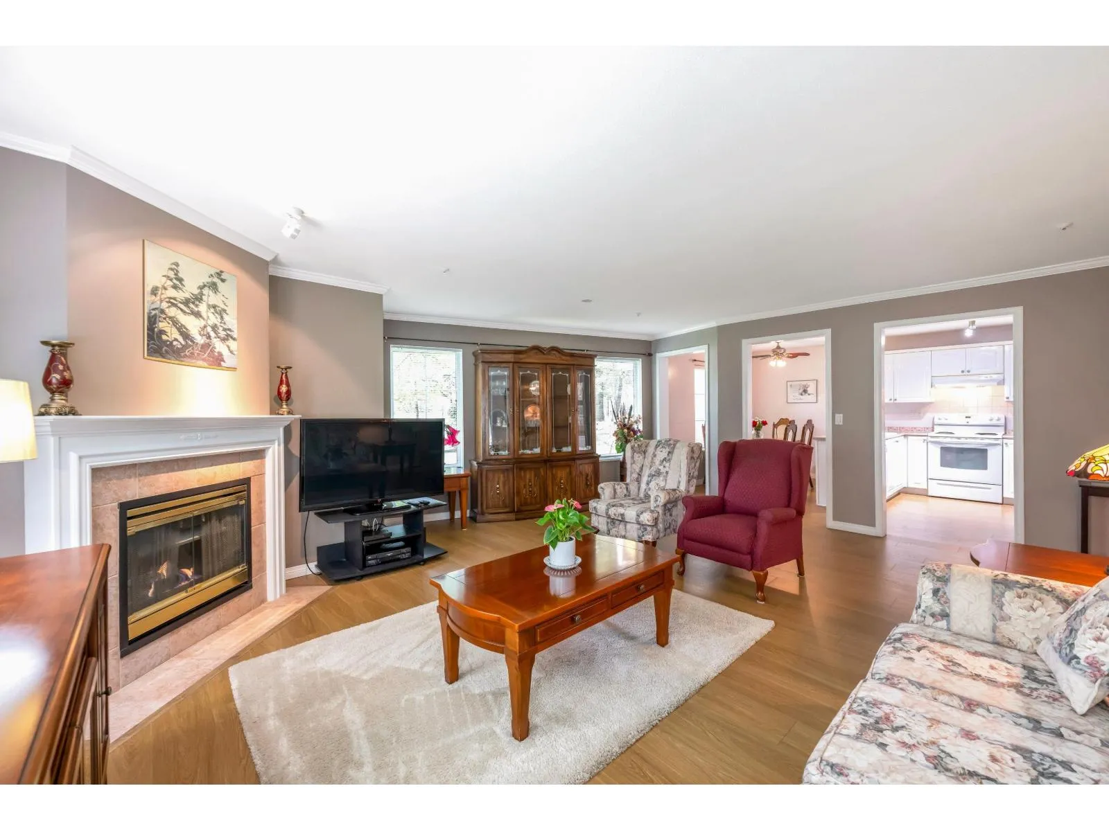 Enjoy this immaculate 1,367 sqft rancher like, WHEELCHAIR ACCESSIBLE Strawberry Hill condo. This SOUTH FACING 2 bedroom, 2 bath, freshly painted, centrally located condo is move-in ready. It features a large airy living room w/ crown moulding, big windows & plenty of natural light, in floor radiant heat & 2 natural gas fireplaces. The kitchen is equipped w/ ample counter & cupboard space, white appliances & adjacent nook. The primary bedroom is large enough for all your furniture & the ensuite is a fully walk in bathroom & shower. The walkout garden patio extends your living space, perfect for your green thumb. For your convenience, it has its own in suite laundry, storage & TWO PARKING STALLS. Enjoy the proximity to schools, daycare, transit, library, shopping, temples, Hwy 10 & Bridges. (id:27476)