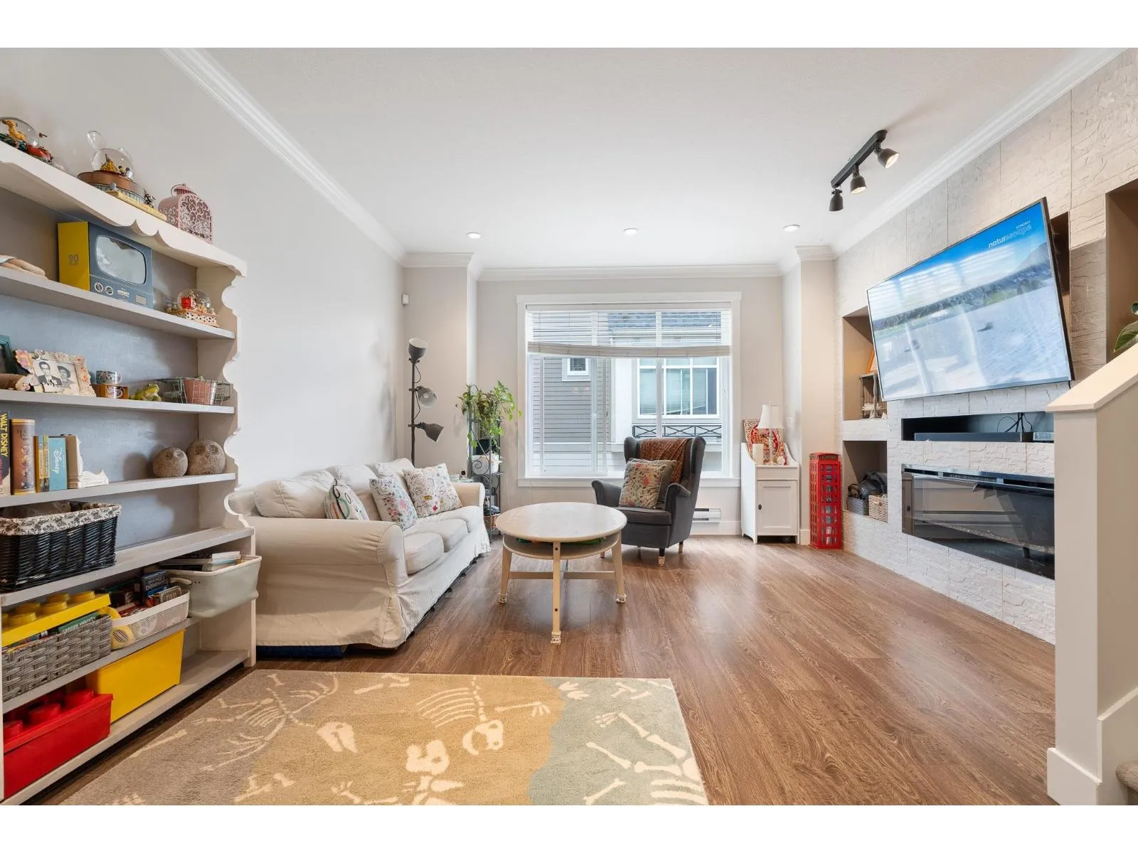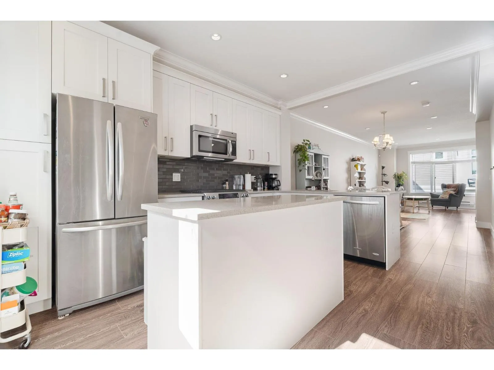 Rarely offered 3-Bed, 3-Bath Townhome in the Highly Desirable ZEN Community by Award-Winning Zenterra Homes. This beautifully maintained residence features an open-concept main floor with a bright, white kitchen equipped with stainless steel appliances, a gas range, and sleek quartz countertops. The spacious living room boasts custom open shelving, a cozy fireplace, and a convenient powder room on the main level. Upstairs offers three spacious bedrooms and two full bathrooms, including a master bedroom with its own private ensuite, perfect for the whole family. Ideally located near parks, shopping, and transit, with Katzie Elementary and Clayton Secondary in the school catchment. Don't miss this one! (id:27476)