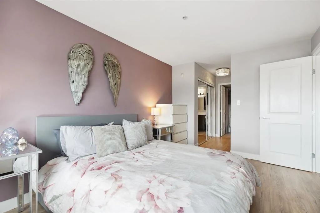 BRIGHT 1 bedroom & den unit has just hit the market and you are not going to want to miss it. Located in the ideal Morgan Crossing area this home offers a superb layout and has been well maintained over the years. Facing north, offering a stunning backdrop of the mountains & is on the quiet side of the building, this is the place you want to call home. This home has undergone an extensive, stunning bathroom renovation with new subway tiles, flooring, vanity/sink and shower head. Along with new laminate flooring throughout & a full size Washer/Dryer & Dishwasher. Enjoy the large eating bar, open floor plan, generous sized windows, ample closet space, granite countertops and upgrades. Your new home is conveniently situated among all "The Shops" that Morgan Crossing offers! (id:27476)