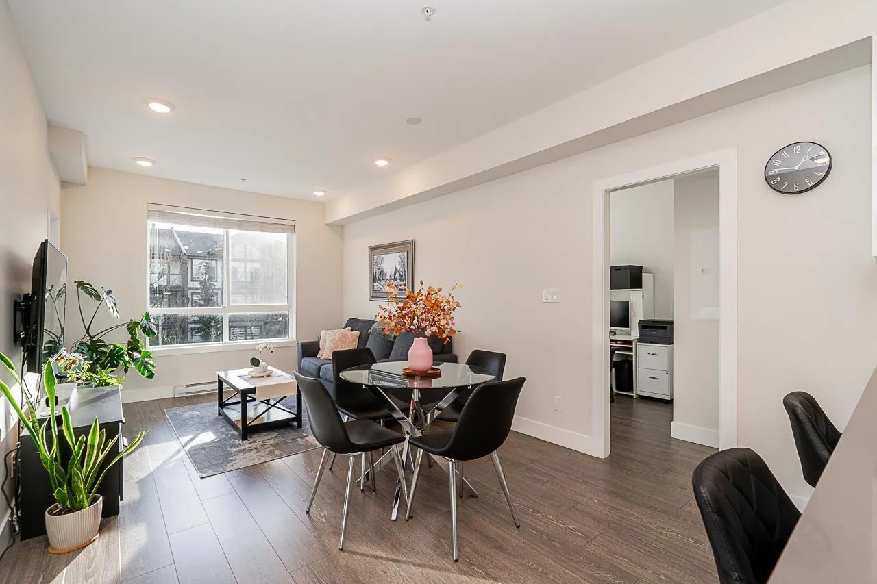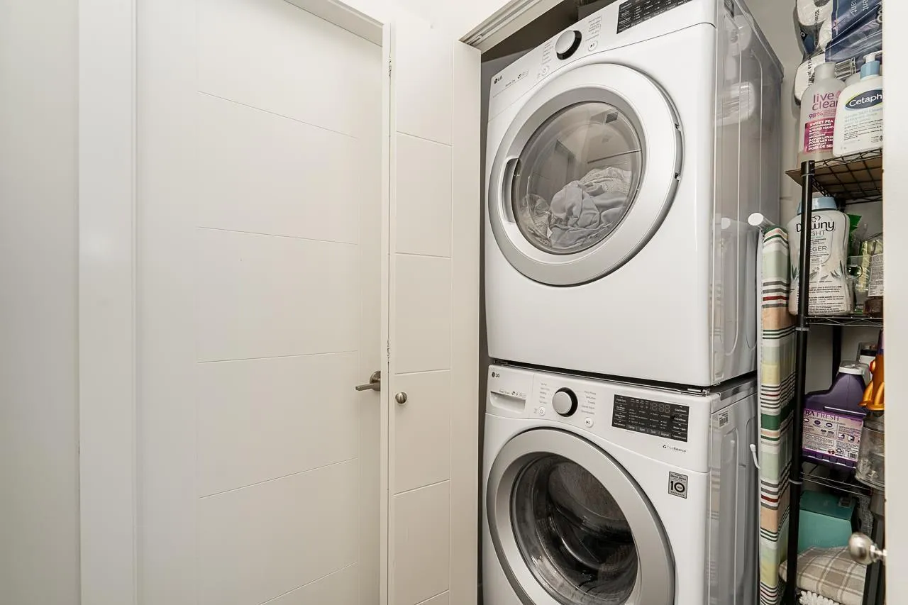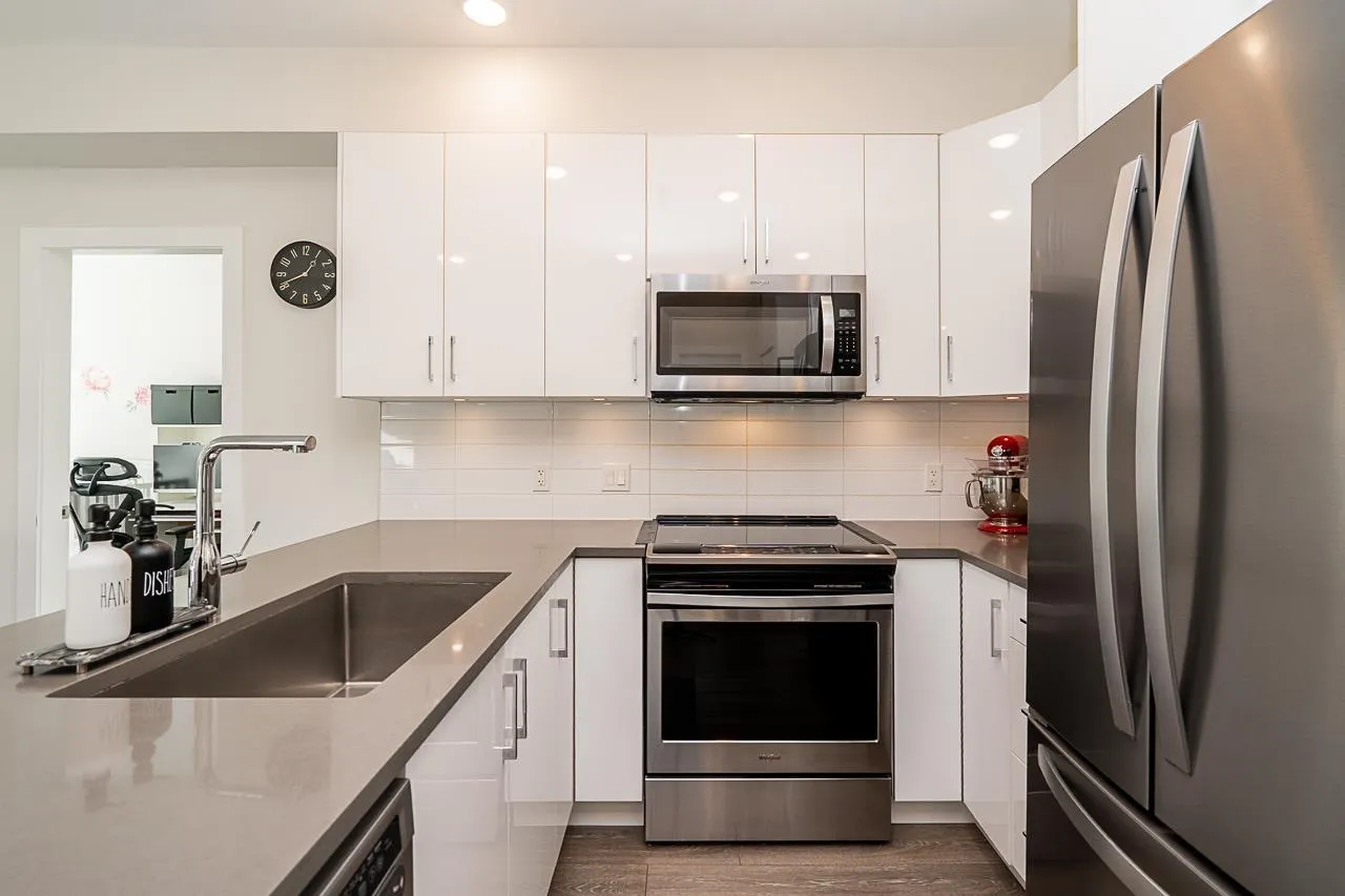 "THE GUILDFORD" Welcome to this immaculate 2 Bedroom, 1 Bath upper-floor corner unit in the heart of Guildford! Boasting a desirable South-facing exposure, this home is flooded with natural light through large windows. Well-kept and move-in ready, it features laminate flooring throughout, an in-suite washer and dryer, and a wonderful kitchen with quartz countertops and stainless steel appliances. A rare bonus: this home includes 2 side-by-side parking stalls and a storage locker. Location is everything! You are steps from Guildford Town Center, T&T, restaurants, and transit, with easy Highway 1 access. The building offers great amenities, including a social room with a pool table and party area. Don't miss this gem! Open House Dec 6 & 7, between 1pm - 3pm! (id:27476)