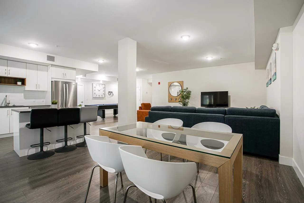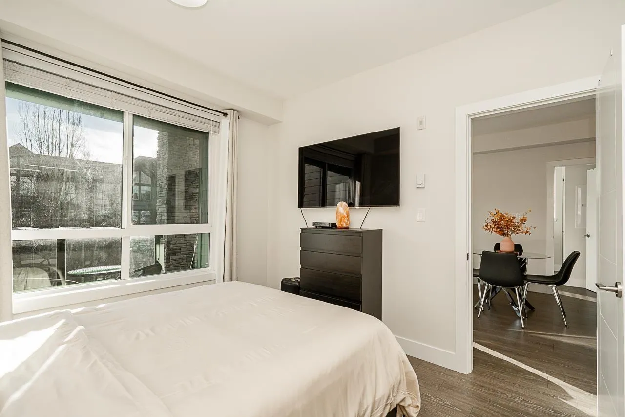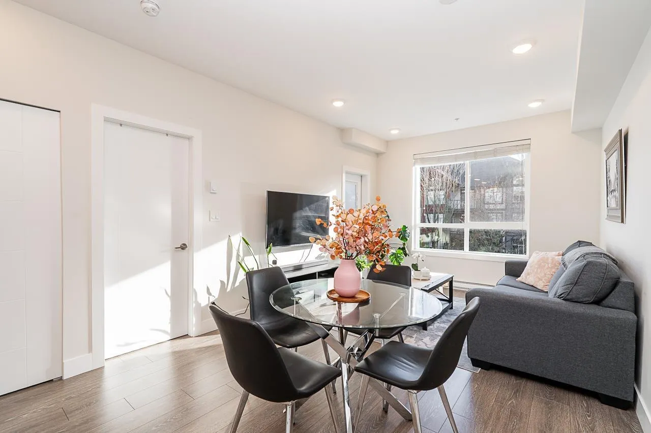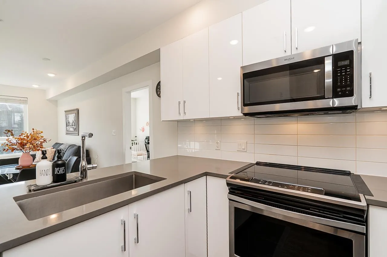 "THE GUILDFORD" Welcome to this immaculate 2 Bedroom, 1 Bath upper-floor corner unit in the heart of Guildford! Boasting a desirable South-facing exposure, this home is flooded with natural light through large windows. Well-kept and move-in ready, it features laminate flooring throughout, an in-suite washer and dryer, and a wonderful kitchen with quartz countertops and stainless steel appliances. A rare bonus: this home includes 2 side-by-side parking stalls and a storage locker. Location is everything! You are steps from Guildford Town Center, T&T, restaurants, and transit, with easy Highway 1 access. The building offers great amenities, including a social room with a pool table and party area. Don't miss this gem! Open House Dec 6 & 7, between 1pm - 3pm! (id:27476)