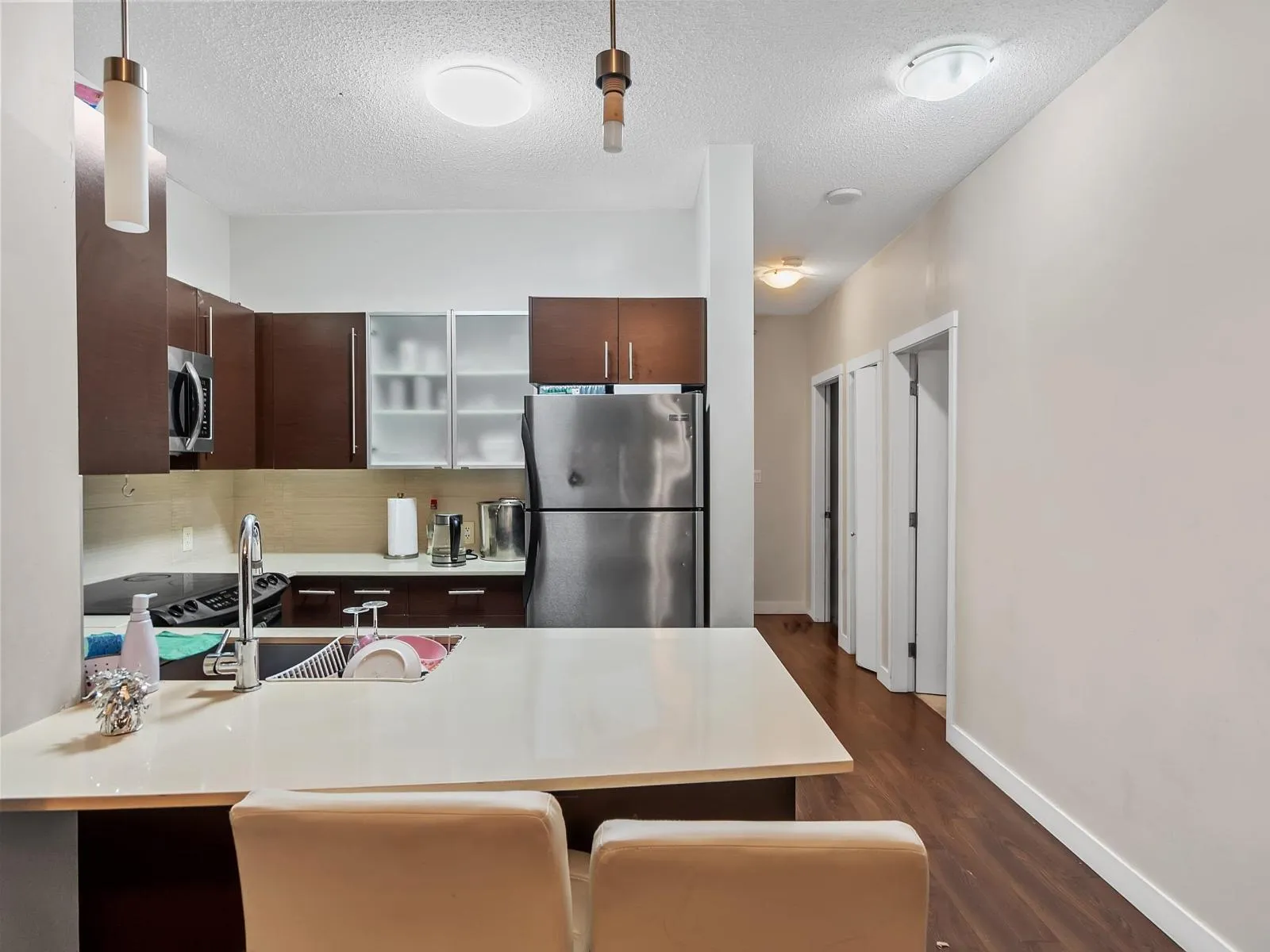 Beautiful 2 bed 2 bath condo in the heart of Central Surrey, featuring 9' floor-to-ceiling windows that fill the home with natural light and showcase impressive city and mountain views. Enjoy a spacious layout with granite countertops, premium stainless steel appliances and warm, modern living spaces. Both bedrooms offer great size and flexibility for families or roommates. The building includes a fully equipped fitness centre and a large party room with a full kitchen. Just minutes from SFU Surrey, Surrey Central SkyTrain Station and Central City Shopping Centre, this home delivers the perfect blend of comfort, convenience and lifestyle in one of Surrey's most connected locations. (id:27476)