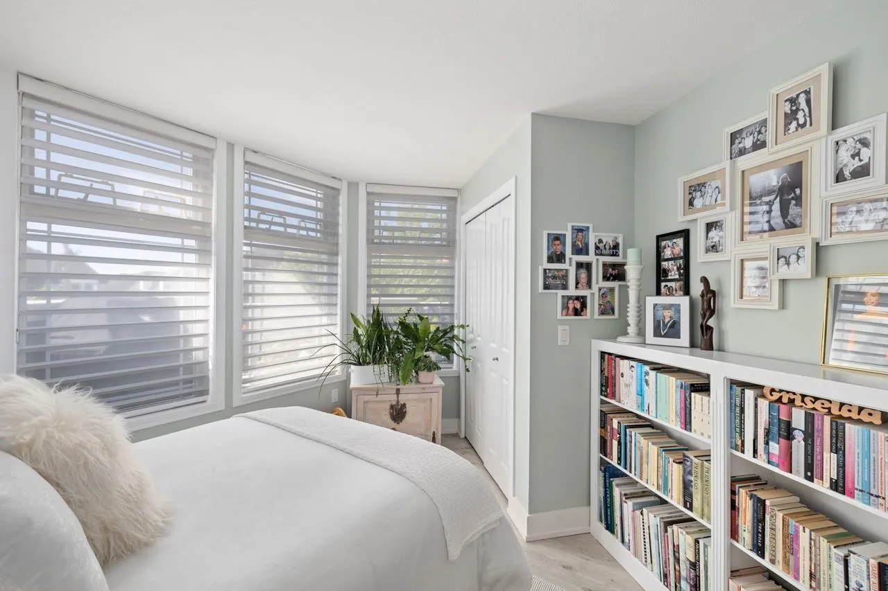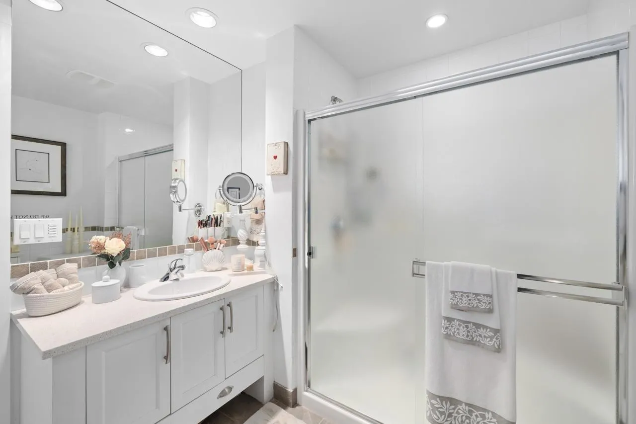 Welcome to Ocean Bay Villas! This sunny corner unit offers soaring ceilings and a bright eat-in kitchen with white cabinets, upgraded granite countertops and tile backsplash, flowing seamlessly into the open living and dining area. This upper unit is a designers dream home featuring with new flooring, paint and modern Hunter Douglas window coverings, it's turn key and ready for you to move in! Step out to your private, massive wrap around terrace and enjoy fantastic building amenities including a gym, guest suite, workshop and games lounge. Just minutes (seriously, like 2 blocks) from restaurants, Semiahmoo Mall, transit and a short walk to White Rock Beach. Includes 1 secure underground parking stall and 1 storage locker. Schedule your private showing today! (id:27476)