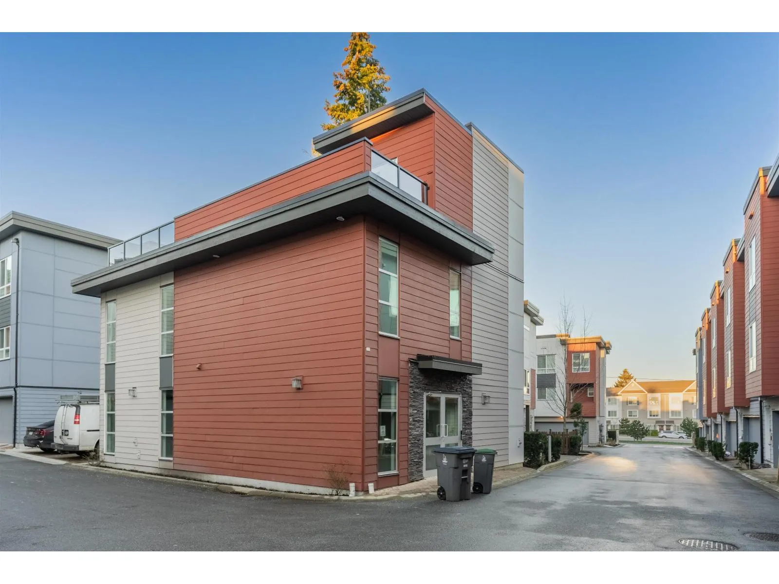 A premier townhome complex by Mortise Group. This 3-level townhouse features 4 Bedrooms + 4 Bathrooms, contemporary design elements including quartz counters, Frigidaire S/S appliances, gas range, fireplace, wide-plank laminate flooring & airy 9' ceilings. Home is equipped with A/C, built-in Control4 Bluetooth speakers on all floors & central vacuum. Covered patio w/ gas hook-up off the kitchen area is perfect for BBQing + entertaining. Double garage offers epoxy flooring + bonus storage room. EXCEPTIONAL PRIVACY! No neighbours front or back! Lovely fenced backyard. Central location, close to grocery stores, schools, parks, restaurants, & more. Easy access to king George Blvd. Highway 99 & Canada/USA border. (id:27476)