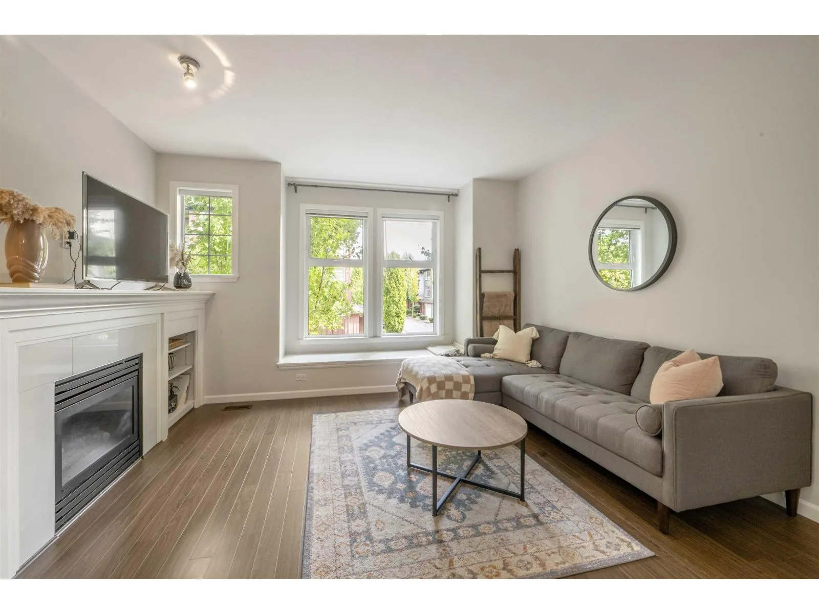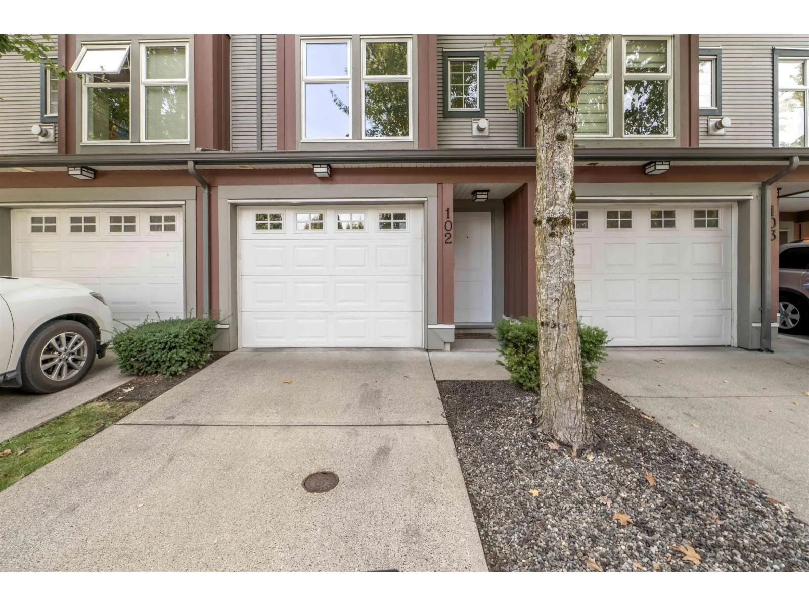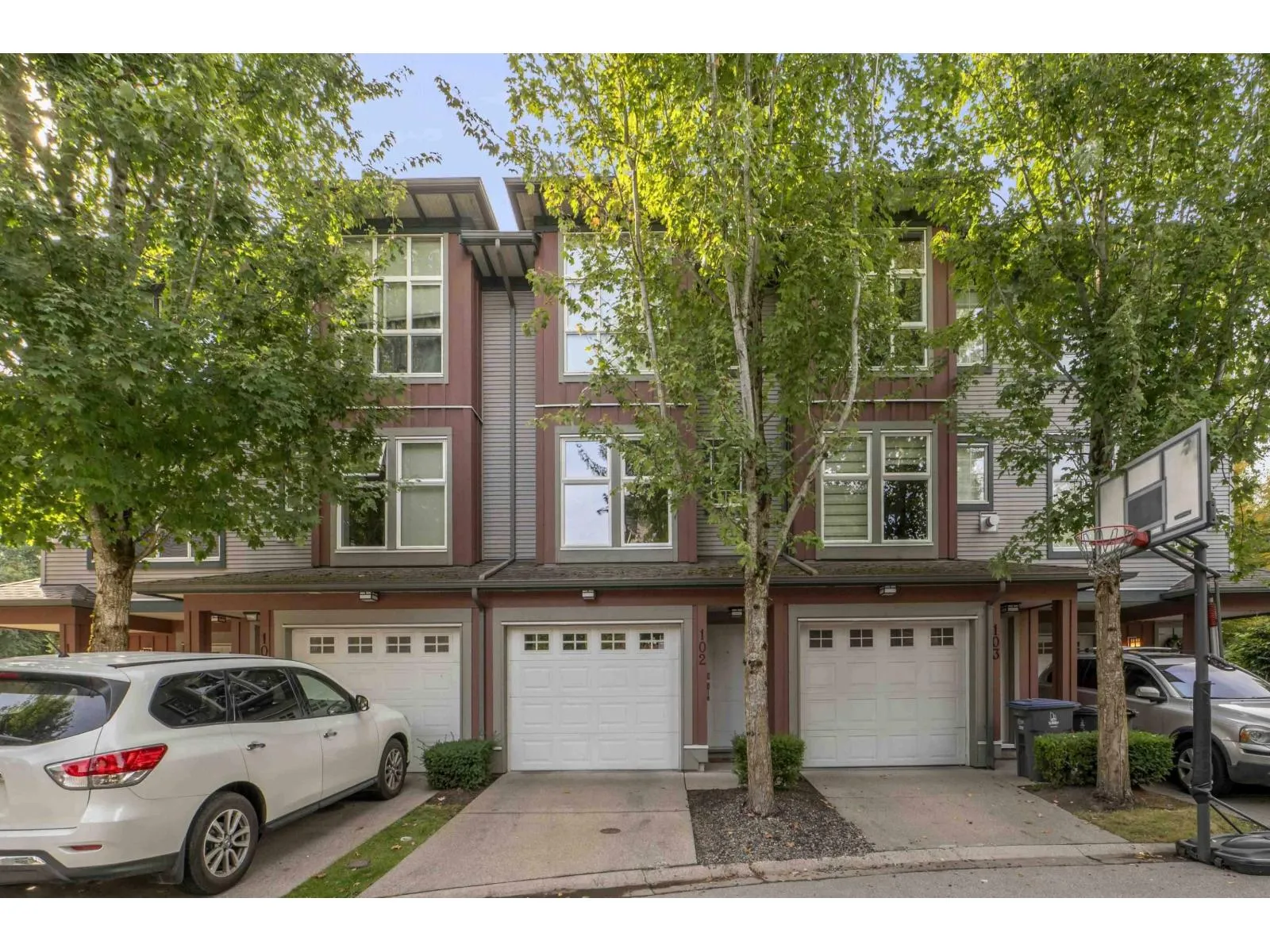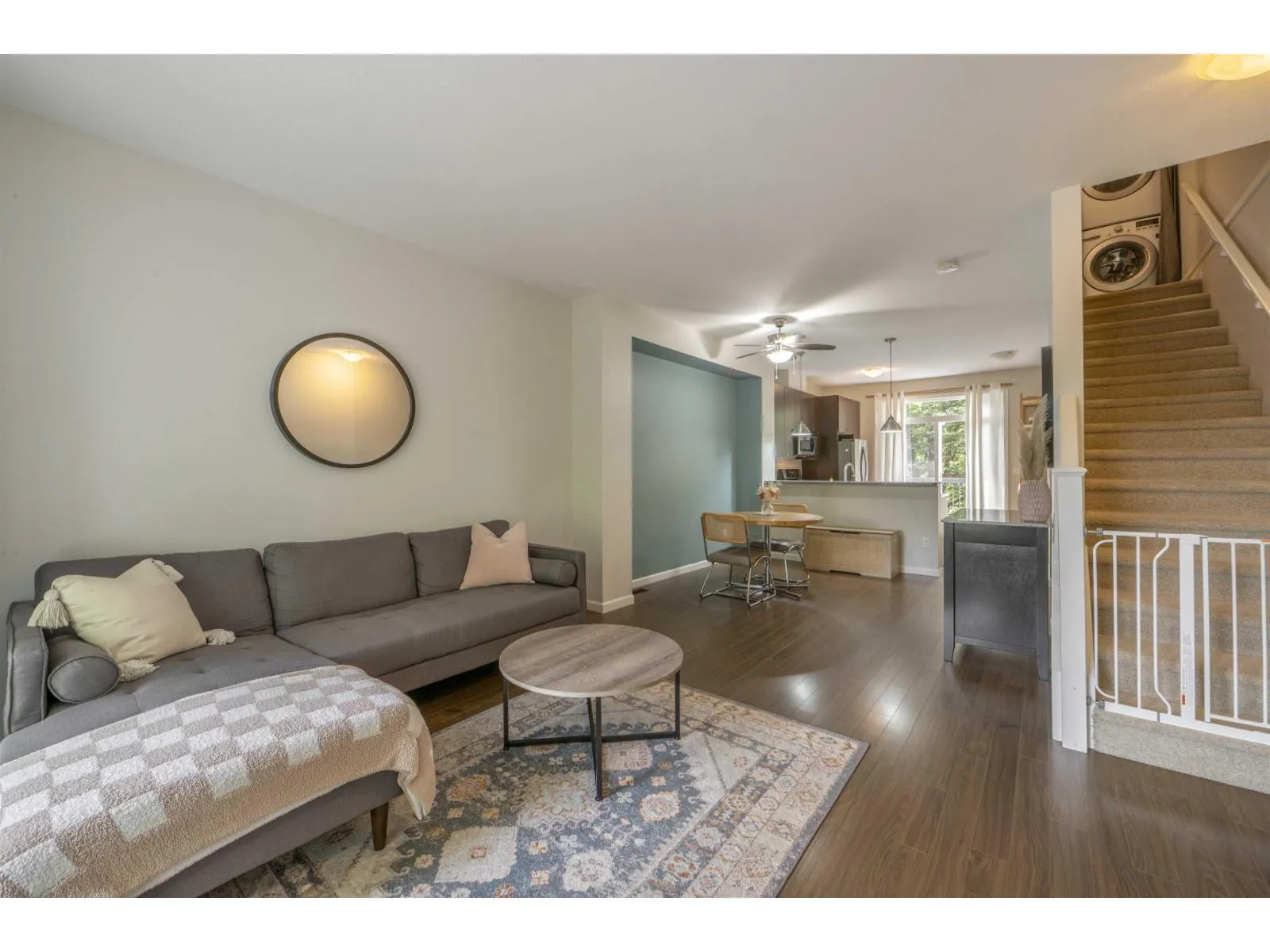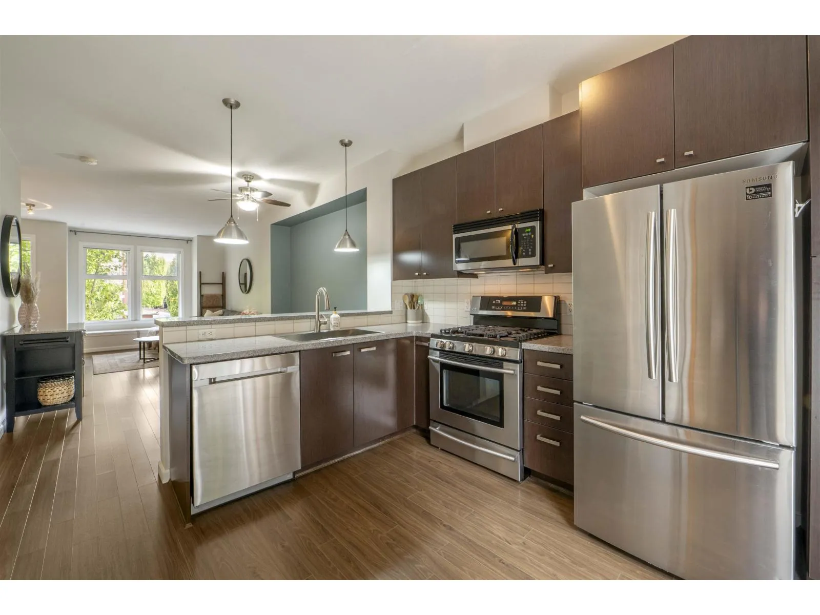 Welcome to Compass! This over 1200sf 2 bed, 2.5 bath townhome is in the perfect location backing onto a greenbelt/park-like setting. Open floor plan, 9' ceiling on main with spacious kitchen boasting S/S appliances incl. gas stove, granite counters & large balcony facing green space. Oversized windows flood the home with natural light & the gas fireplace compliment the living & dining room areas + a convenient powder room also on the main. Upstairs features a spacious primary bedroom w/4 piece ensuite + 2nd large bedroom on the opposite side & another full bathroom. Enjoy a coffee on your patio & fenced backyard off the ground floor. Great location within walking distance to shopping, restaurants, schools, parks, & transit (future skytrain). (id:27476)