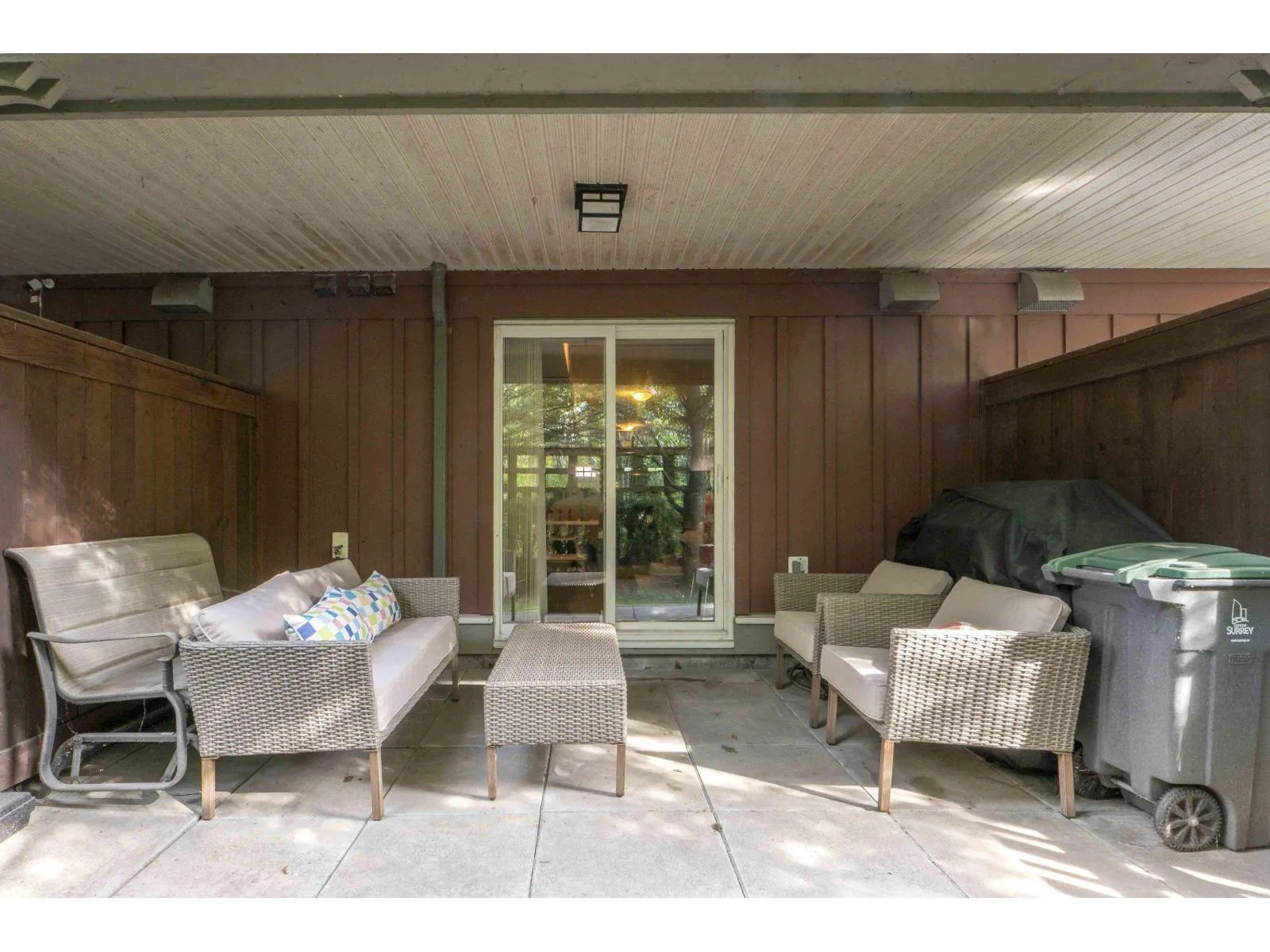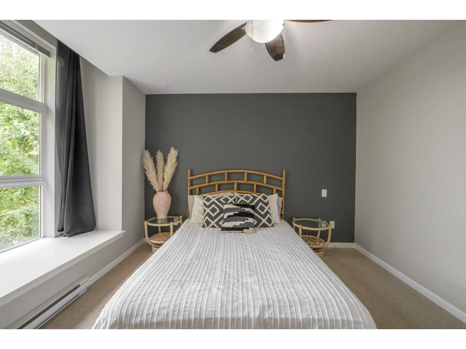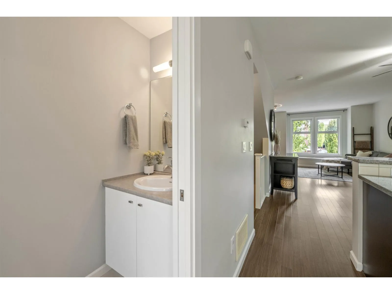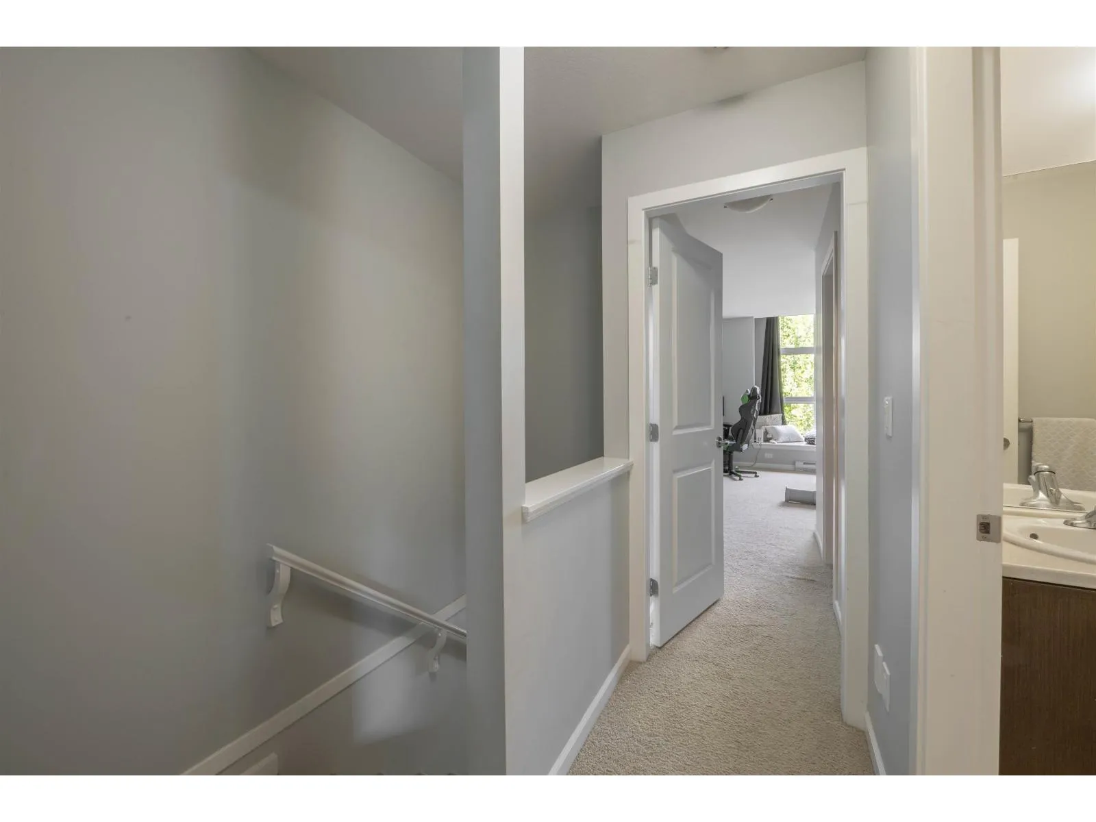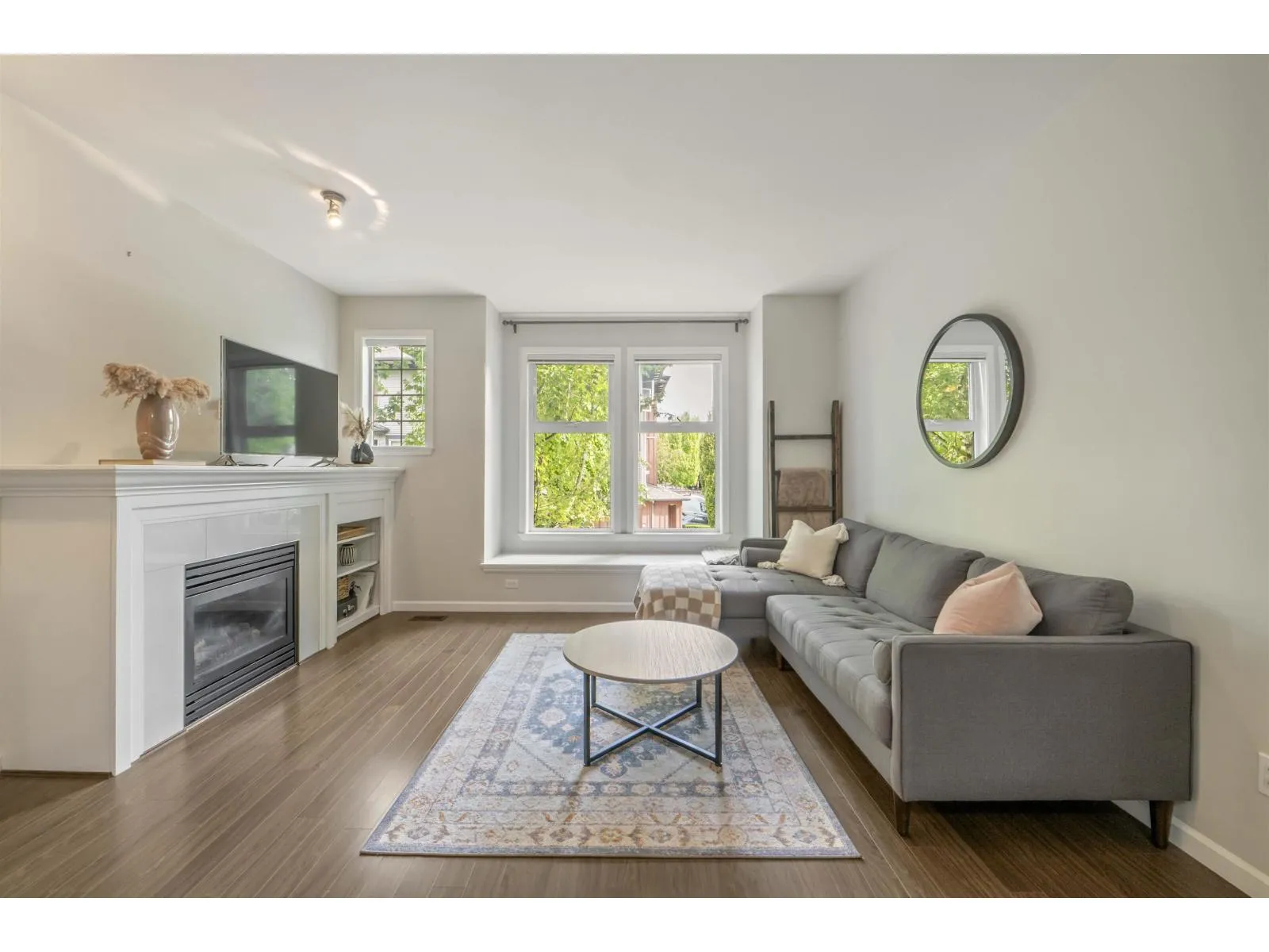 Welcome to Compass! This over 1200sf 2 bed, 2.5 bath townhome is in the perfect location backing onto a greenbelt/park-like setting. Open floor plan, 9' ceiling on main with spacious kitchen boasting S/S appliances incl. gas stove, granite counters & large balcony facing green space. Oversized windows flood the home with natural light & the gas fireplace compliment the living & dining room areas + a convenient powder room also on the main. Upstairs features a spacious primary bedroom w/4 piece ensuite + 2nd large bedroom on the opposite side & another full bathroom. Enjoy a coffee on your patio & fenced backyard off the ground floor. Great location within walking distance to shopping, restaurants, schools, parks, & transit (future skytrain). (id:27476)