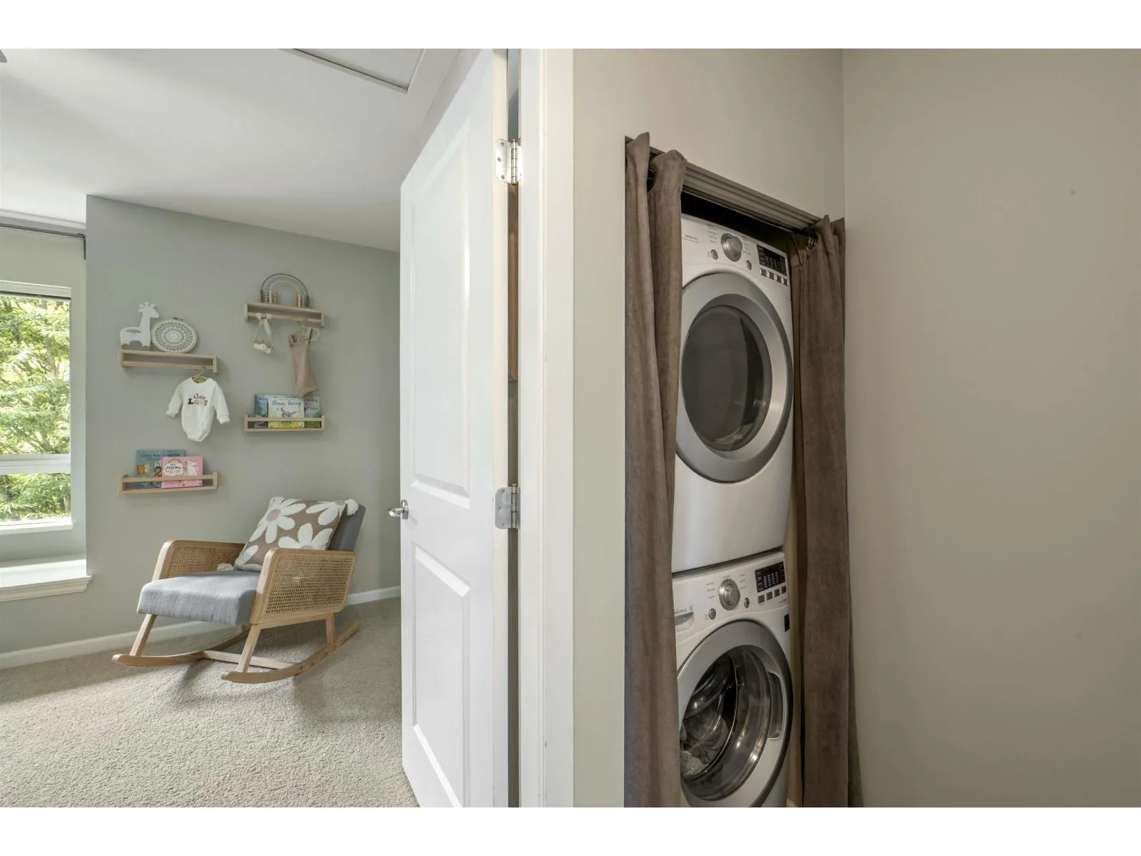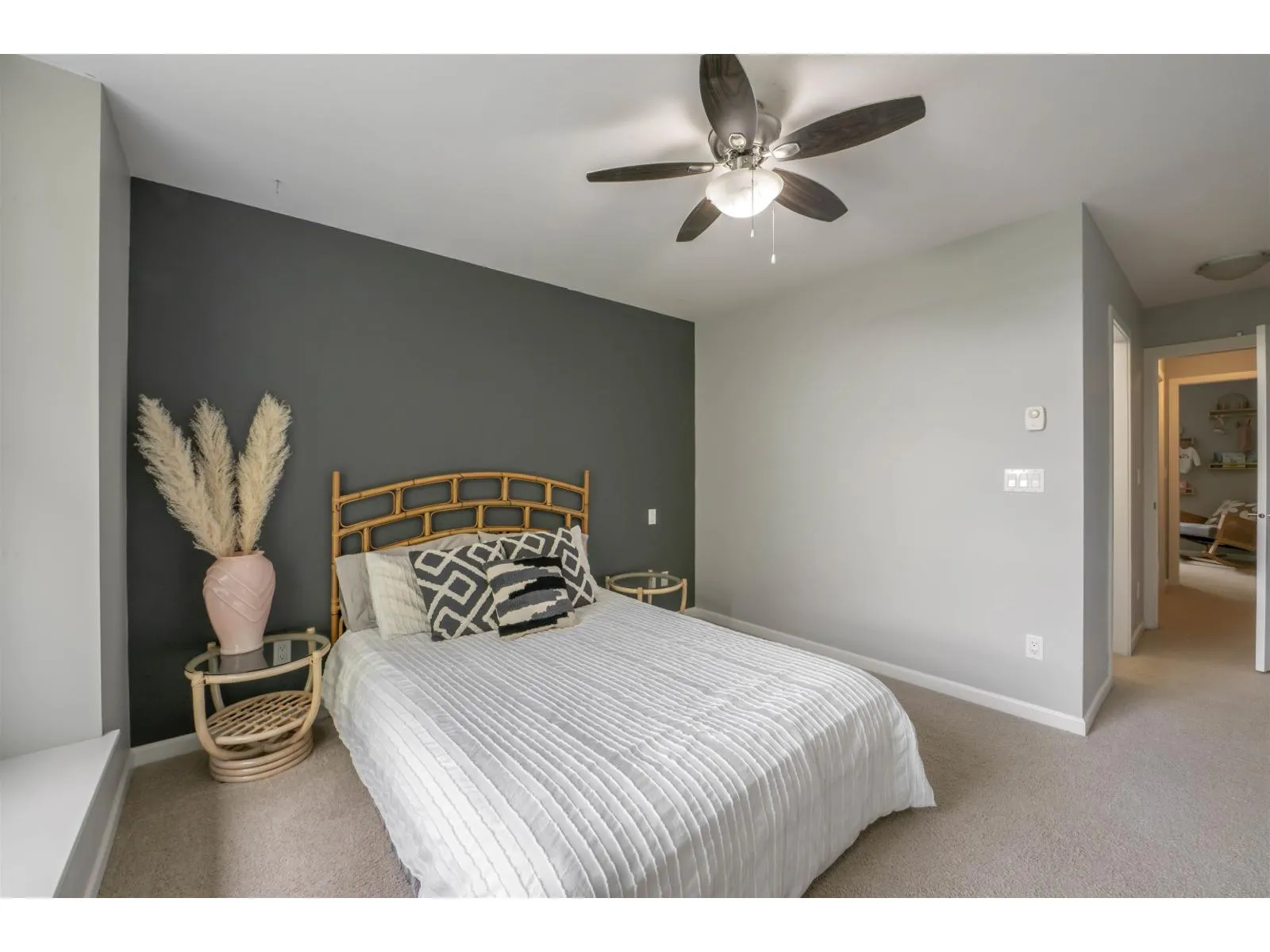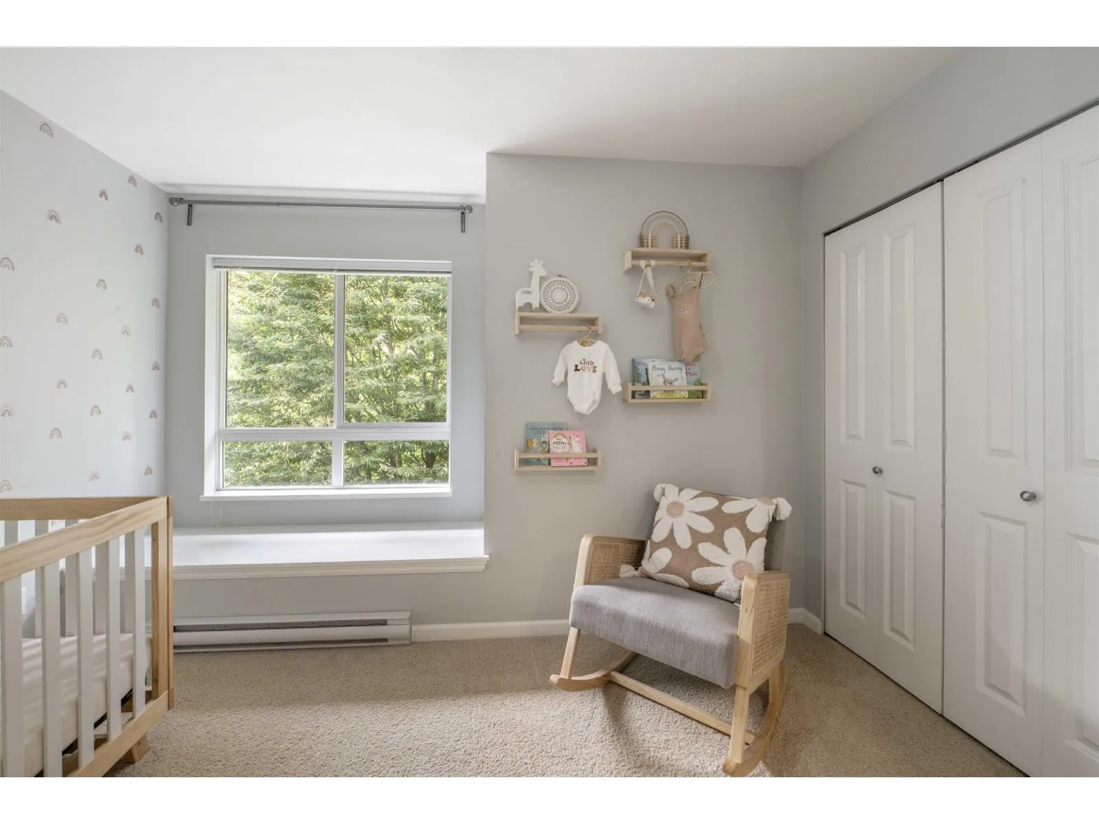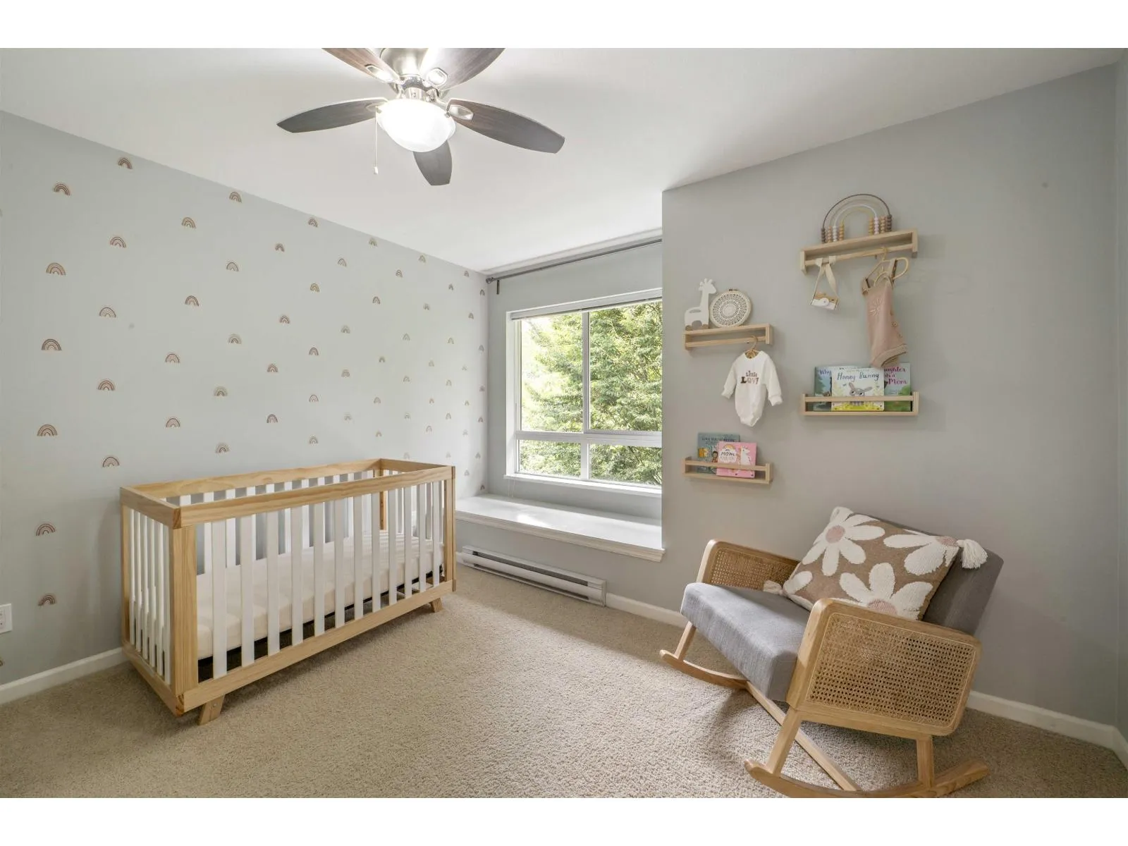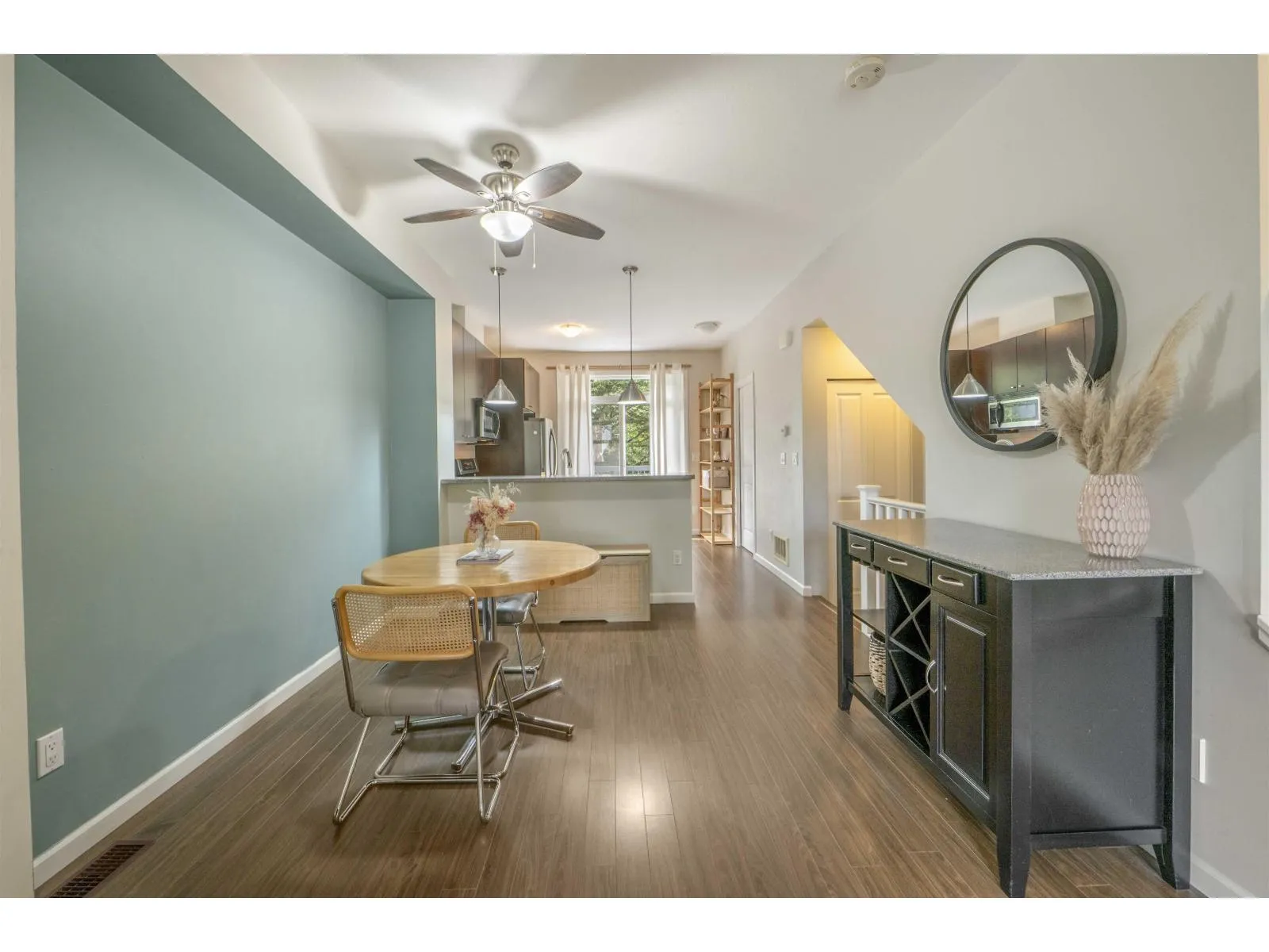 Welcome to Compass! This over 1200sf 2 bed, 2.5 bath townhome is in the perfect location backing onto a greenbelt/park-like setting. Open floor plan, 9' ceiling on main with spacious kitchen boasting S/S appliances incl. gas stove, granite counters & large balcony facing green space. Oversized windows flood the home with natural light & the gas fireplace compliment the living & dining room areas + a convenient powder room also on the main. Upstairs features a spacious primary bedroom w/4 piece ensuite + 2nd large bedroom on the opposite side & another full bathroom. Enjoy a coffee on your patio & fenced backyard off the ground floor. Great location within walking distance to shopping, restaurants, schools, parks, & transit (future skytrain). (id:27476)