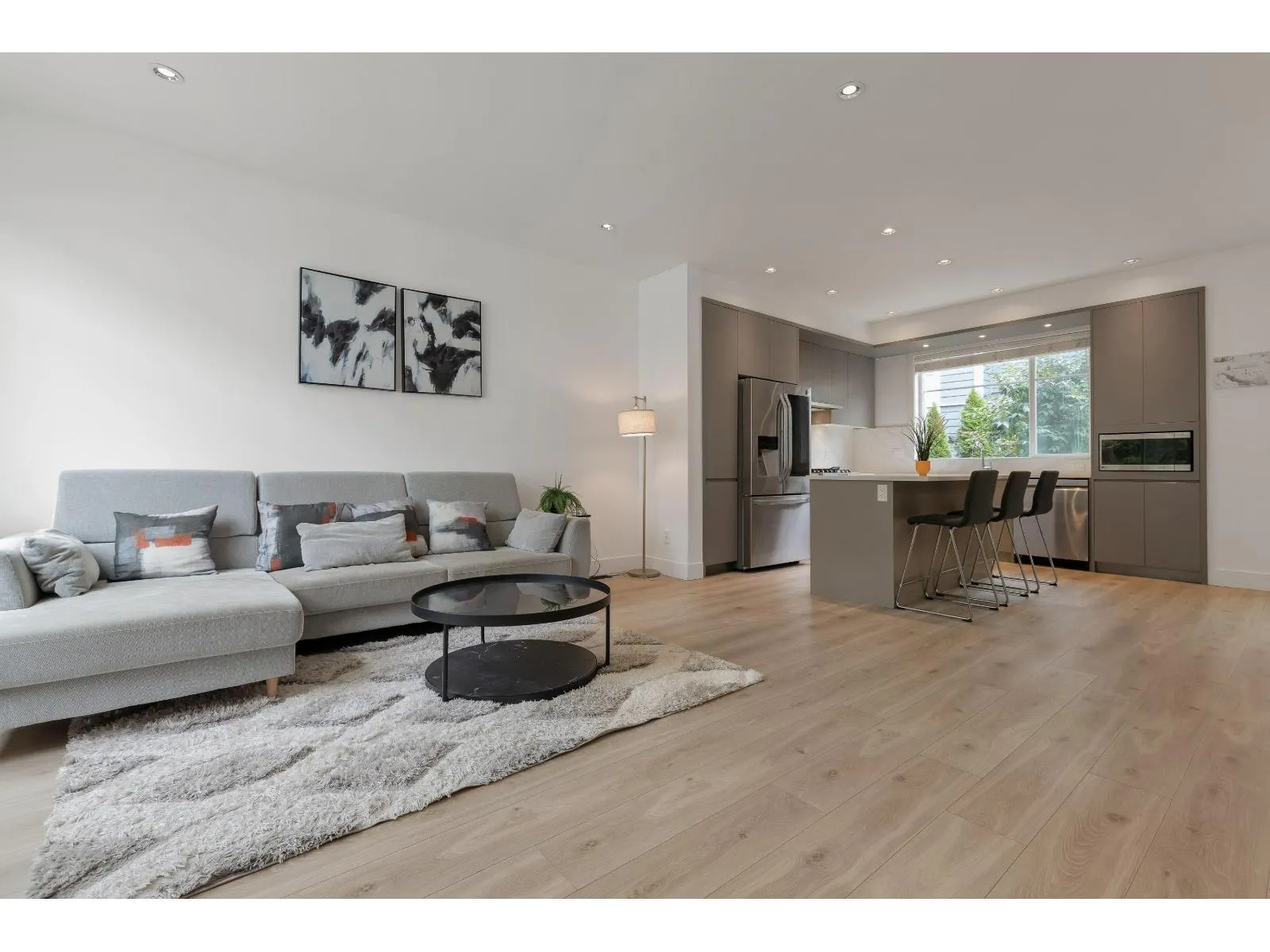 Welcome to Carson! This modern 3 bed, 3 bath townhome offers 1,406 sq.ft. of open-concept living with a bright living and dining area. The chef-inspired kitchen features a gas range, LG SmartThinQ appliances, designer lighting, and a large island-perfect for entertaining. Upstairs, enjoy spacious bedrooms with high ceilings, creating an airy and comfortable retreat. Step outside to a private landscaped backyard, and enjoy added comforts such as central A/C, forced-air heating, laminate flooring, and a side-by-side double garage with epoxy flooring. Located in the heart of Grandview, just steps to schools, parks, the Aquatic Centre, shopping, dining, and transit (id:27476)
