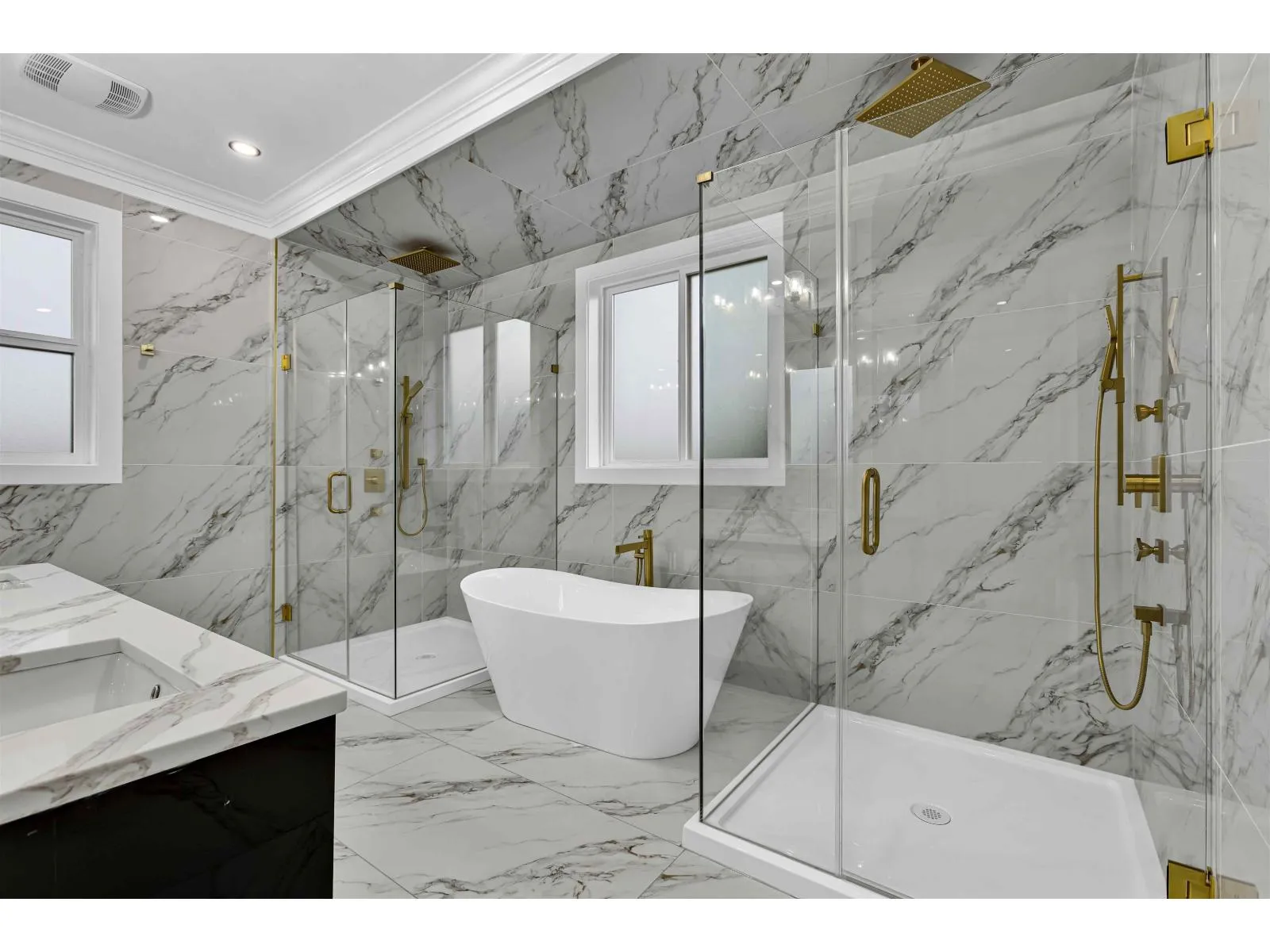Custom-built home offering 8 bedrooms plus a nook and 8 bathrooms with an excellent family-oriented layout, ideal for large or multi-generational households. The main floor features 12-foot ceilings in the living and dining areas, a full bedroom with ensuite, and potential to add a kitchen with separate entry for a third suite. The Basement offers a legal two-bedroom suite, and an additional unauthorized one-bedroom suite providing strong mortgage help. The basement also has a theatre room, wet bar,. The family room opens to a patio and connects to a spacious spice kitchen. Upstairs includes four bedrooms with two primary suites and a Jack-and-Jill bathroom. Open House: Sunday, December 28 | 2-4 PM (id:27476)
