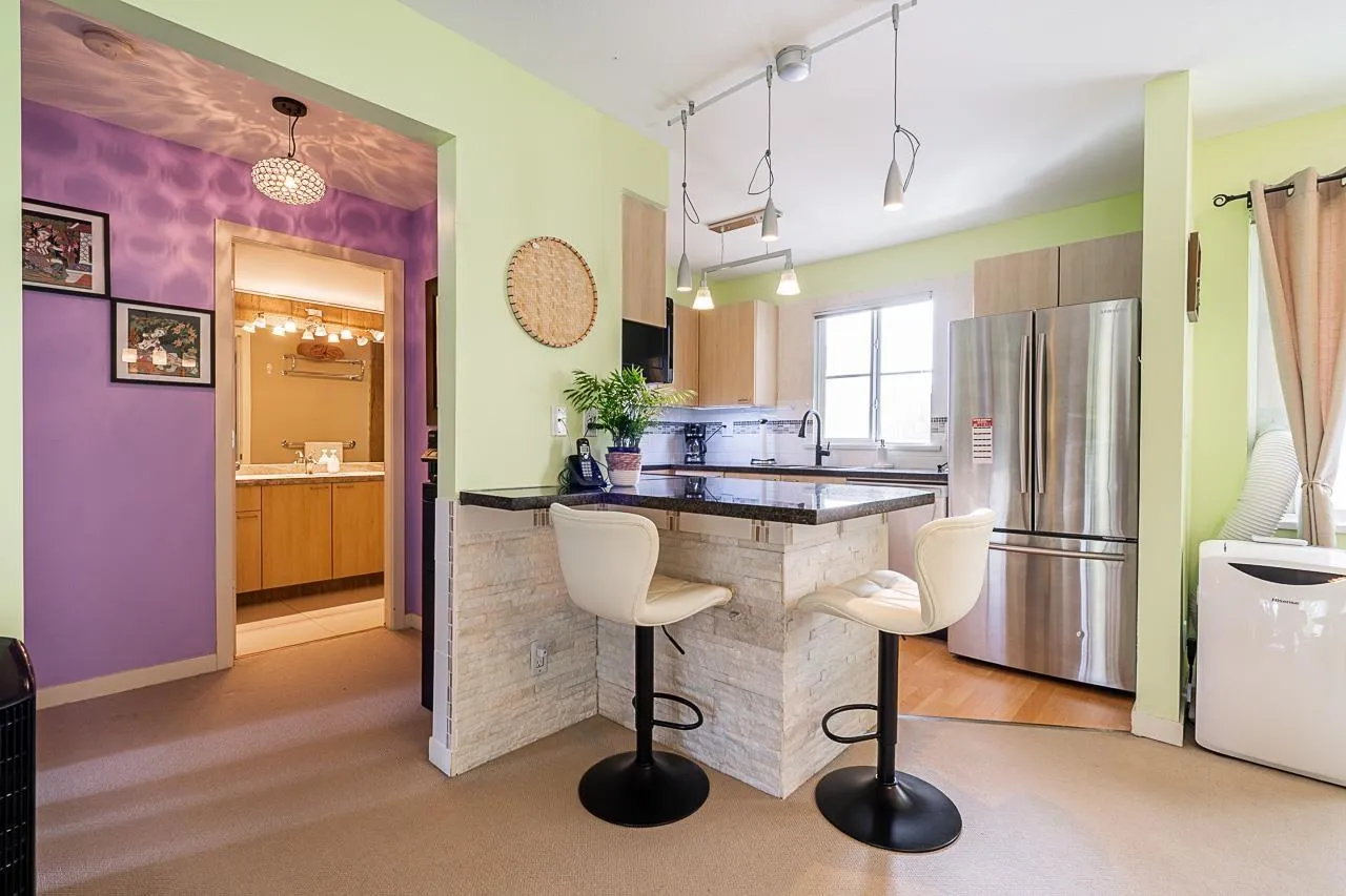 THE TAMARON. HUGE 1 BEDROOM CORNER UNIT W/ TONS OF RECENT UPDATES & NATURAL LIGHT! The OPEN kitchen, dining & living room are perfect. The bedroom is LARGE & can fit a king bed w/end tables. Recent renos include NEW GRANITE COUNTERTOPS IN KITCHEN & BATHROOM, NEW SINK & FAUCET + BACKSPLASH IN KITCHEN, EXTENDED COUNTERSPACE for breakfast chairs, NEW STONE for counter area, LIGHT FXTURES, SS APPLIANCES, NEW BATH FIXTURES & SHOWER TILES. The entry has BUILT IN ORGANIZER UNIT perfect for shoes & everyday items. The balcony is EXTREMELY PRIVATE W/NO UNIT FACING DIRECTLY TO THIS UNIT. The LOCATION IS CLOSE to all amenities, schools and transit!. Unit has in suite laundry, 1 parking stall & 1 storage unit. Strata fee $545.00 incls heat, hot water, water & gas (id:27476)