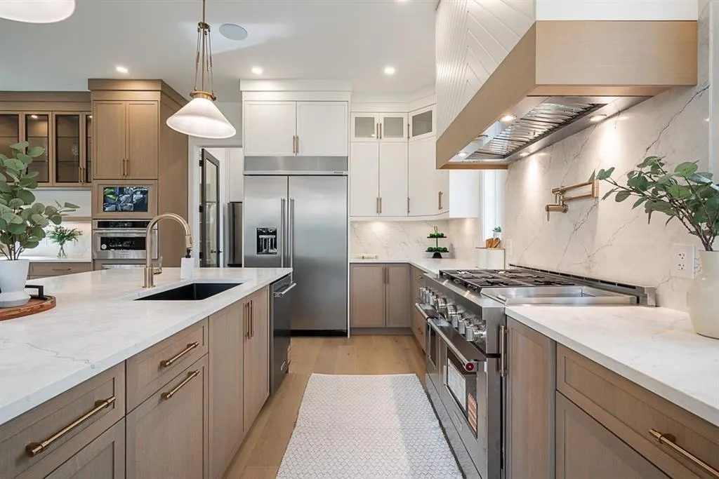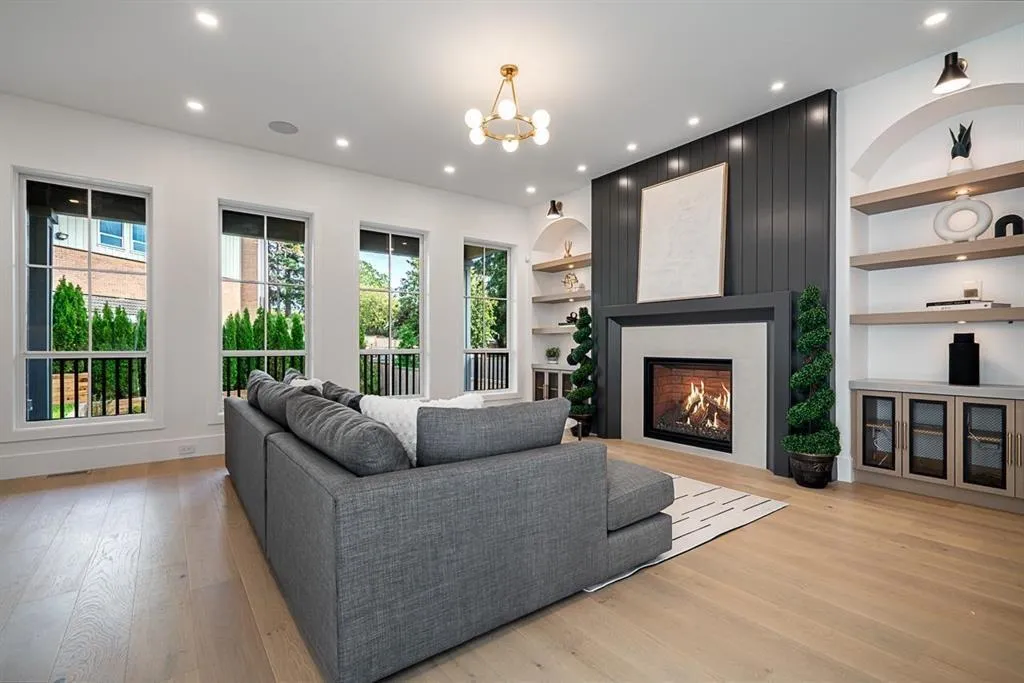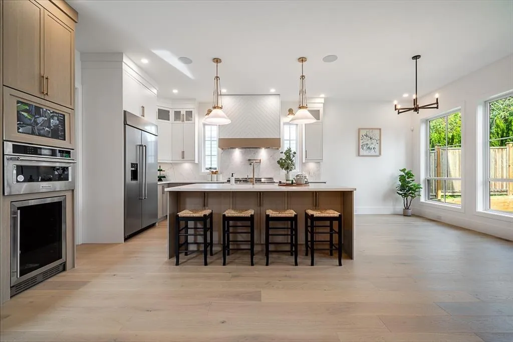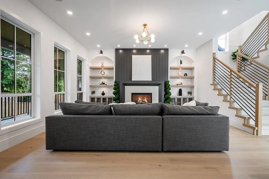 This breathtaking designer home blends Craftsman architecture with Farmhouse elegance, offering 5,560 sq ft of luxurious living in sought-after West Cloverdale. Bright, airy interiors feature expansive windows with automatic blinds, exquisite millwork, and premium flooring. The showstopping great room centers around a stunning fireplace and a custom two-tone white oak kitchen with top-tier appliances, a spice kitchen, and walk-in pantry. Upstairs boasts 4 vaulted bedrooms including a dreamy primary suite, plus a main-level bedroom. The lower level features a 2-bed legal suite, media room with wet bar, 3-pc bath, storage, and mudroom. Enjoy central A/C, smart home features, and the 2/5/10 New Home Warranty-a perfect blend of sophistication, comfort, and functionality. (id:27476)