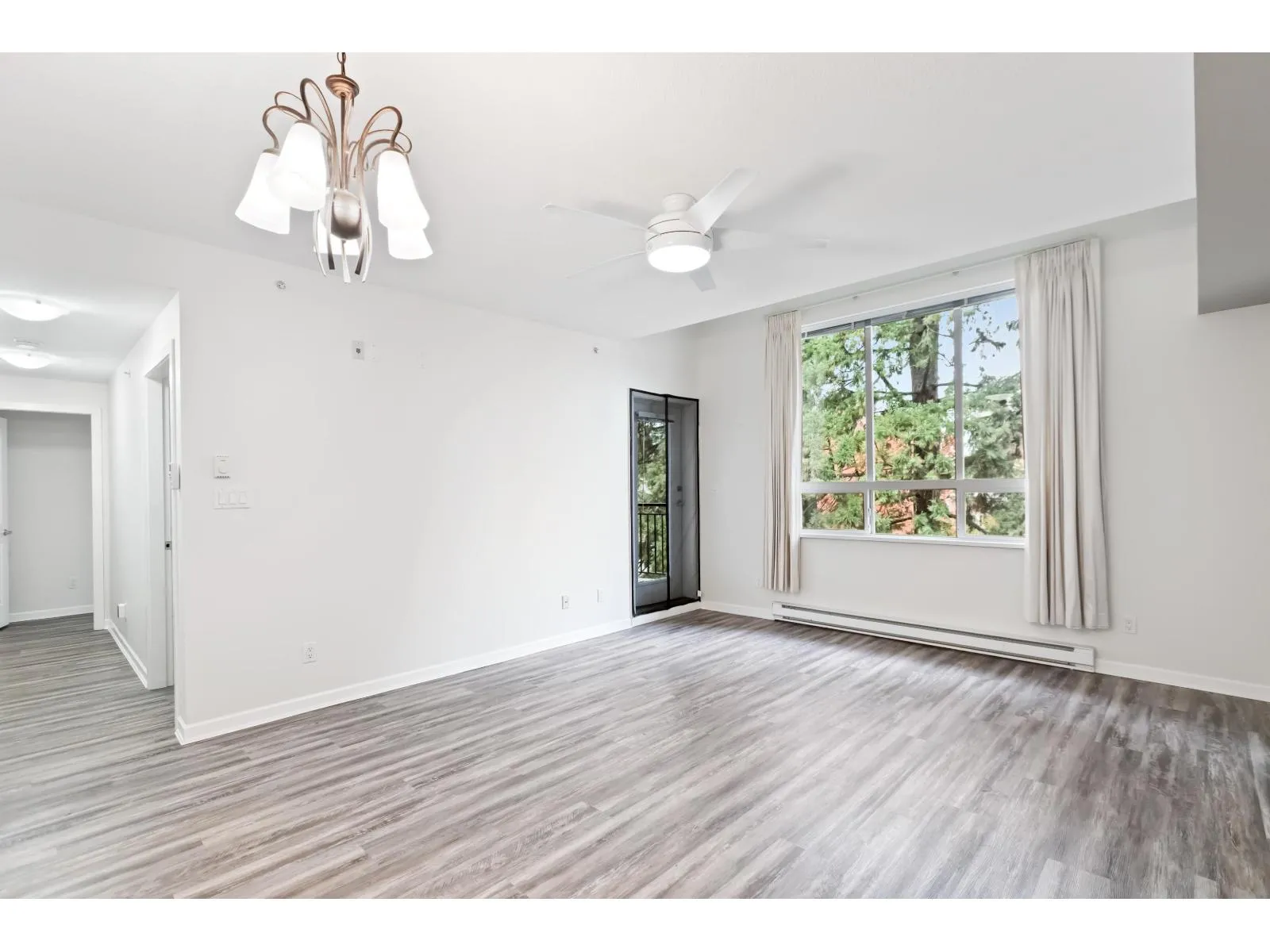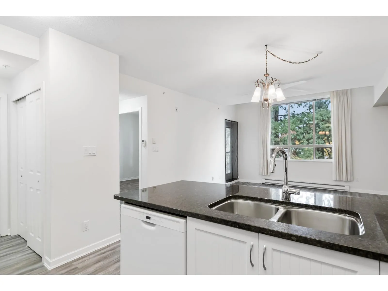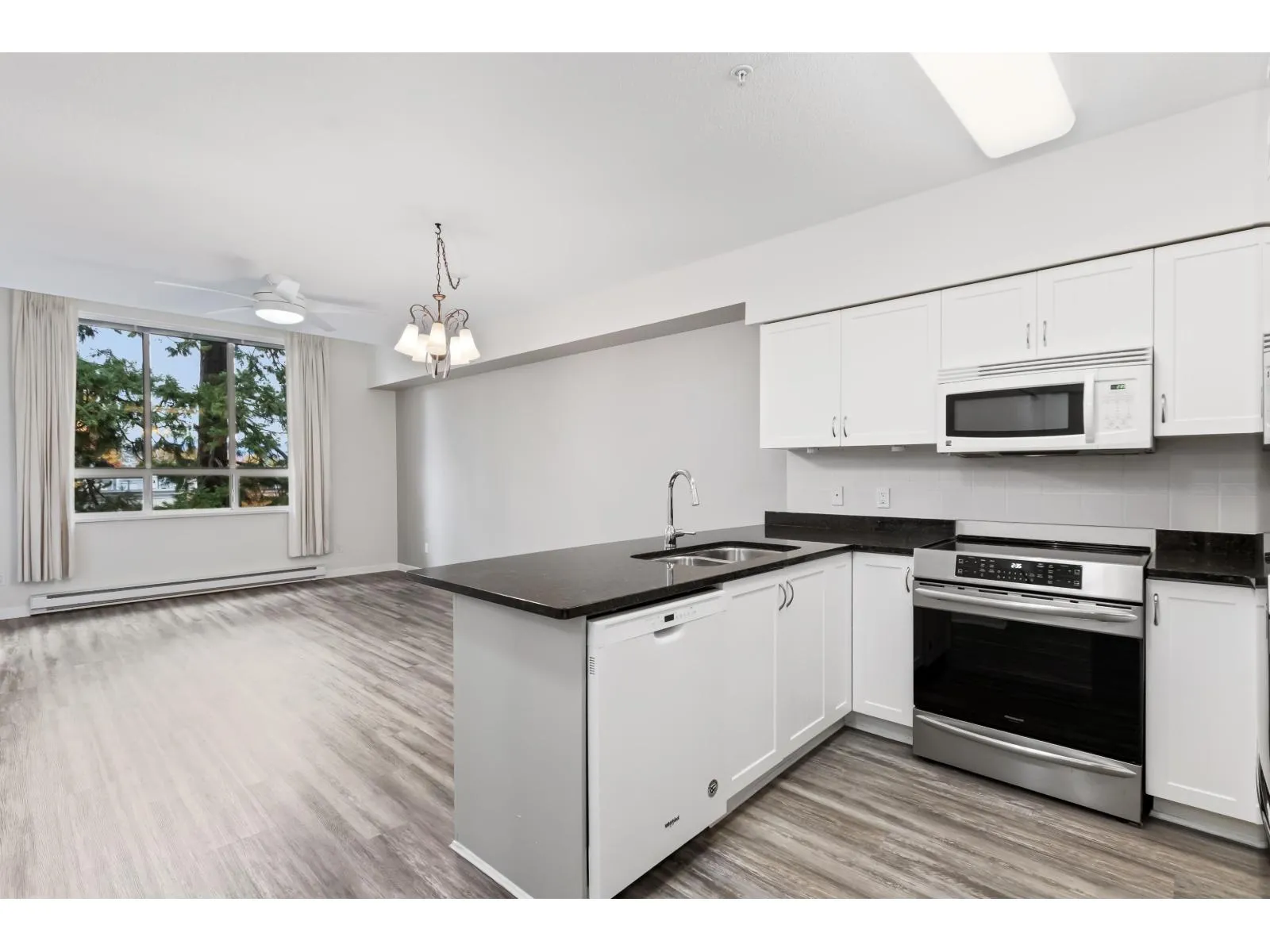Stunning renovated Top Floor home in Fleetwood Gardens a 55+ centrally located building.2 bedroom + den, with 2 full bathrooms, in-suite laundry, secure parking for 1 vehicle, boasting over 1000 sqft of functional living space. Natural light fills this North facing home with 9 foot ceilings and large windows overlooking trees for a picturesque setting. Home in immaculate condition with recent upgrades including vinyl plank floor, lighting, kitchen/bathroom cupboards, quartz counter tops, newer appliances including induction stove! Large primary bedroom with his & hers closet and ensuite with tub. Relax & enjoy mountain views from your large covered patio. Just minutes walk from Fleetwood Community Centre, parks, grocery stores, restaurants, and transit. Quick Possession possible! (id:27476)