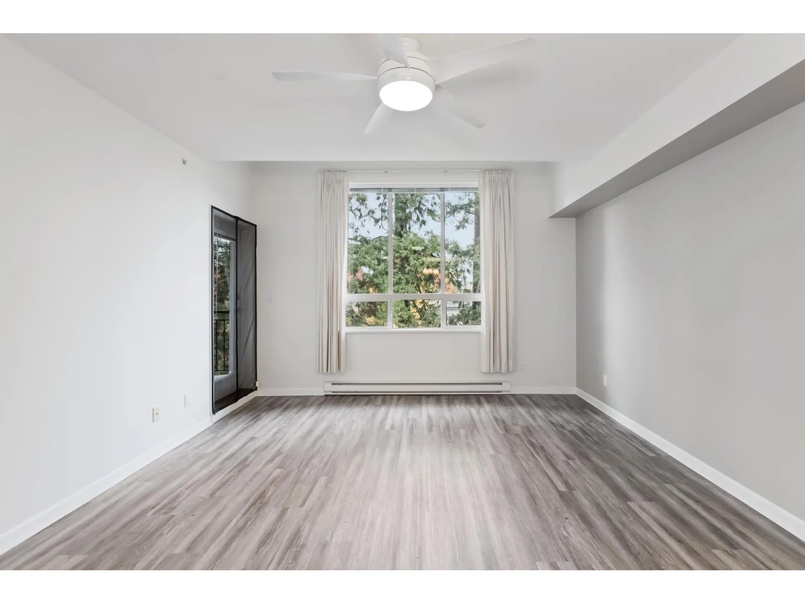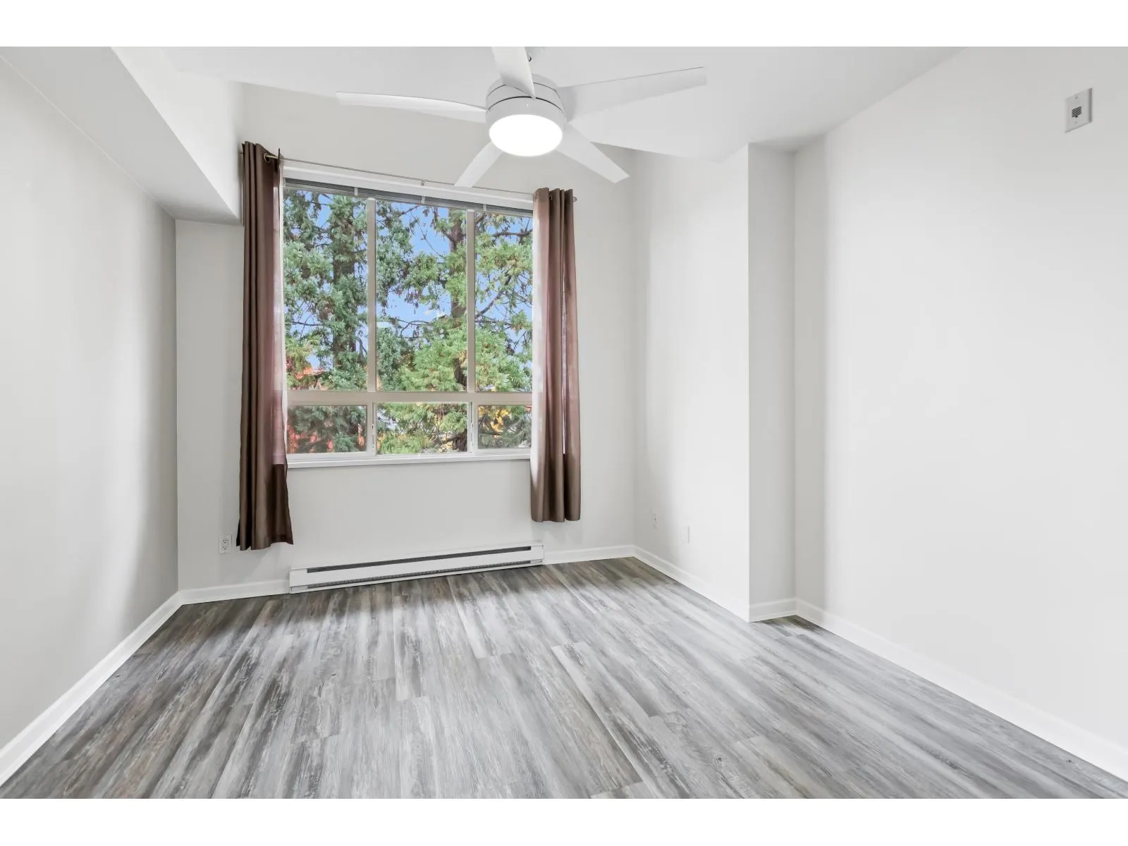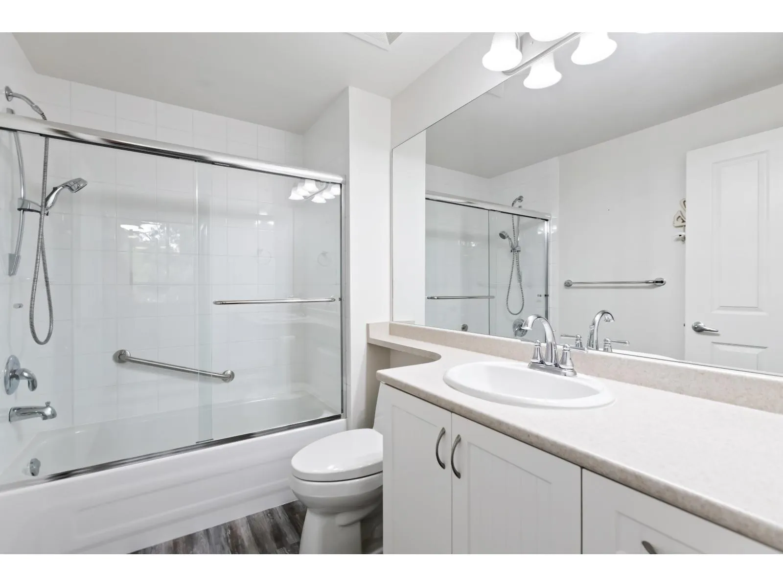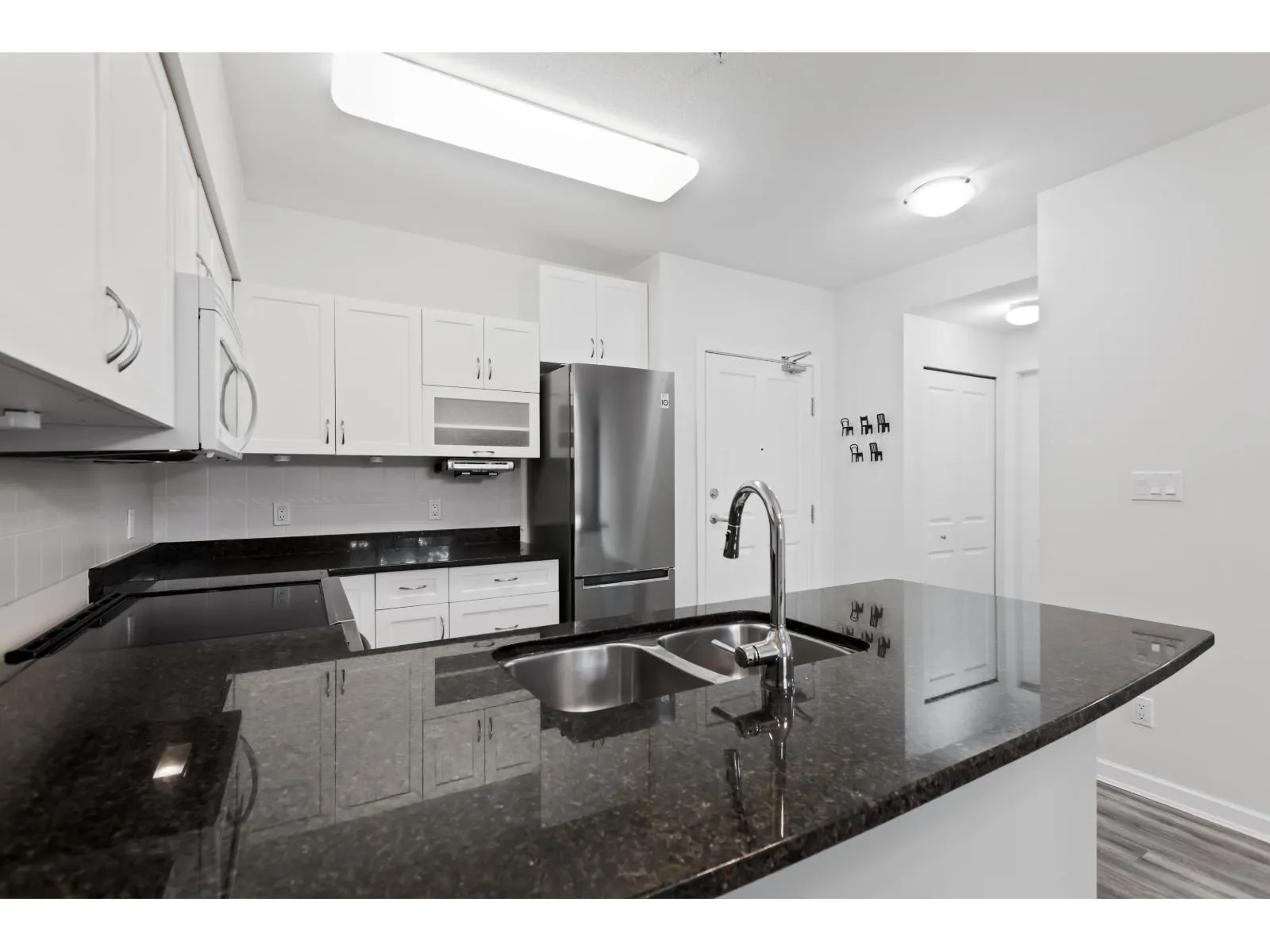 Stunning renovated Top Floor home in Fleetwood Gardens a 55+ centrally located building.2 bedroom + den, with 2 full bathrooms, in-suite laundry, secure parking for 1 vehicle, boasting over 1000 sqft of functional living space. Natural light fills this North facing home with 9 foot ceilings and large windows overlooking trees for a picturesque setting. Home in immaculate condition with recent upgrades including vinyl plank floor, lighting, kitchen/bathroom cupboards, quartz counter tops, newer appliances including induction stove! Large primary bedroom with his & hers closet and ensuite with tub. Relax & enjoy mountain views from your large covered patio. Just minutes walk from Fleetwood Community Centre, parks, grocery stores, restaurants, and transit. Quick Possession possible! (id:27476)