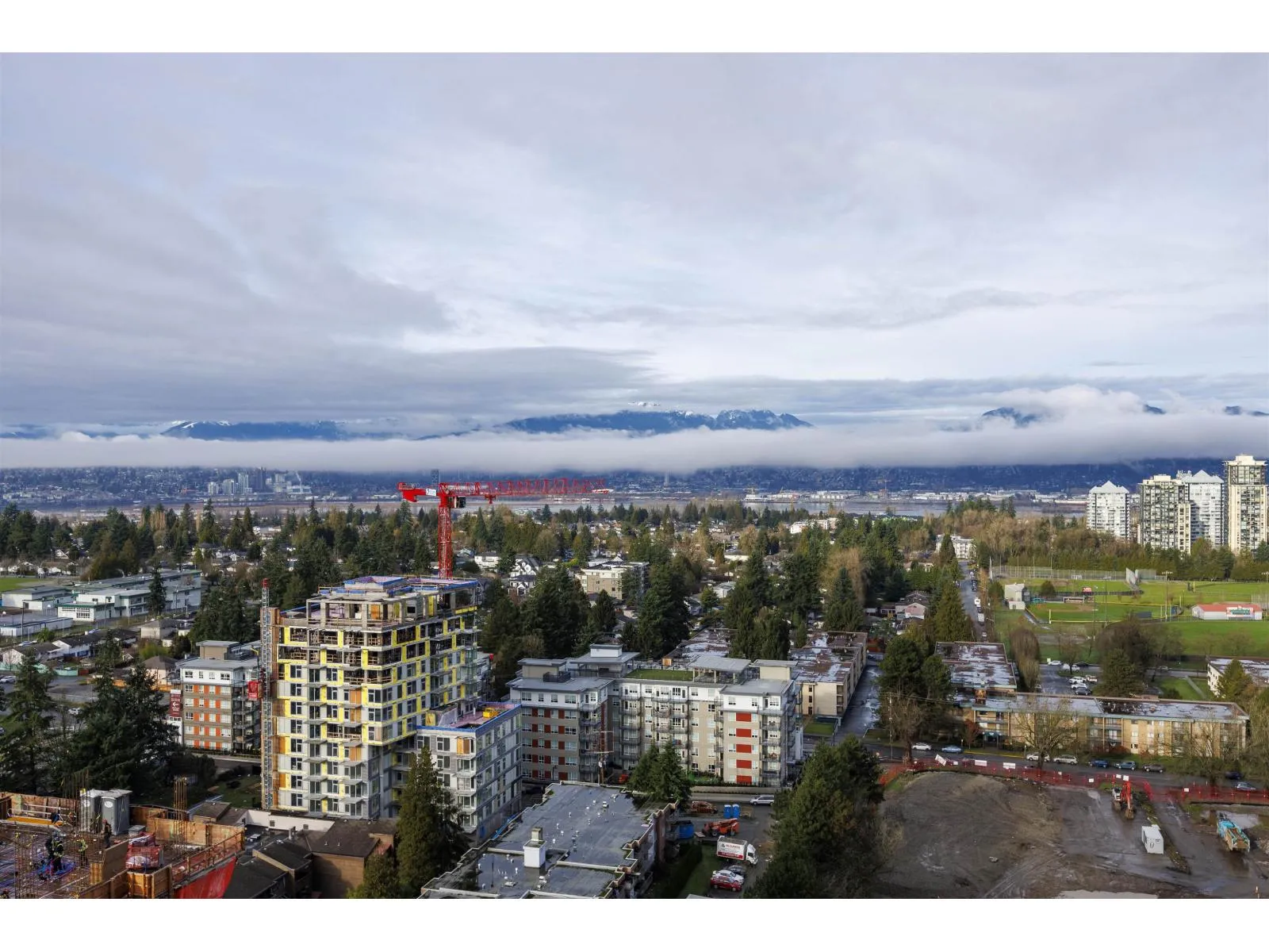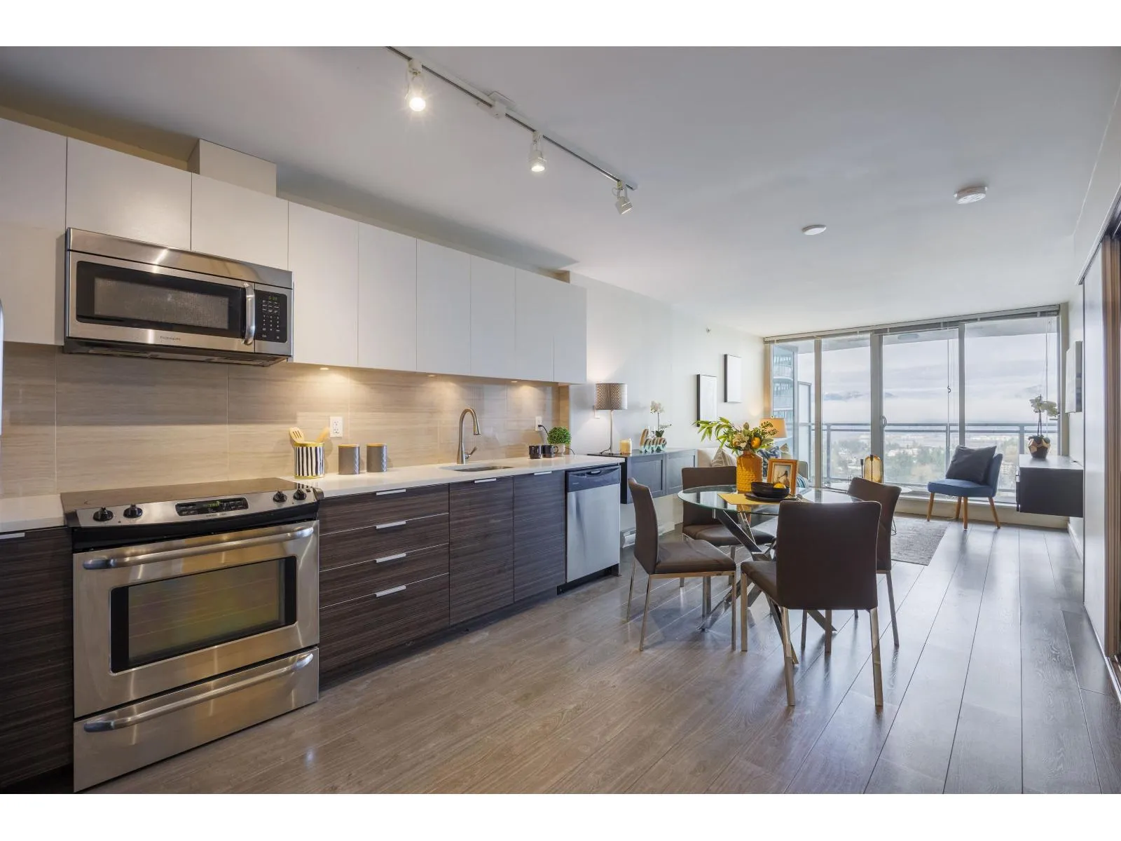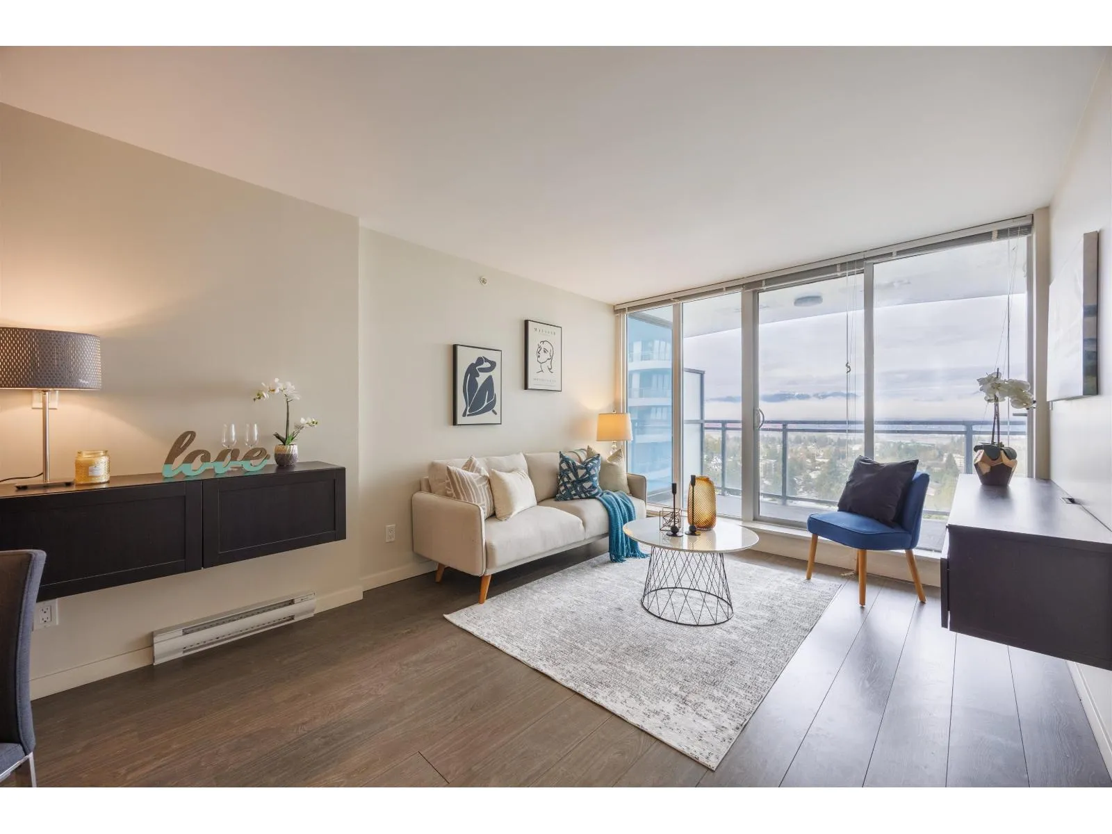 Stunning North Shore Mountain views from this 22nd-floor 2-bedroom home at The Wave by RIZE Alliance Properties Ltd. Super well-maintained with fresh new paint and like new washer & dryer. Open-concept layout with quartz countertops, stainless steel appliances, central island, and wide-plank laminate flooring. Prime location steps to SkyTrain, shopping, SFU, and Surrey Centre. Exceptional amenities include rooftop BBQ lounge with Panoramic views, fitness center, clubhouse, dog wash, and car wash. Second bedroom is staged as office, however, more potentials are revealed in Pic: bedroom/Flex/Office. An outstanding opportunity for first-time buyers or investors-Book your appointment today! Come and find out !! A pleasure to show!!! (id:27476)