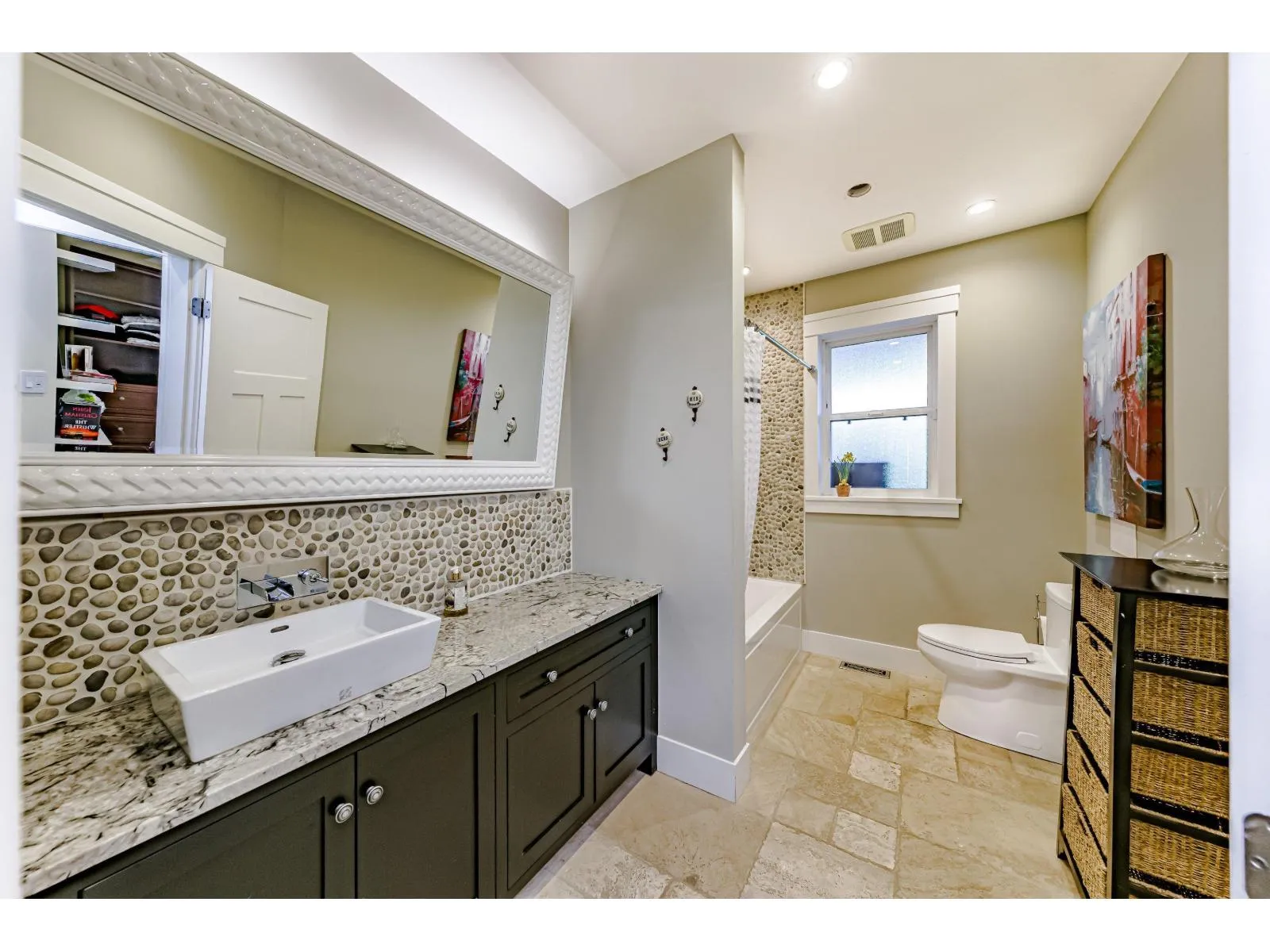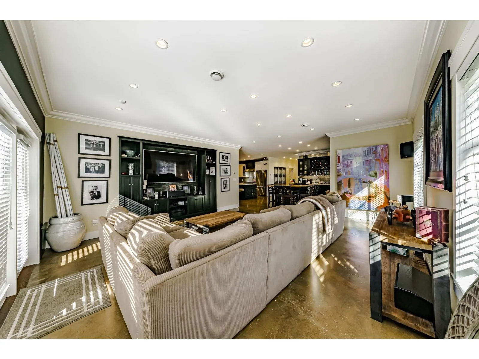 This 2,500 sq. ft. custom rancher sits on an 8,070 sq. ft. landscaped lot on a private road across from Northview Park. Fully renovated with high-end finishes, the home features 9-ft. ceilings, polished epoxy concrete floors, over 90 recessed lights, custom millwork, and built-in furniture throughout. The chef's kitchen boasts a 6-piece Jenn-Air appliance package, wet bar, and large pantry. Modern upgrades include radiant heating, tankless hot water, heat recovery system, A/C, new roof, EV charger, and surround sound wiring. The primary suite offers a see-through fireplace and a luxurious 5-piece ensuite. The backyard is an entertainer's dream with a huge deck, BBQ station, and Italian brick pizza oven. A rare opportunity to own a luxury single-level home in sought-after Fraser Heights. (id:27476)