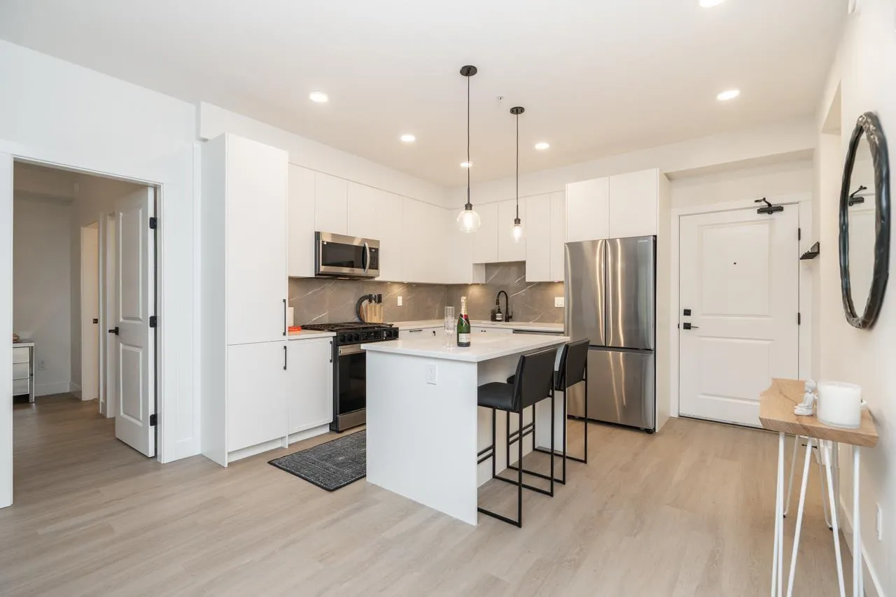 Welcome to King+Crescent, an award winning community by Zenterra in sought after South Surrey. This like-new 2 bedroom 2 bathroom home offers an efficient 861sf layout with 9ft ceilings, expansive windows, refined colour palette and upgraded durable vinyl plank flooring. The sleek kitchen features stainless steel appliances, gas cooktop, counter depth fridge and deep undermount sink. Generous sized bedrooms including master with spacious walk-in closet, finished AC for year round comfort. Enjoy a private balcony overlooking lush greenspace. Resort style amenities include a fitness centre, yoga and spin studios, indoor outdoor lounge, theatre, party room and guest suites. Includes two parking stalls and storage locker. Prime location with quick access to Hwy 99, transit and all amenities. (id:27476)