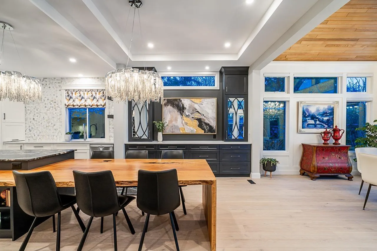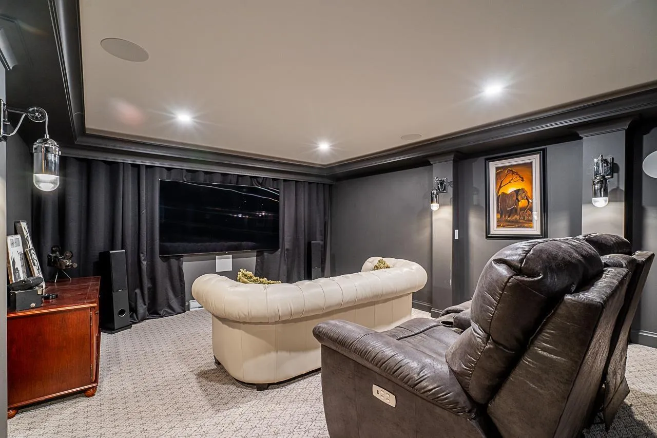 This stunning 4,300 sq ft cul-de-sac home, in a quiet sub-area of affluent Morgan Creek, offers the perfect balance of elegance, comfort, and nature's splendour. Professionally redesigned in 2021 ($375K), the open-concept layout features expansive windows which flood the main level with natural light, a gourmet kitchen with integrated built-ins, stylish cabinetry, a butler's pantry, and a one-of-a-kind 13ft live-edge island for large gatherings. The primary bedroom has a bdrm-sized walk-in closet and a heated ensuite. The basement has a classical wine cellar & a wet bar &it also offers a luxurious movie room and large, cozy guest room. The private, SW backyard oasis includes an outdoor kitchen & waterfall, and backs onto a quiet walking path that backs onto a serene greenbelt. Perfection! (id:27476)