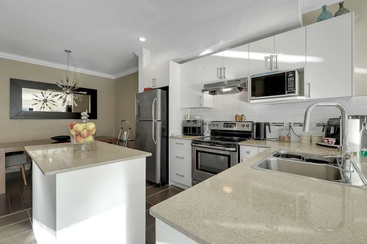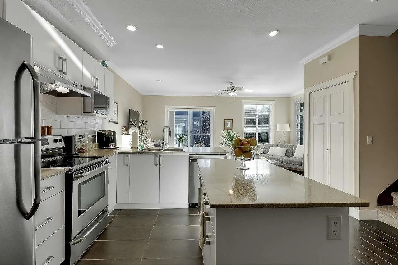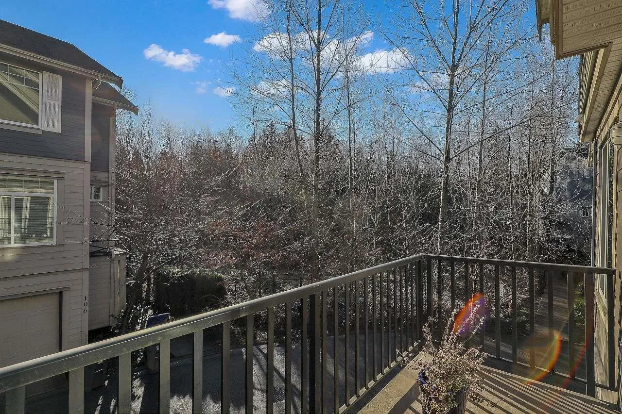 Welcome to Guildford Greens. This bright, corner-unit 3-level townhome faces a quiet greenbelt, offering excellent privacy and abundant natural light throughout. Featuring 4 bedrooms and 4 bathrooms, the home offers a highly functional layout. The main floor includes an open-concept living and dining area and a modern kitchen with quartz countertops, stainless steel appliances, and a large island, ideal for entertaining. Upstairs is a spacious primary bedroom with walk-in closet and ensuite, plus two additional bedrooms. The lower level offers a fourth bedroom with full bath, perfect for guests, office, or extended family, with direct access to a side-by-side double garage. Enjoy one balcony, a well-managed complex, and a prime Guildford location close to schools, shopping, transit, parks, (id:27476)