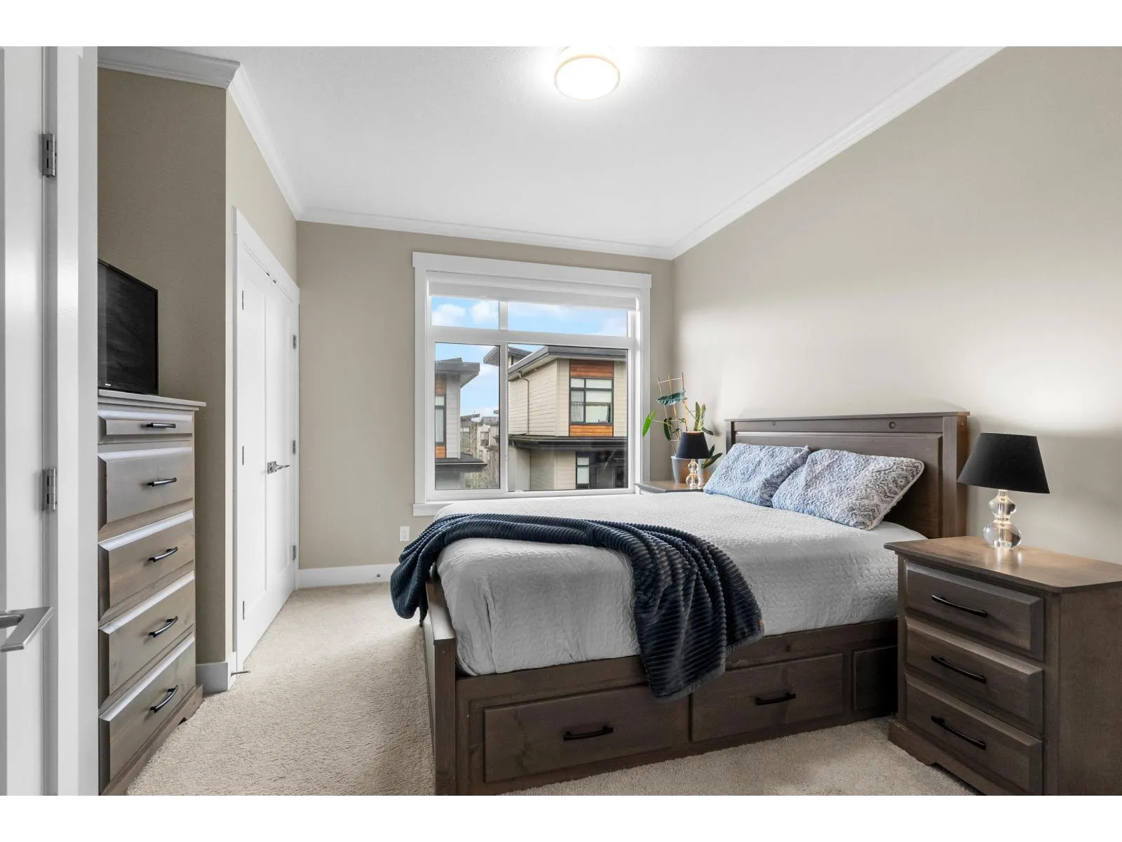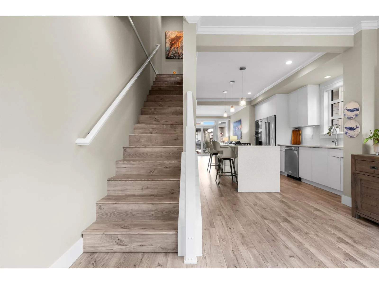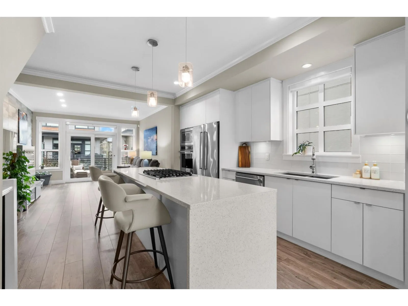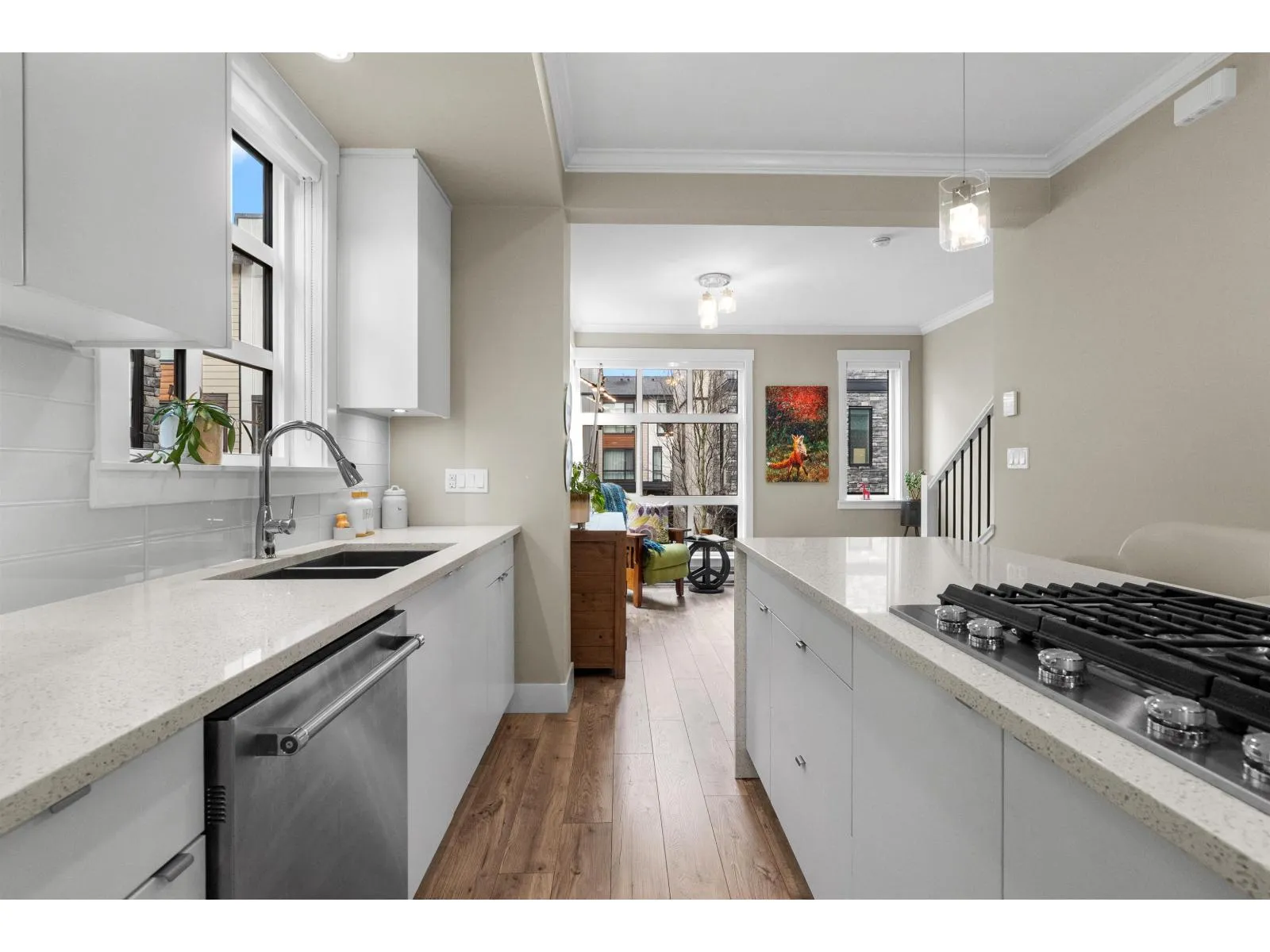 Beautifully maintained end unit at Harvest at Bose Ridge Farm in West Cloverdale! The open concept living space features a gourmet kitchen with quartz countertops, modern cabinetry, stainless steel appliances, gas cooktop, and a striking waterfall island, perfect for everyday living and entertaining. 9 foot ceilings and floor to ceiling windows create a bright, airy feel throughout. A versatile flex room/den welcomes you at the entry while the upstairs offers a generous primary bedroom and the second bedroom impresses with a dramatic 13 foot vaulted ceiling and stunning 10 foot windows. Two covered parking spaces and the garage is thoughtfully designed with loads of storage solutions. Plus, 18 acres of walking trails, athletic park & elementary school all at your doorstep! (id:27476)