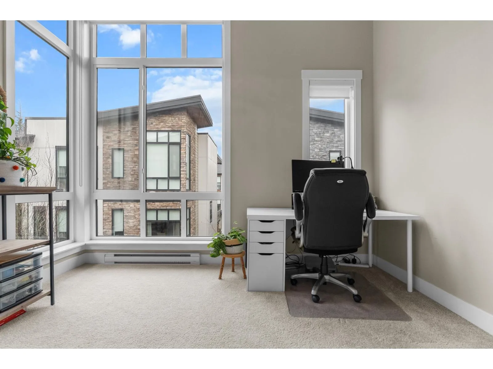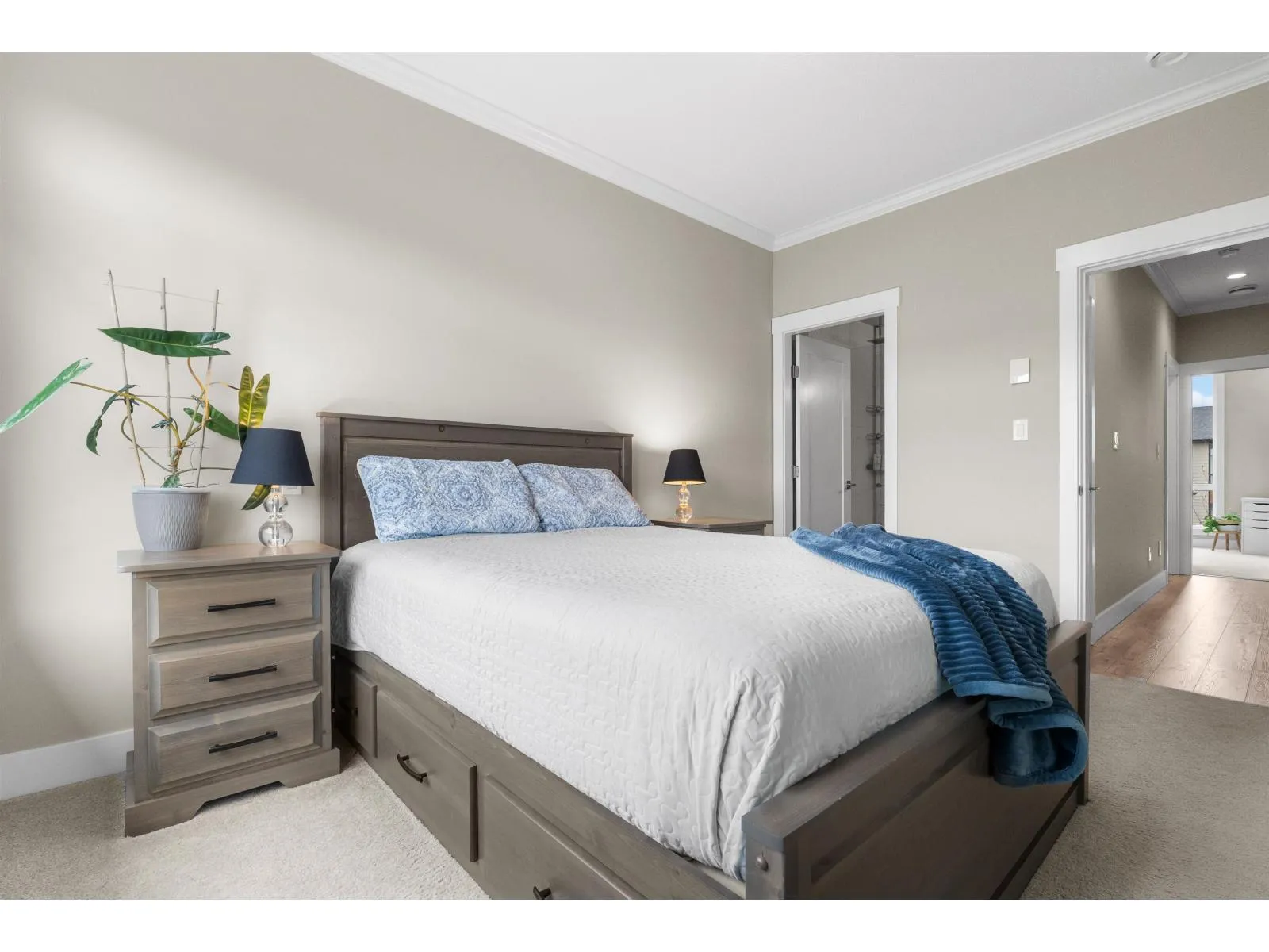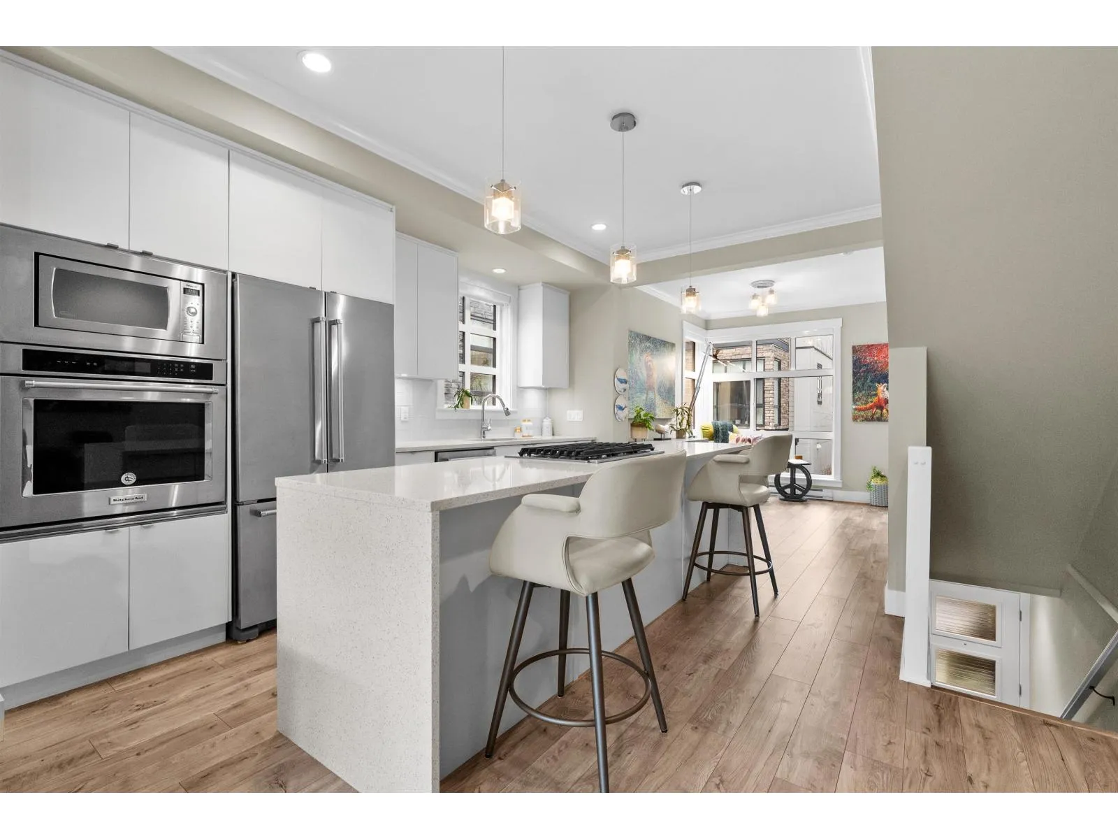 Beautifully maintained end unit at Harvest at Bose Ridge Farm in West Cloverdale! The open concept living space features a gourmet kitchen with quartz countertops, modern cabinetry, stainless steel appliances, gas cooktop, and a striking waterfall island, perfect for everyday living and entertaining. 9 foot ceilings and floor to ceiling windows create a bright, airy feel throughout. A versatile flex room/den welcomes you at the entry while the upstairs offers a generous primary bedroom and the second bedroom impresses with a dramatic 13 foot vaulted ceiling and stunning 10 foot windows. Two covered parking spaces and the garage is thoughtfully designed with loads of storage solutions. Plus, 18 acres of walking trails, athletic park & elementary school all at your doorstep! (id:27476)