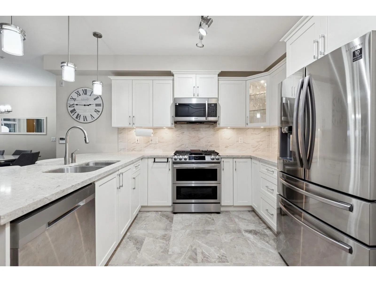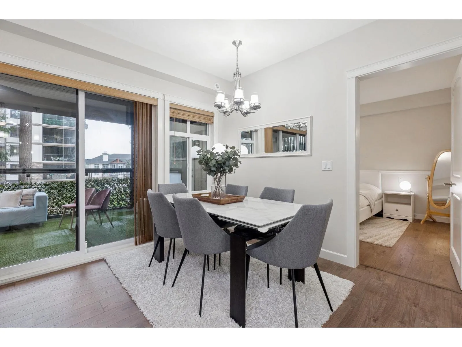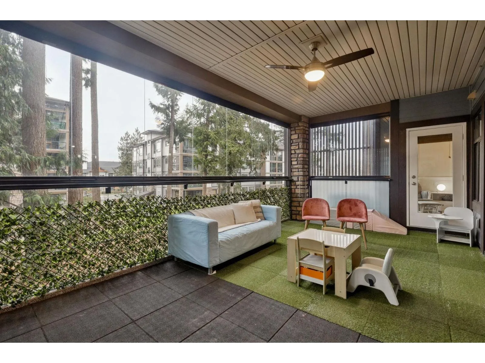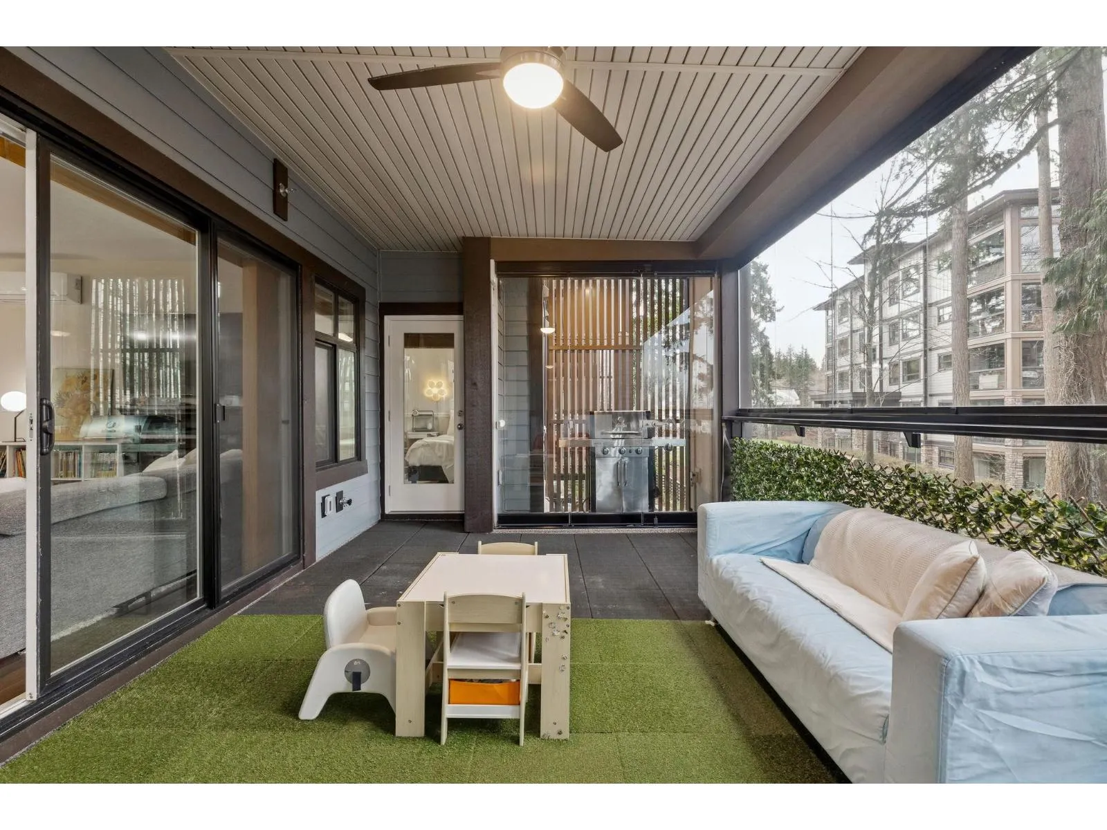 Welcome to Forest Ridge, a rare blend of luxury living and natural surroundings in South Surrey. This thoughtfully designed 1,305 sq ft of inside space features 2 bedrooms plus den, 2 bathrooms, and a stunning 273 sq ft glass enclosed solarium with retractable windows, perfect for year round fresh air living and entertaining. Inside, quartz countertops, stainless steel appliances, gas range, and real wood paneled cabinetry create a refined yet comfortable atmosphere. Spa inspired bathrooms, sound dampening construction, and a multi zone heat pump with air conditioning offer everyday comfort and quiet. Includes two underground parking stalls and a private storage garage. Steps to trails, shops, and dining, and minutes from Crescent Beach (id:27476)