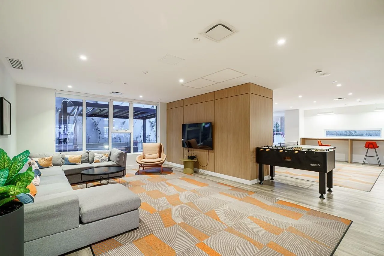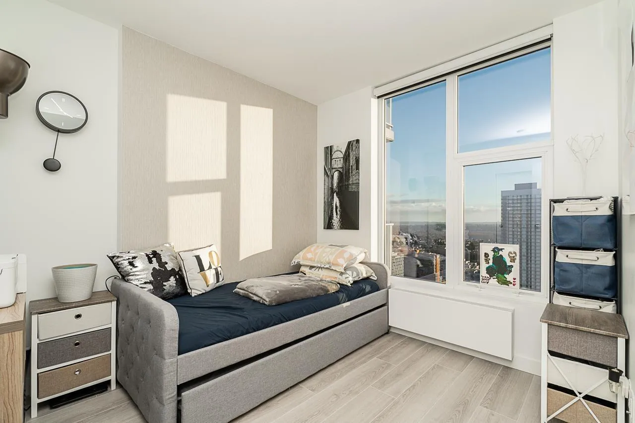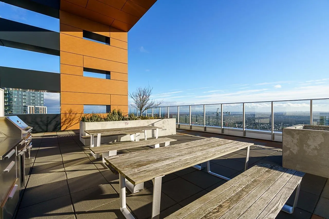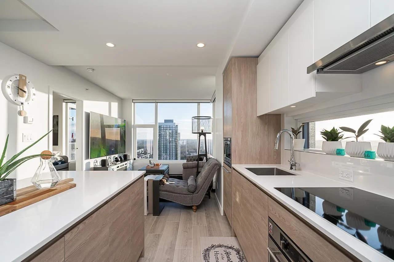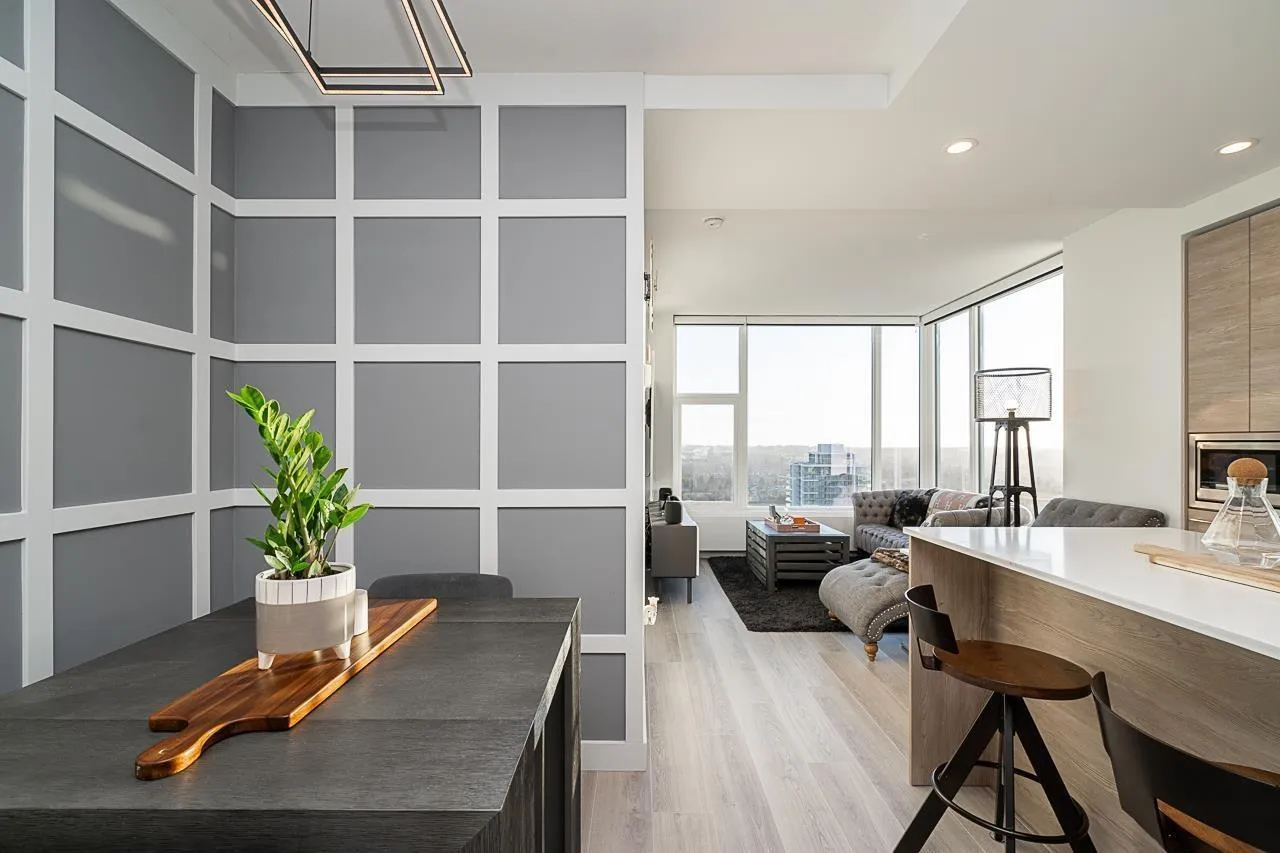 Elevate Your Lifestyle. Discover this stunning southwest corner unit at the prestigious King George Hub, the crown jewel of Surrey City Centre. Sleek accent walls adorn the foyer and bathrooms, while the master bedroom boasts a striking feature wall. The cozy dining area with square paneling is perfect for entertaining. Enjoy breathtaking city, mountain, and park views from every room, enhanced by automatic blackout blinds. This like-new 2-bedroom, 2-bathroom home features a bright, open-concept interior by BYU, with a Blomberg refrigerator, Fulgor Milano oven, induction cooktop, quartz countertops, laminate flooring, and remote-control bidets. Exclusive amenities include a 40th-floor lounge, fitness center, and yoga studio. Steps from SkyTrain, shops, and entertainment. (id:27476)