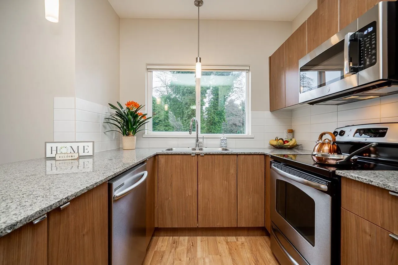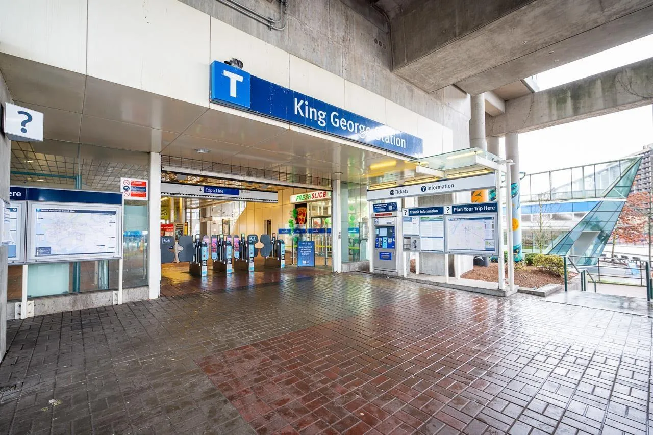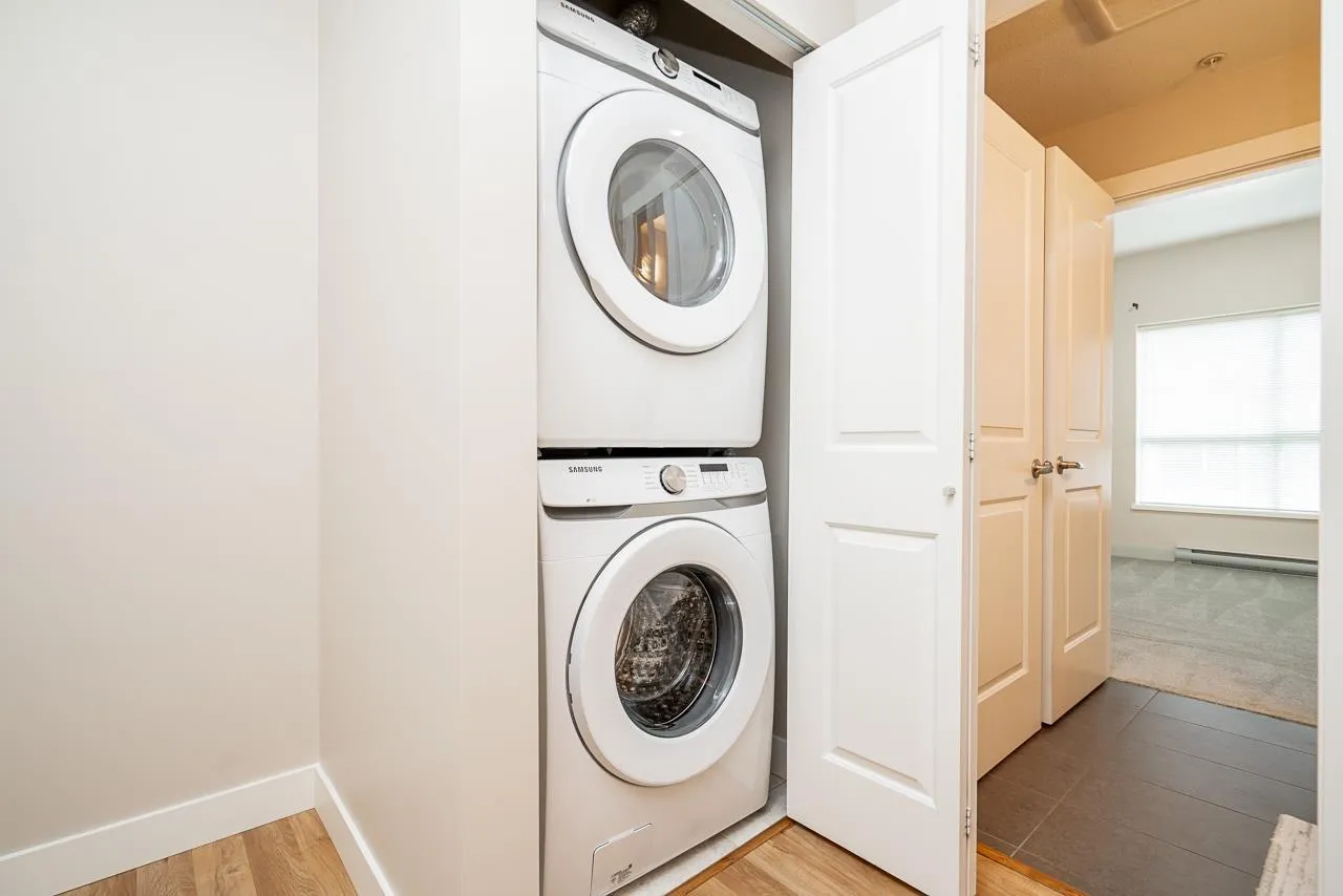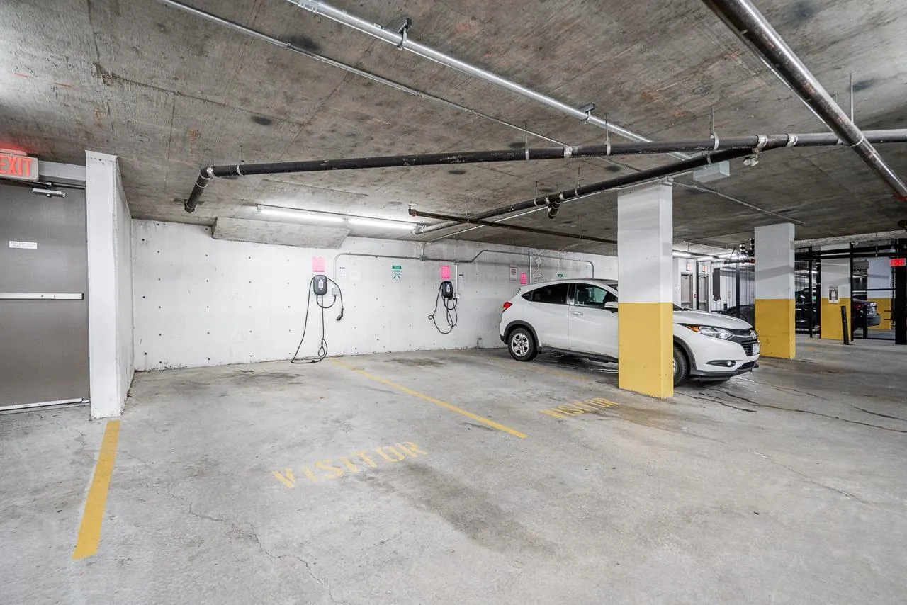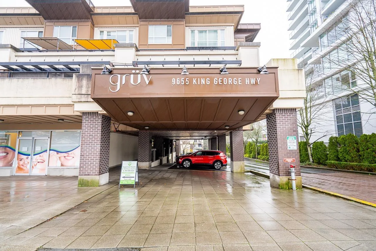 Hurry to view this spotless, quiet, corner apartment at GRUV. Like new condition, both bdrms are spacious & both have their own bathrooms. Large wrap around covered NW facing balcony overlooking peaceful greenbelt. S/S appliances,fridge & dishwasher less than 2 years old, granite countertops, new carpets in bedrooms & fresh interior paint throughout. Open plan with breakfast bar, window in kitchen with plenty of natural light. Walk through closet in primary bedroom.Updated washer/dryer. Gym & amenity room, central hot water. Plenty of visitor parking with ample EV outlets. Walk to King George Station, SFU, Central City Mall, Holland Park & Surrey Memorial Hospital. Possession anytime. Underground secure parking & bike area. Pet friendly. Competitive price you won't be disappointed. (id:27476)