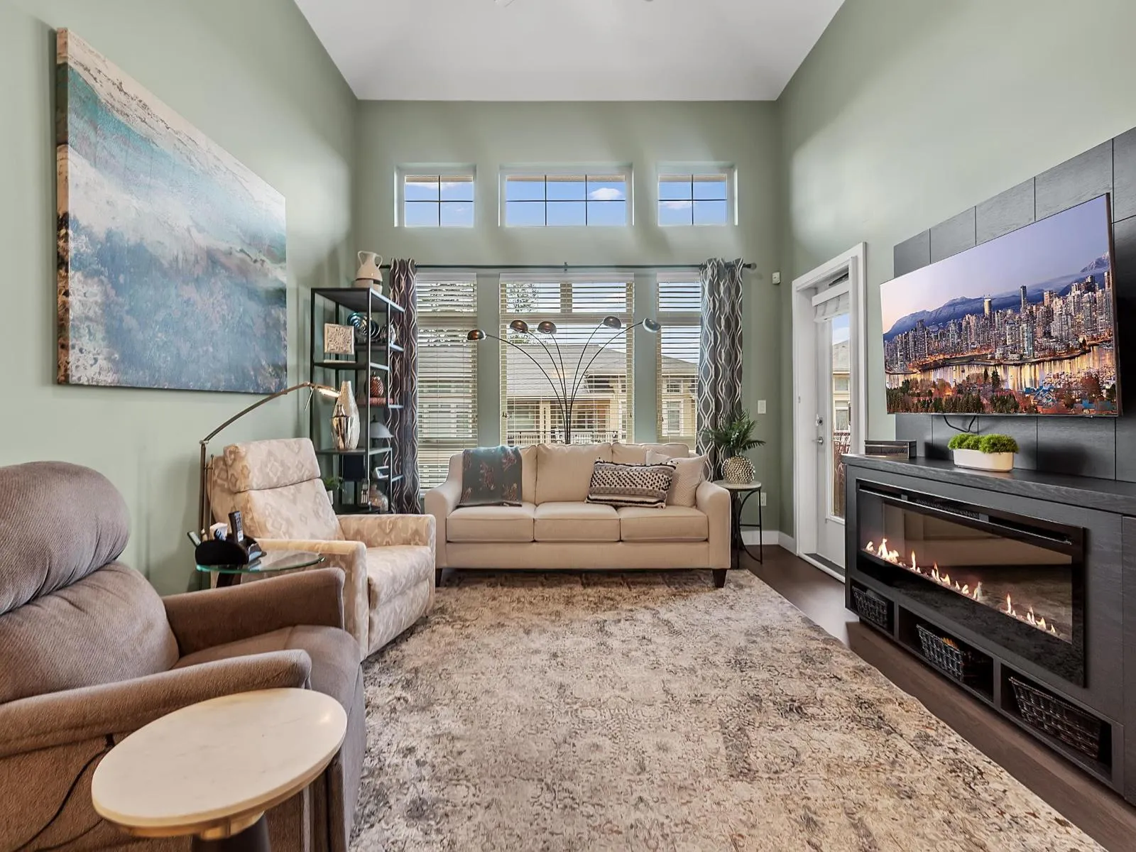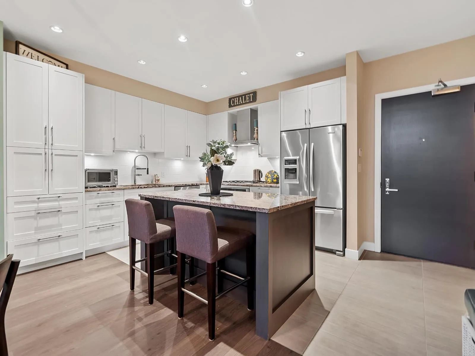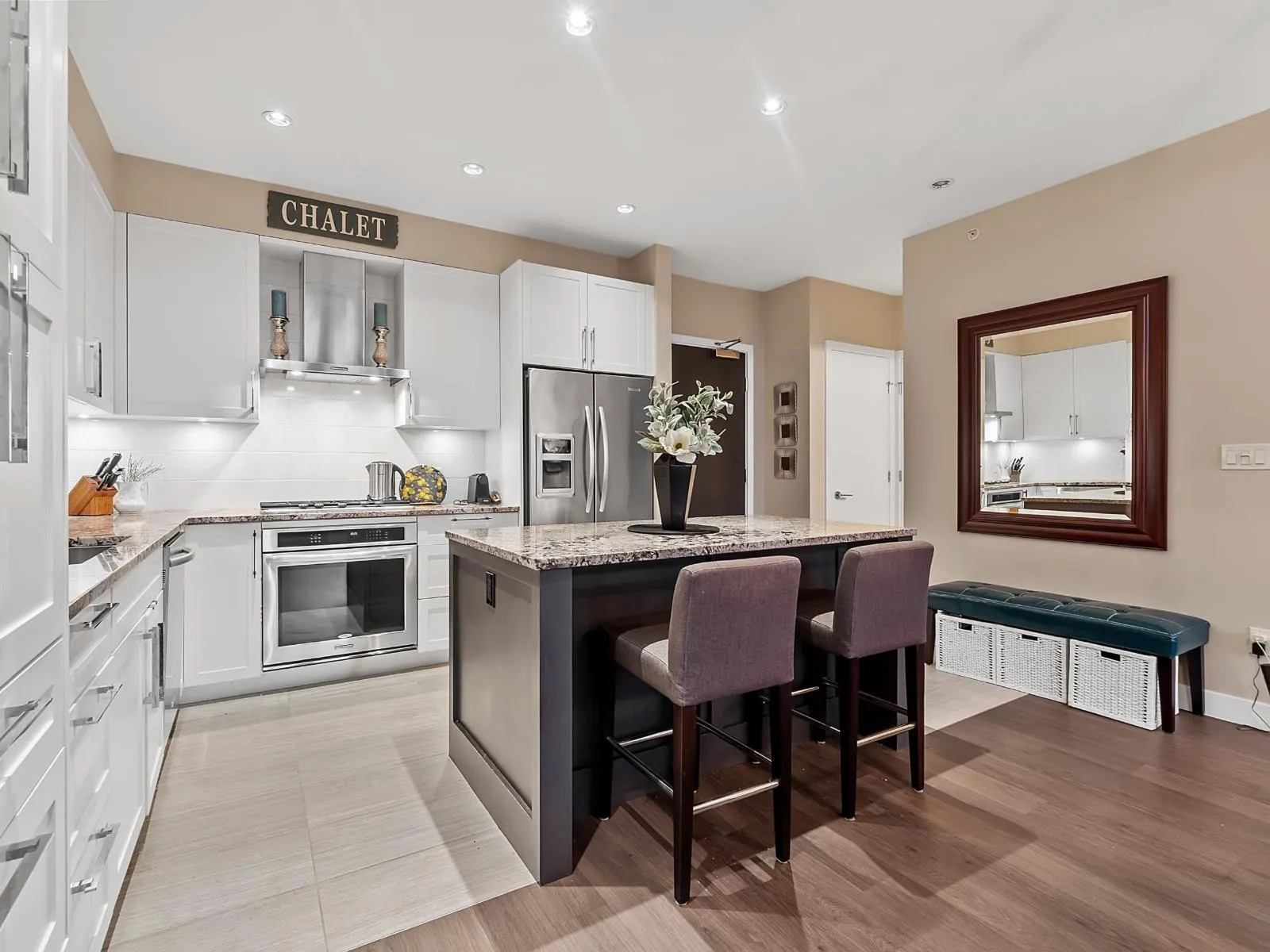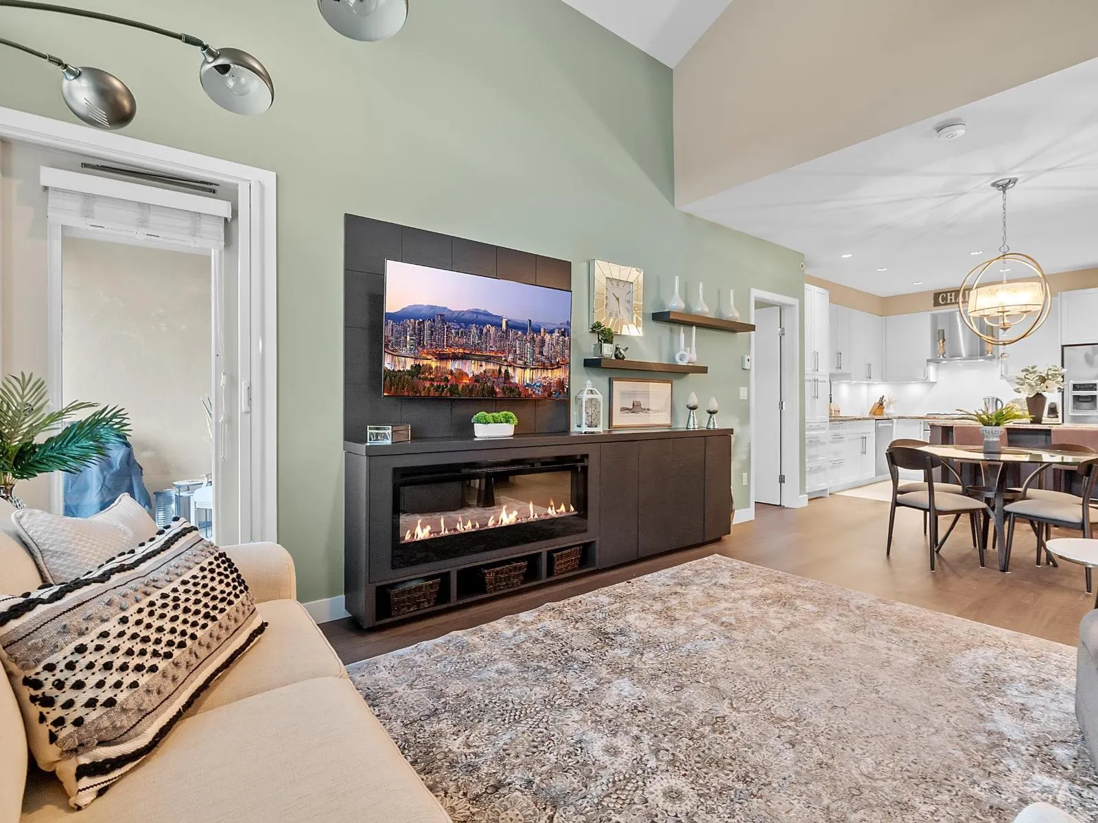 ADAGIO 1! Top-floor 2-bedroom + den residence offers refined living with open-concept layout and high-end finishes throughout. Custom features including a built-in desk, and fireplace with entertainment centre and shelving keeps the home uniform and clutter free. Enjoy lofty overheight ceilings in the living area, 9' ceilings throughout, and access to a spacious covered balcony overlooking the tranquil courtyard. The gourmet kitchen complete with stainless steel appliances, wine fridge, granite countertops, and sleek cabinetry. Exceptional amenities include a fitness centre, steam room, and a stylish clubhouse with fireplace and pool table. Ideally located steps to parks, shopping, and transit, this move-in-ready home delivers effortless luxury and lifestyle. (id:27476)