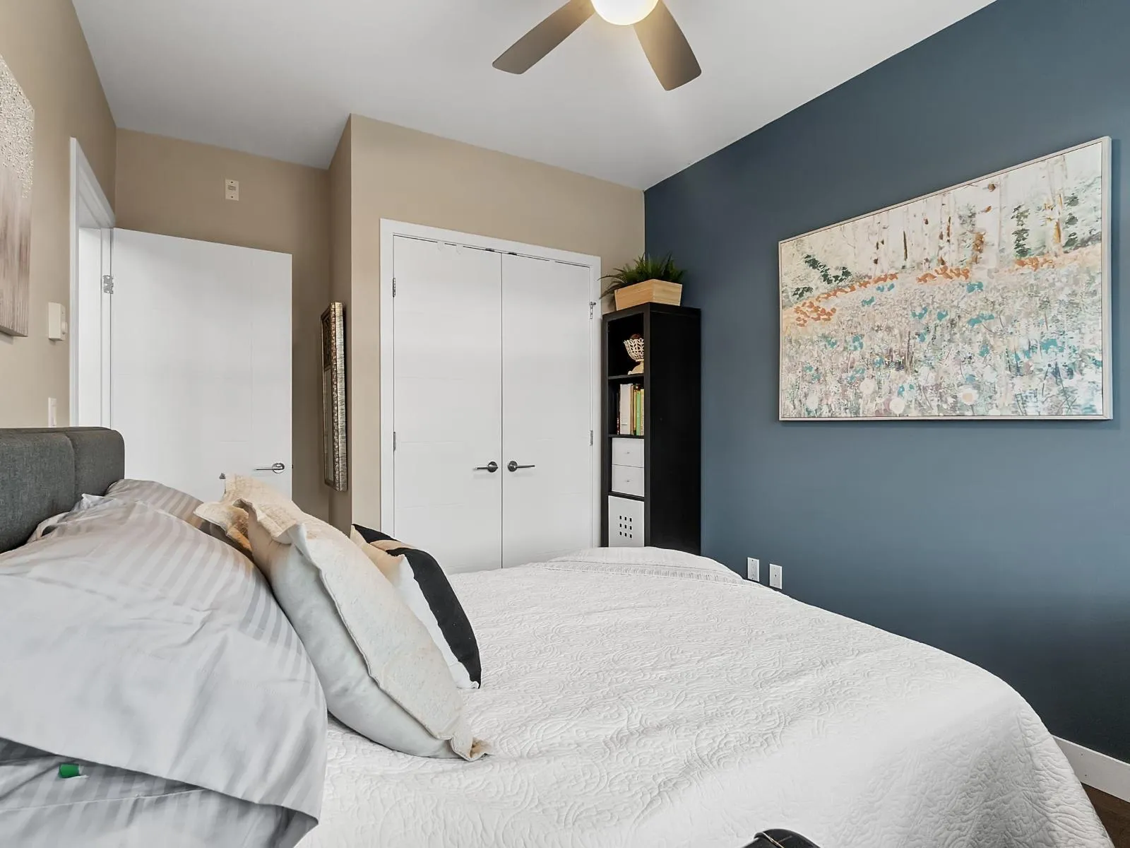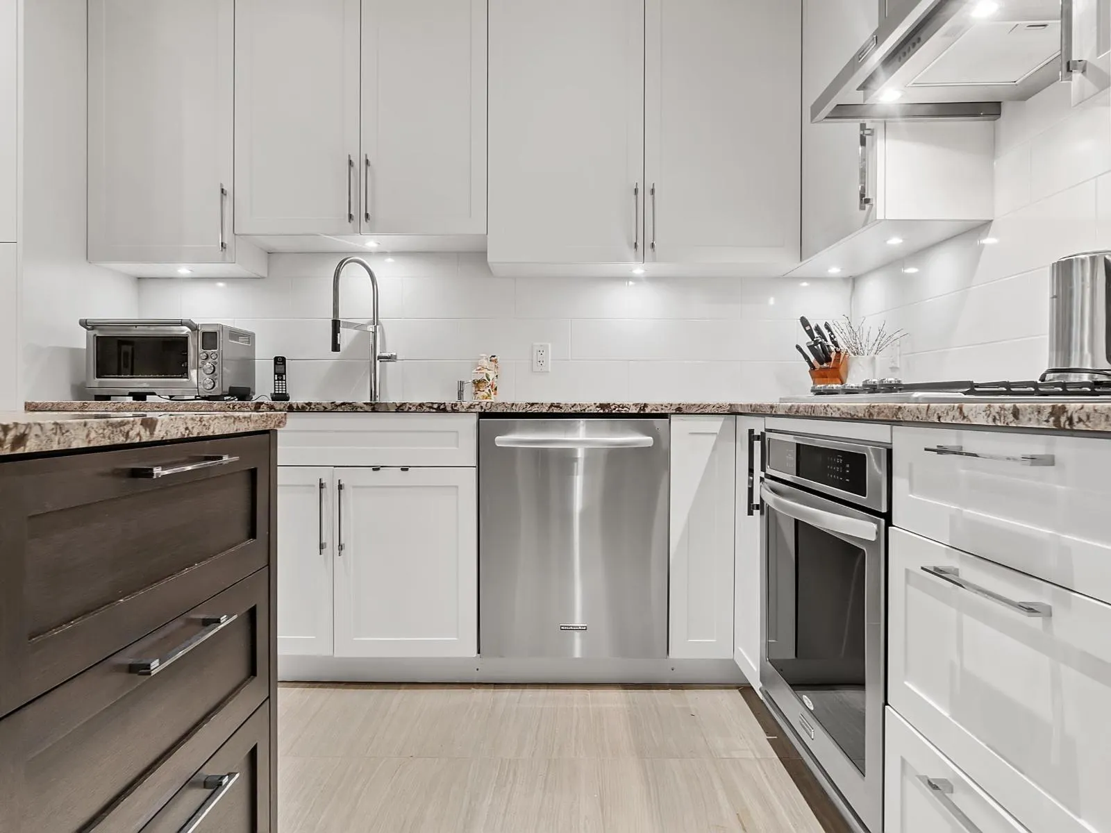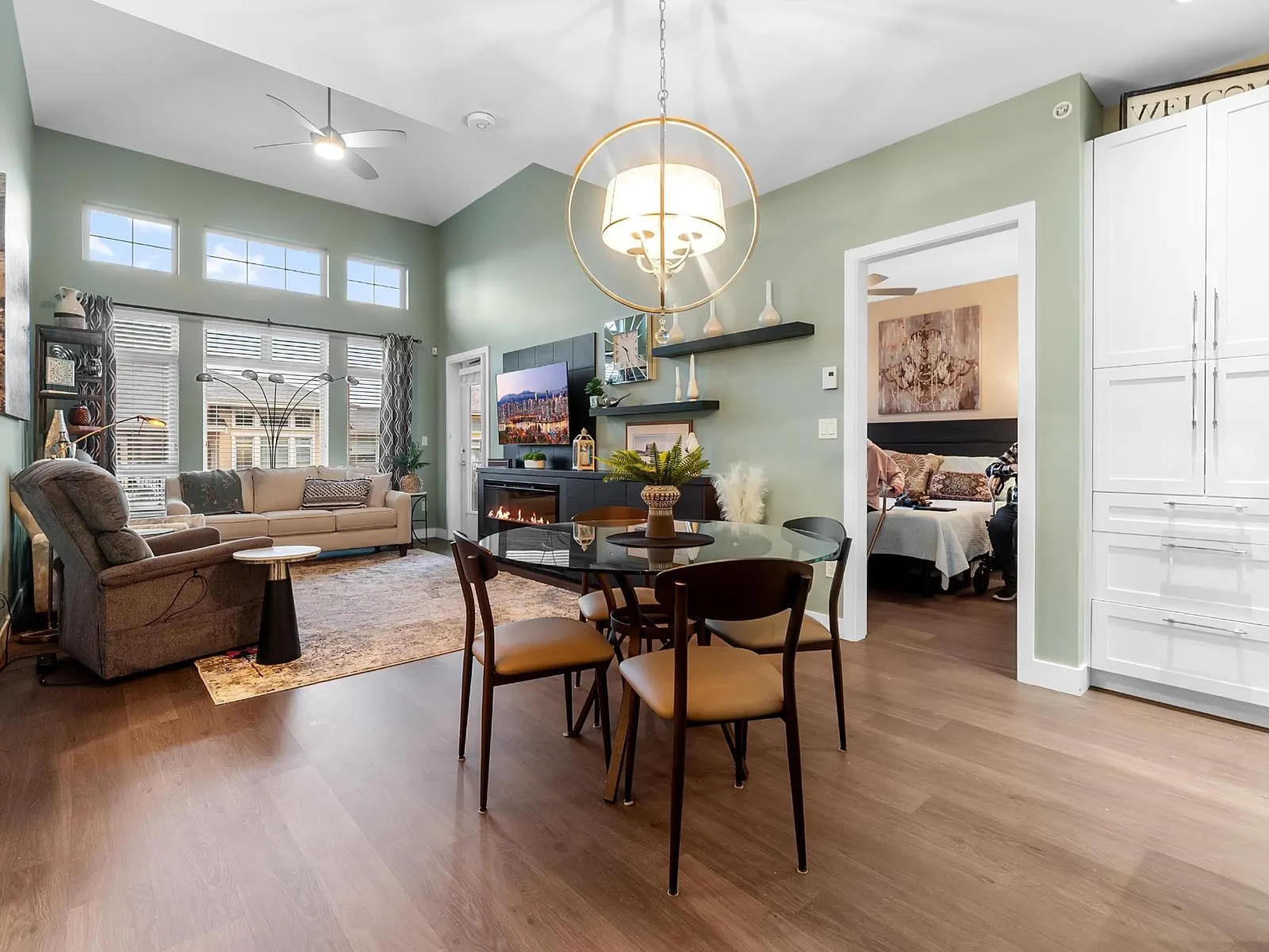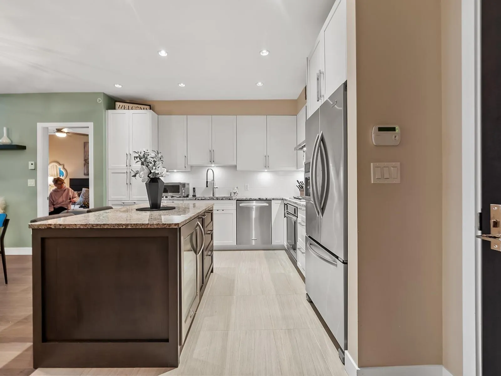 ADAGIO 1! Top-floor 2-bedroom + den residence offers refined living with open-concept layout and high-end finishes throughout. Custom features including a built-in desk, and fireplace with entertainment centre and shelving keeps the home uniform and clutter free. Enjoy lofty overheight ceilings in the living area, 9' ceilings throughout, and access to a spacious covered balcony overlooking the tranquil courtyard. The gourmet kitchen complete with stainless steel appliances, wine fridge, granite countertops, and sleek cabinetry. Exceptional amenities include a fitness centre, steam room, and a stylish clubhouse with fireplace and pool table. Ideally located steps to parks, shopping, and transit, this move-in-ready home delivers effortless luxury and lifestyle. (id:27476)