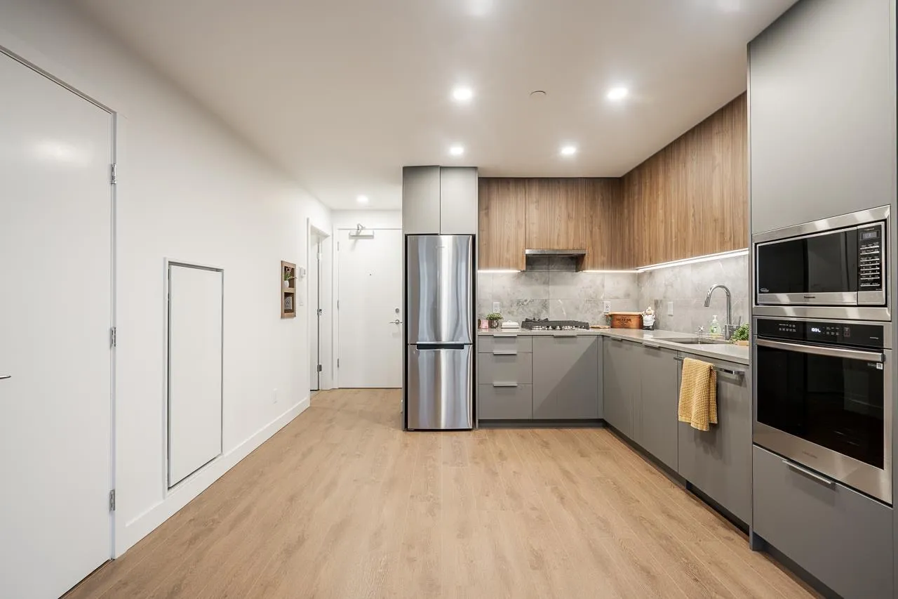 Brand New Building - HOLLAND TWO. This 1 Bed 1 Bath unit offers good size Bedroom & Walk-in closet, open kitchen with all high-end appliances & finishes and GAS STOVE. Huge Covered Patio, 130 sqft with Mountain & City views. Unit faces towards quite green space. 1 Parking and 1 Storage. Heat & Gas included in strata fees. Heat pump with central Air Conditioning. Building offers EXCELLENT AMENITIES - 24*7 Concierge & Security, 2 Guest suites, ROOFTOP PATIO with BBQ area, Party Room, Games room, Karaoke Room, Reading Room, 2 storey Gym with separate Yoga Room, 3 Lounge areas, Pet Wash, Outdoor Kids Play area, Co-Working space with private cabins. 5 Minute walk to Surrey Central Station, 1 minute walk to bus stop, 5 min walk to school & Holland Park. (id:27476)
