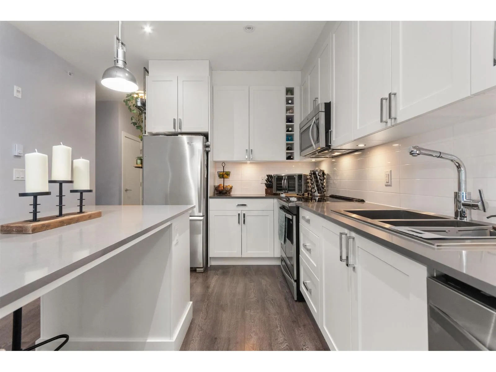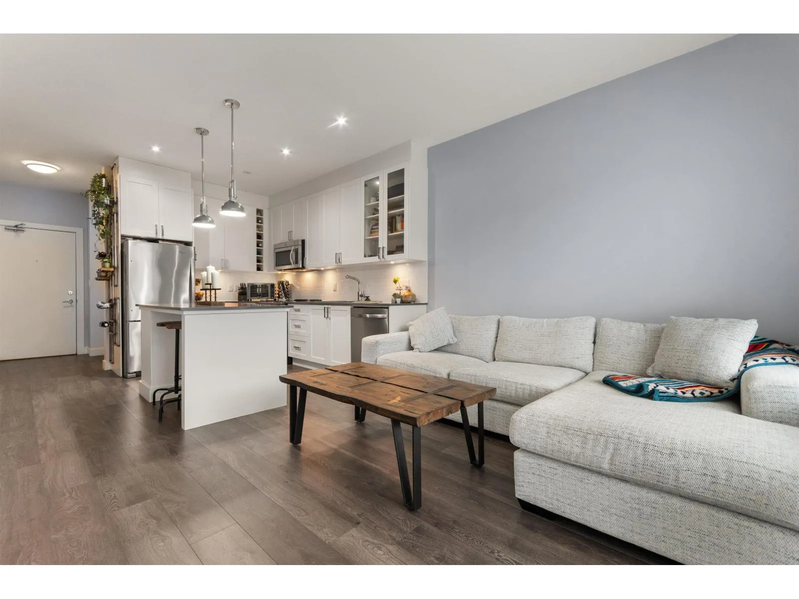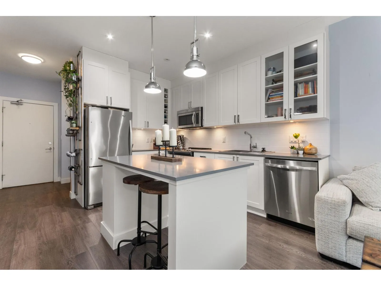 Top floor 1 bedroom plus den, featuring two parking stalls and a storage locker! Enjoy a covered patio, a spacious living room and primary bedroom, and a versatile den perfect for a home office. The modern kitchen features stainless steel appliances and high-end finishes throughout. The amenities here are next level-a beautifully designed amenities building with a fully equipped gym, theatre room, and a gourmet kitchen. There is also a stunning second amenities hall ideal for hosting events or parties. Even better, the complex offers 3 guest suites available for owners to rent for a low cost! A fantastic opportunity in one of Cloverdale's most desirable communities, The Ridge at Bose Farms. (id:27476)