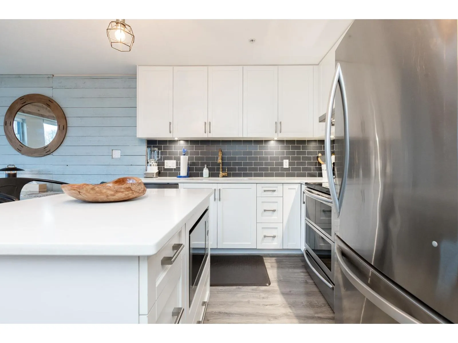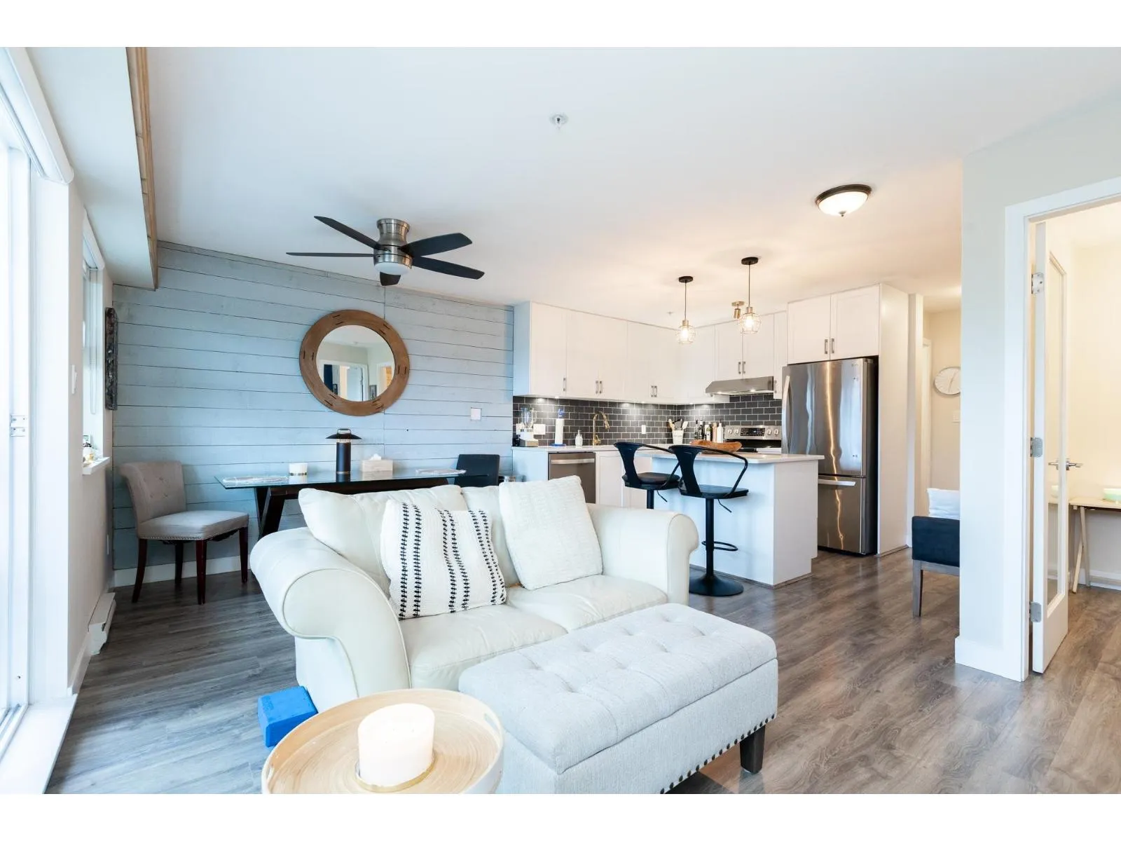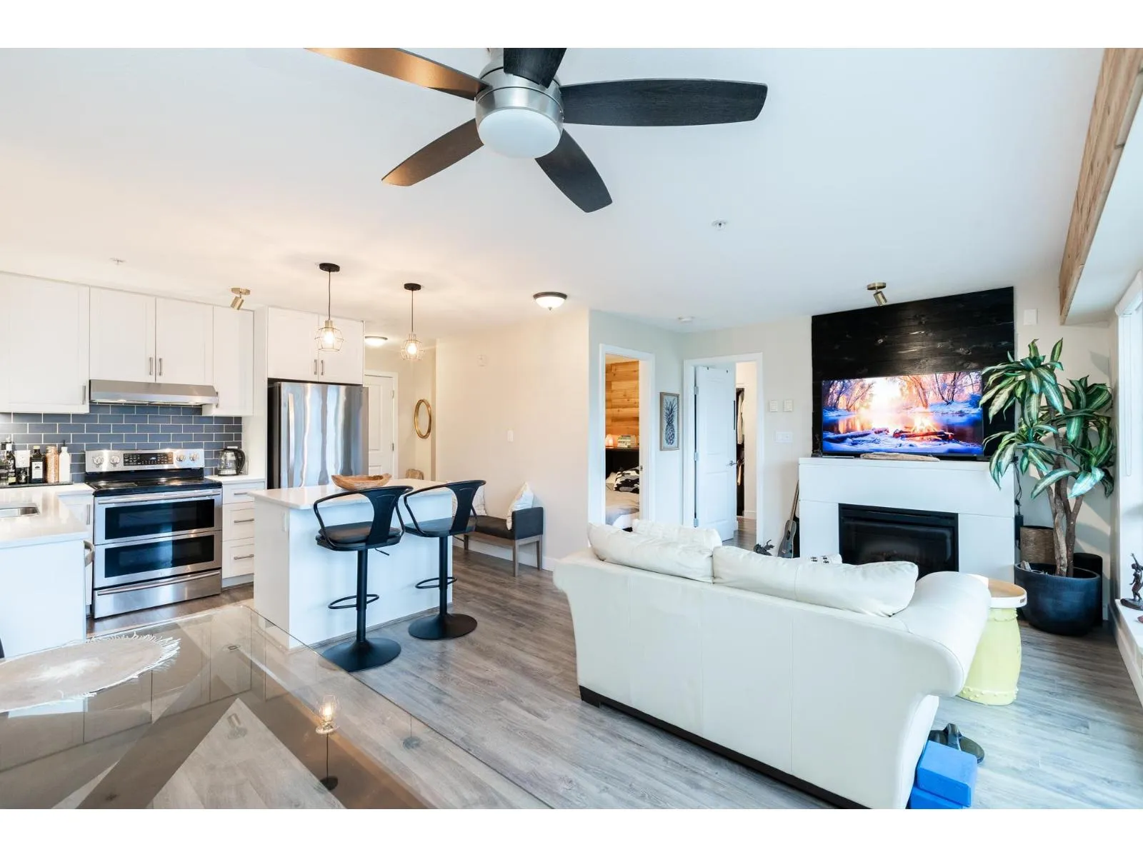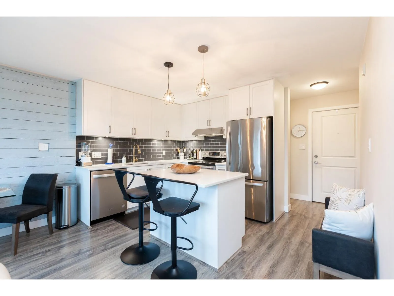 HOT OFF THE PRESS West Coast BEACH VIBE CUSTOM Branding Ship-lap design, Custom Hunter Douglas Blinds to taper down the South/West Sunny-Sensual glow. A Master 1-bedroom and Large Flex Den Suite with a Custom Size Queen Cabinet Bed (negotiable). Making this a 2 Bedroom for the price of ONE. The versatile suit can pivot into your home office, guest quarters, or imagination room. Walk down to fun-filled shops, Lululemon, Everything Wine, Gap, Banana Republic, Thrifty Market, Jamba Juice and Sammy J's w/ countless other urban conveniences. This bright, open-concept layout offers generous living space, ideal for both relaxing and entertaining. Enjoy the best of city living with transit, dining, and amenities just outside your door - perfect for professionals, first-time buyers, or investors. One #334 PARKING and One #329 STORAGE. Short list for extra parking and 2nd locker rental. Pet Friendly 2 dogs 2 cats or 1 of each. NO SIZE RESTRICTION ON DOGS! Storage in Laundry room. Patio looking at westerly sunsets. (id:27476)