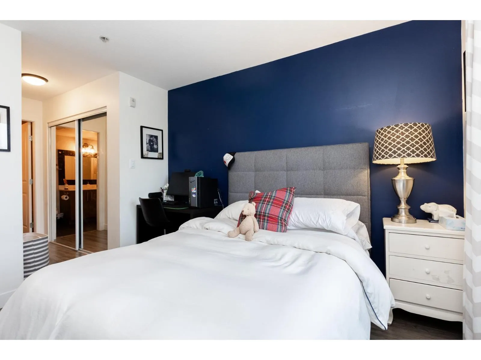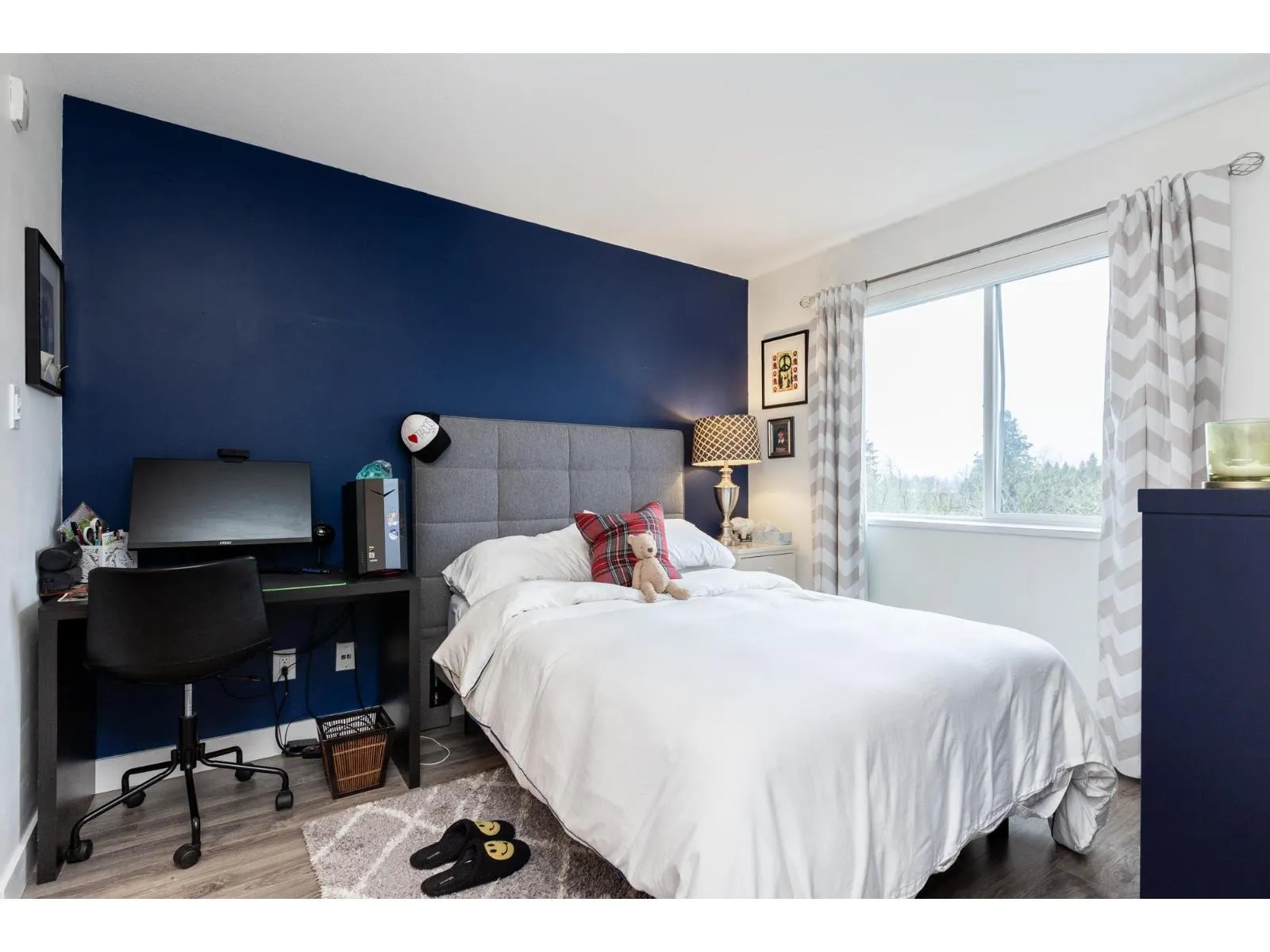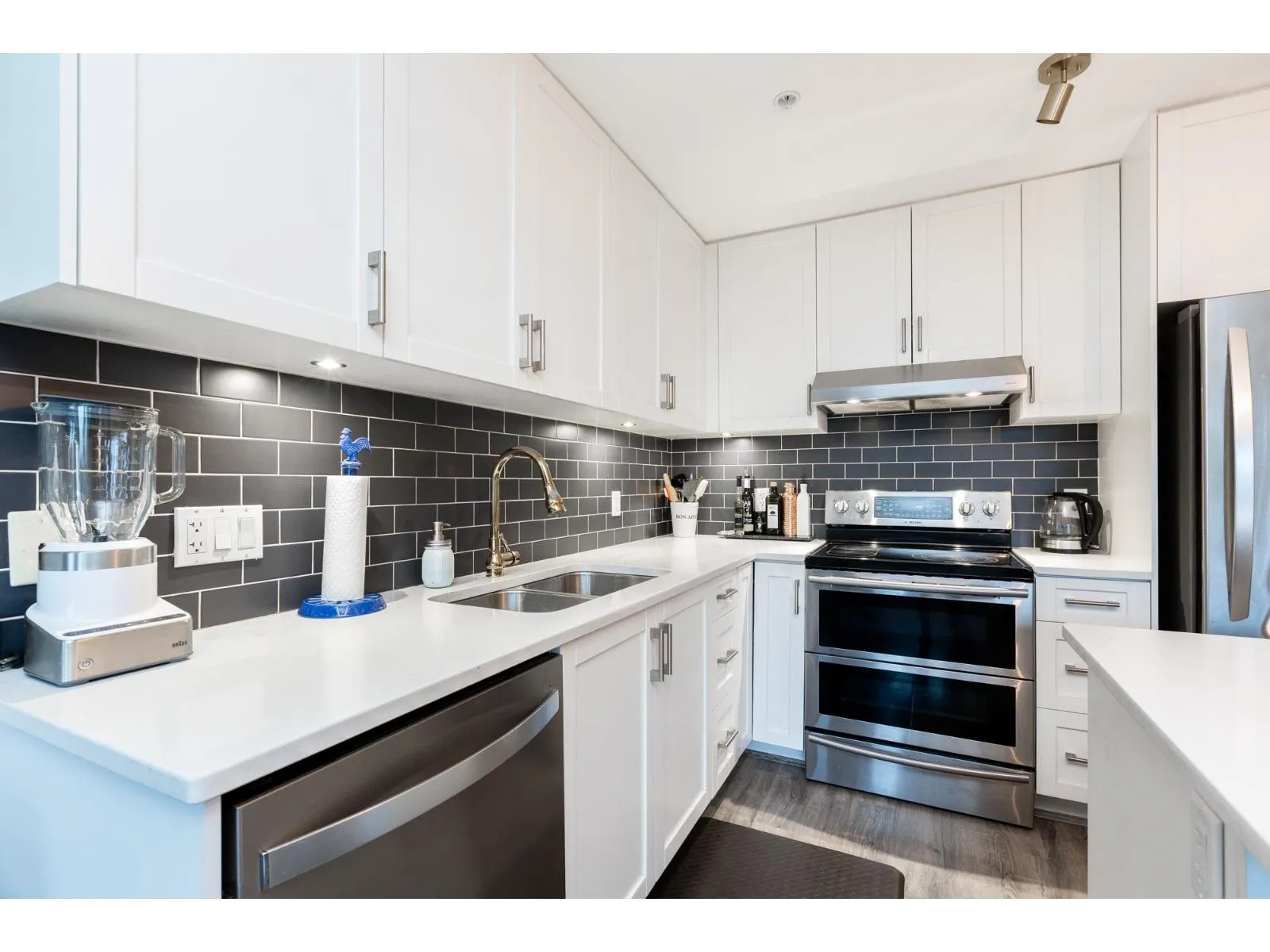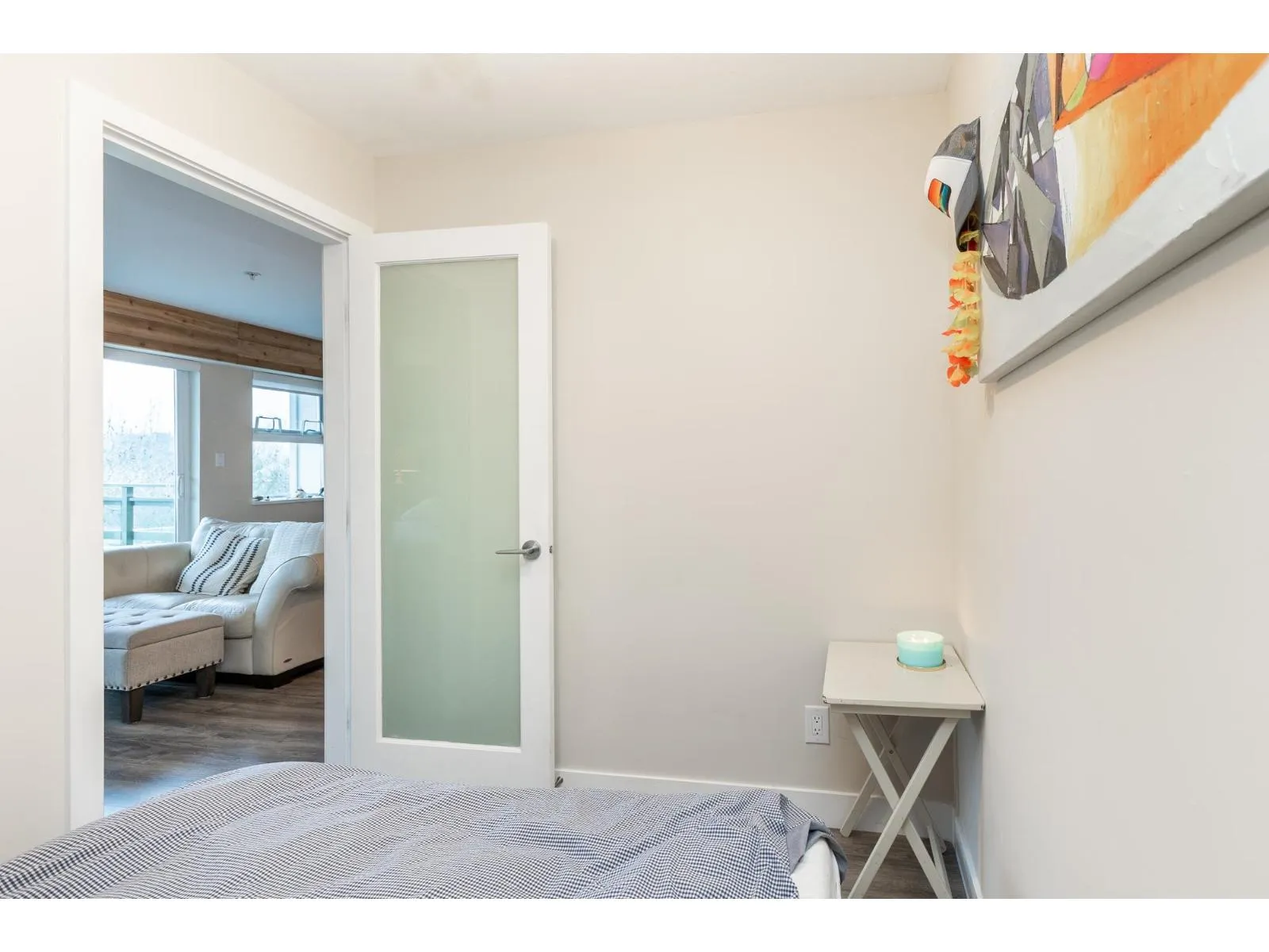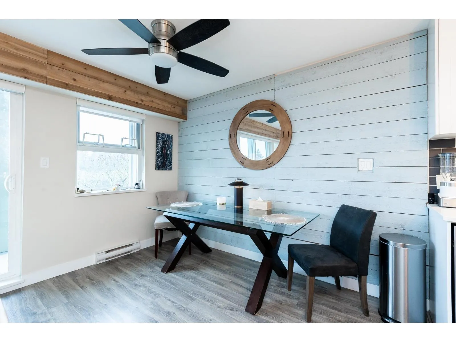 HOT OFF THE PRESS West Coast BEACH VIBE CUSTOM Branding Ship-lap design, Custom Hunter Douglas Blinds to taper down the South/West Sunny-Sensual glow. A Master 1-bedroom and Large Flex Den Suite with a Custom Size Queen Cabinet Bed (negotiable). Making this a 2 Bedroom for the price of ONE. The versatile suit can pivot into your home office, guest quarters, or imagination room. Walk down to fun-filled shops, Lululemon, Everything Wine, Gap, Banana Republic, Thrifty Market, Jamba Juice and Sammy J's w/ countless other urban conveniences. This bright, open-concept layout offers generous living space, ideal for both relaxing and entertaining. Enjoy the best of city living with transit, dining, and amenities just outside your door - perfect for professionals, first-time buyers, or investors. One #334 PARKING and One #329 STORAGE. Short list for extra parking and 2nd locker rental. Pet Friendly 2 dogs 2 cats or 1 of each. NO SIZE RESTRICTION ON DOGS! Storage in Laundry room. Patio looking at westerly sunsets. (id:27476)