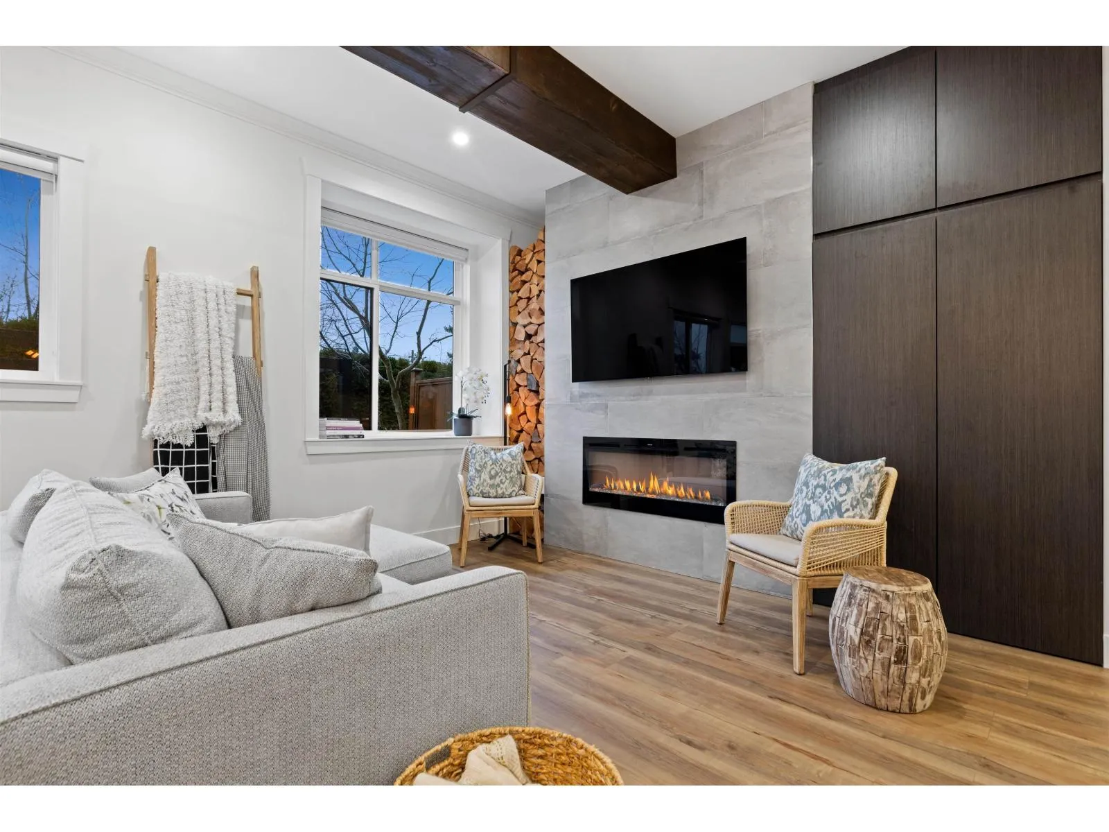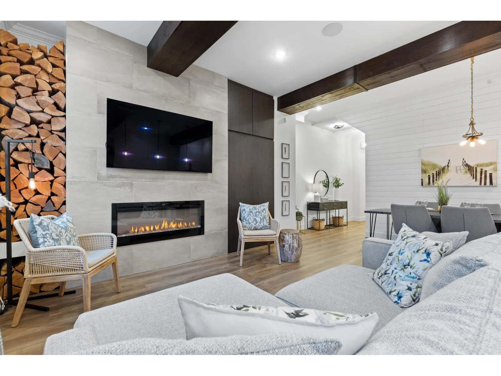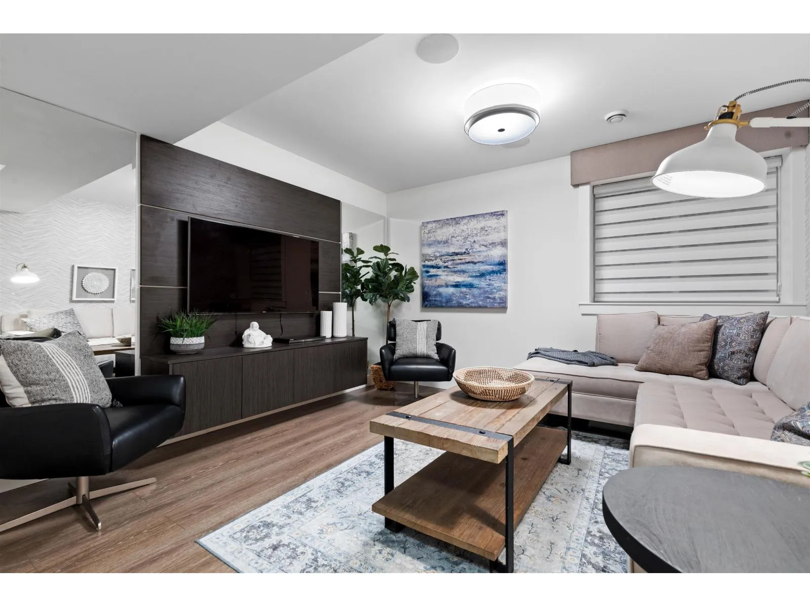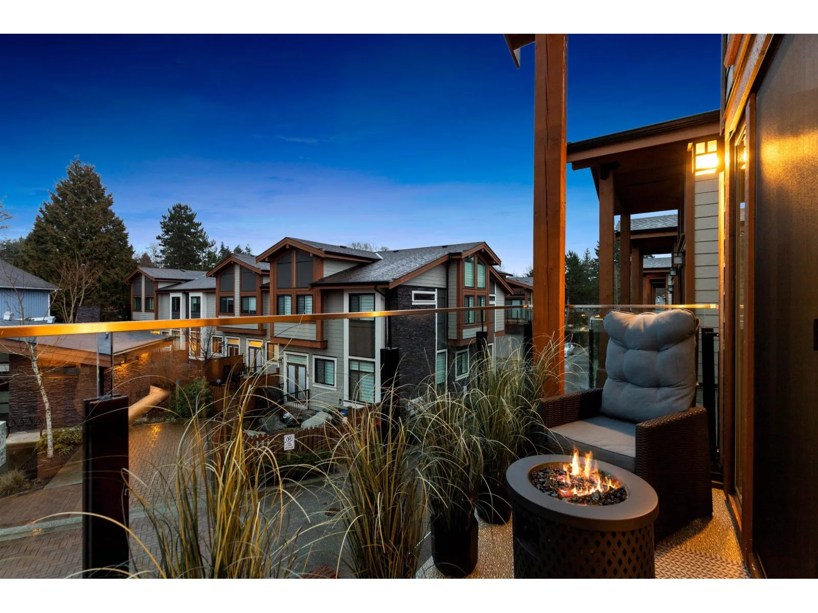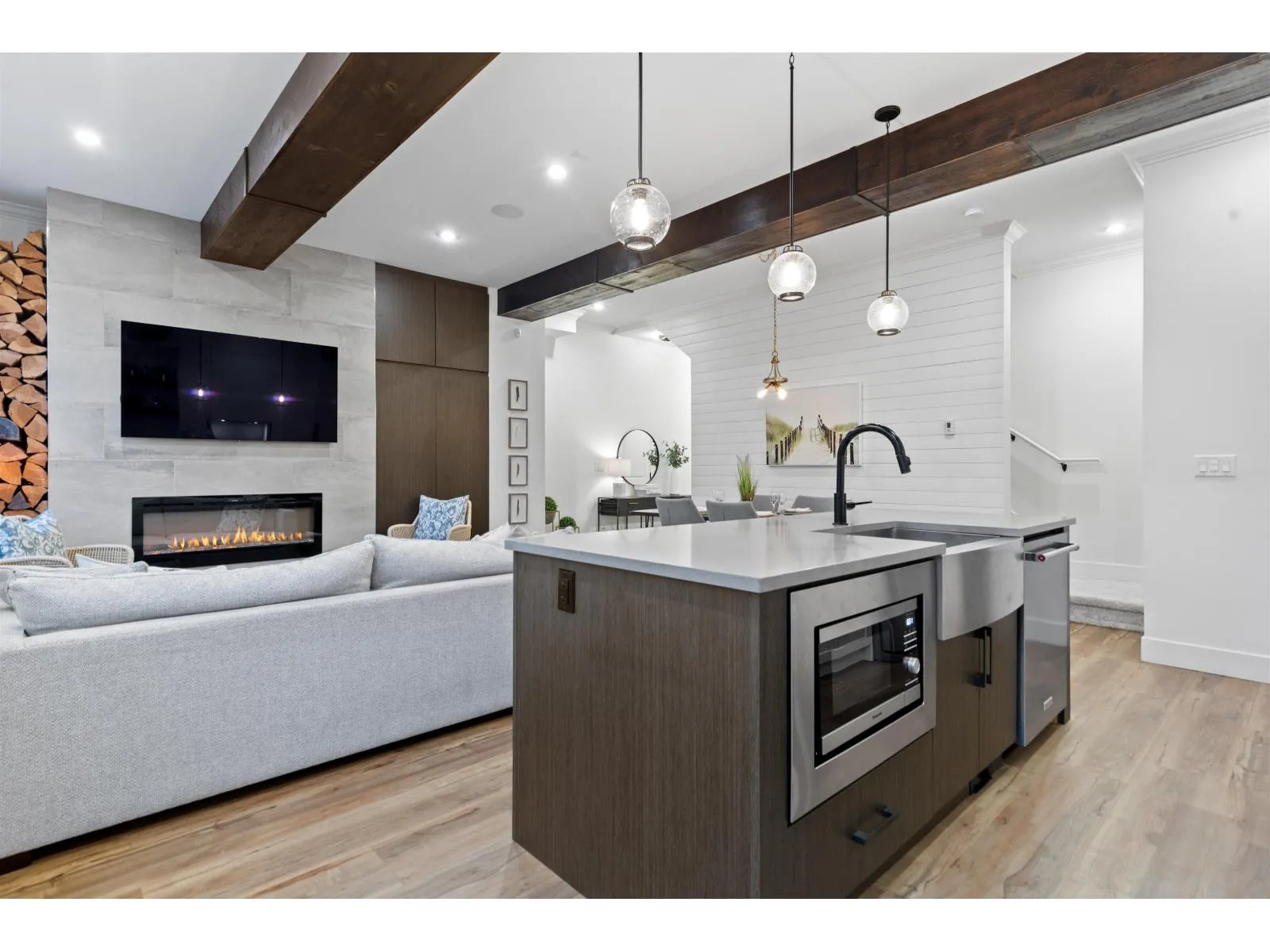 Step into luxury at Marca by Mortise, South Surrey. Former show home, Unit 2 is the former show home w/double wide garage & large driveway for 2 more vehicles. Chalet-inspired design, wood beams, smart home tech, A/C & iControl4 features. Feels like a house w/2300+sqft across 3 levels featuring many built-ins, custom shelving, new laminate flooring throughout, new carpets, newer light fixtures & fresh paint. Main offers white cabinetry, quartz counters, s/s appliances, gas range, island & SW exposure. Upstairs features 3 beds & flex, incl oversized primary w/w-i closet & ensuite w/double sinks. Downstairs includes large rec room w/custom bar, wine fridge & built-ins, plus 4th bed & storage. Enjoy 2 balconies or fenced yard. (id:27476)
