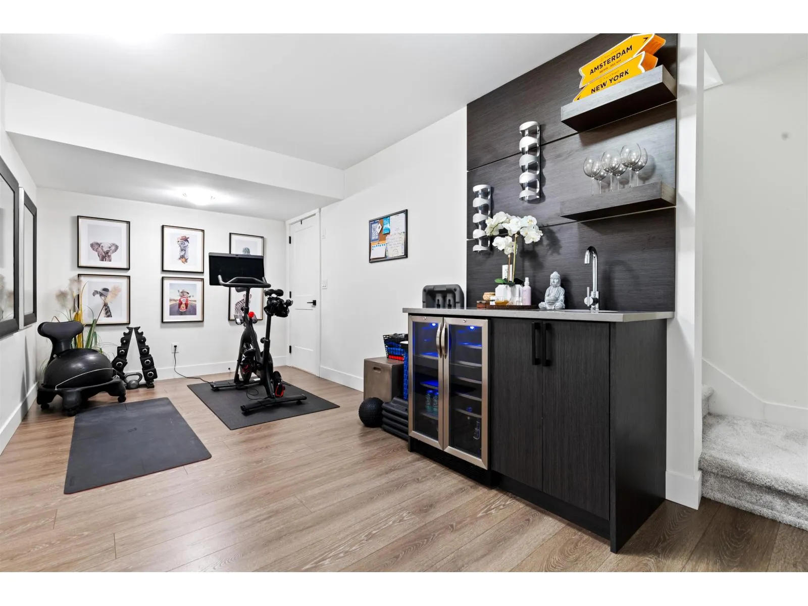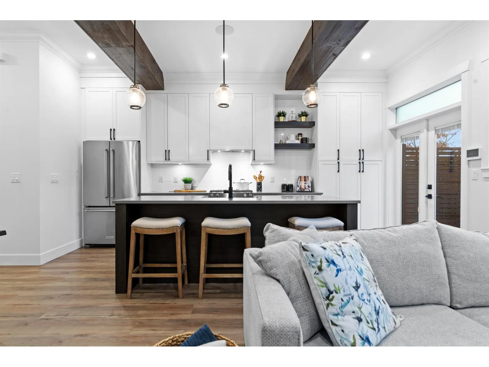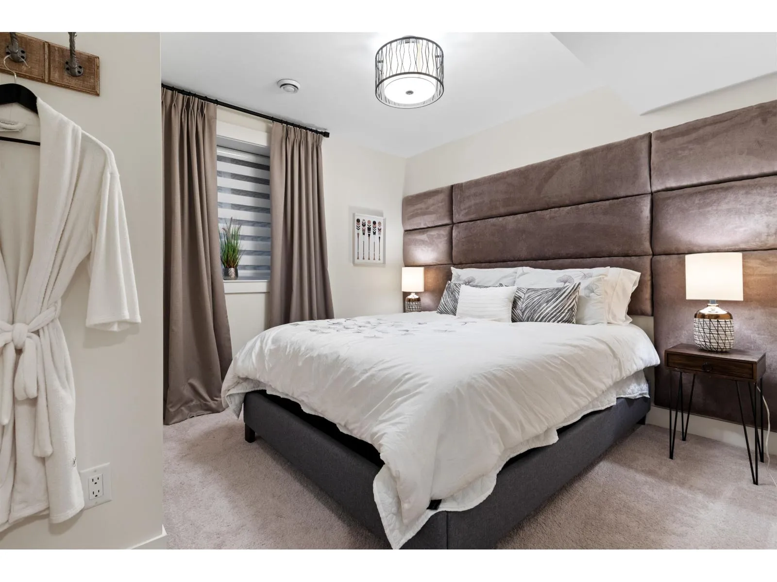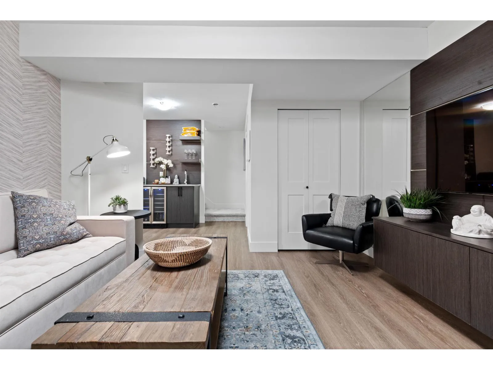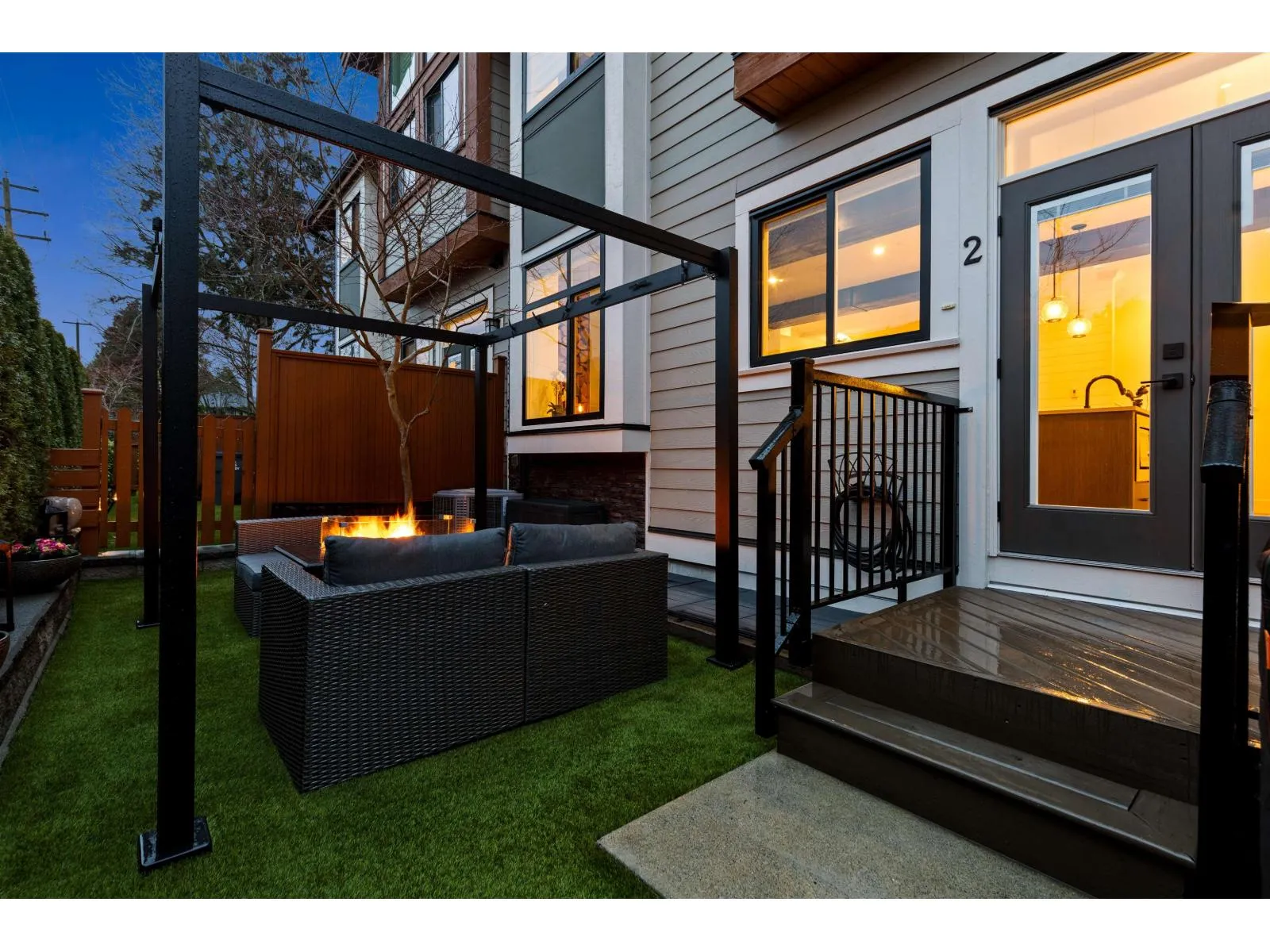 Step into luxury at Marca by Mortise, South Surrey. Former show home, Unit 2 is the former show home w/double wide garage & large driveway for 2 more vehicles. Chalet-inspired design, wood beams, smart home tech, A/C & iControl4 features. Feels like a house w/2300+sqft across 3 levels featuring many built-ins, custom shelving, new laminate flooring throughout, new carpets, newer light fixtures & fresh paint. Main offers white cabinetry, quartz counters, s/s appliances, gas range, island & SW exposure. Upstairs features 3 beds & flex, incl oversized primary w/w-i closet & ensuite w/double sinks. Downstairs includes large rec room w/custom bar, wine fridge & built-ins, plus 4th bed & storage. Enjoy 2 balconies or fenced yard. (id:27476)
