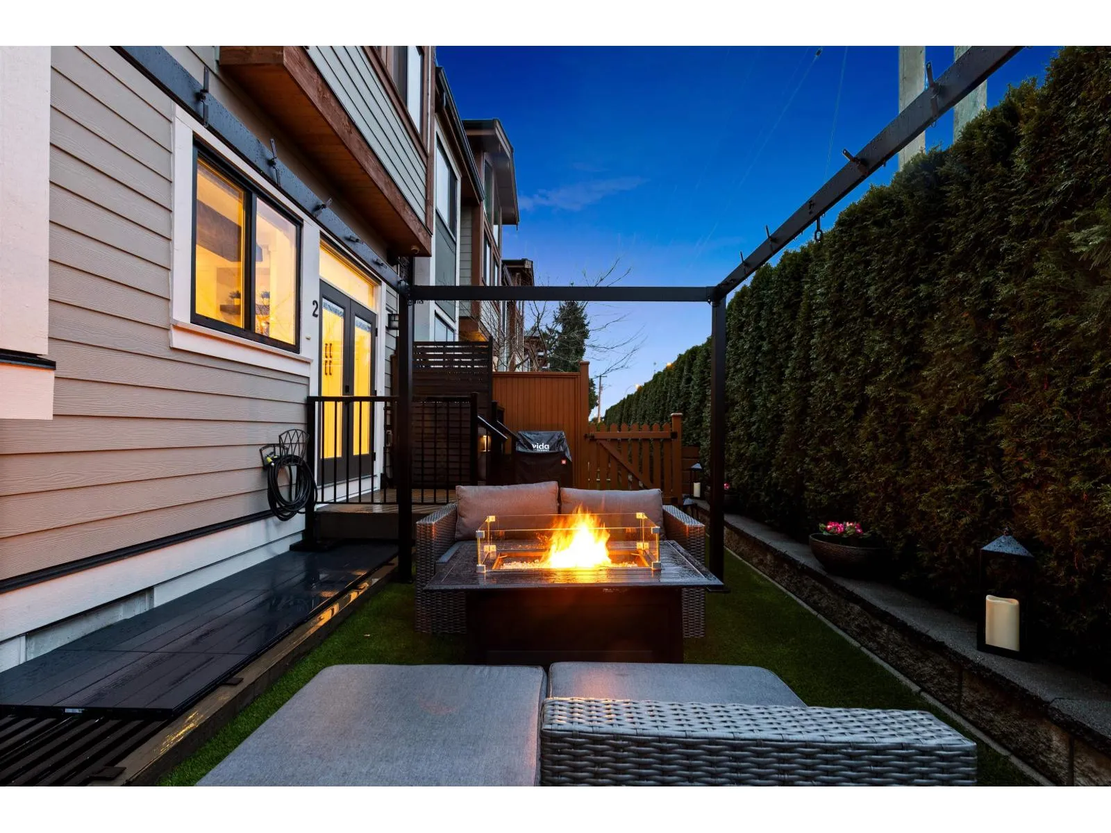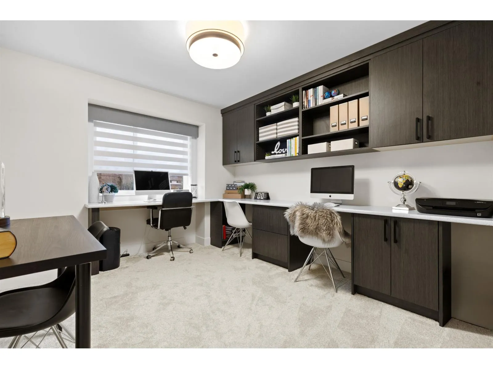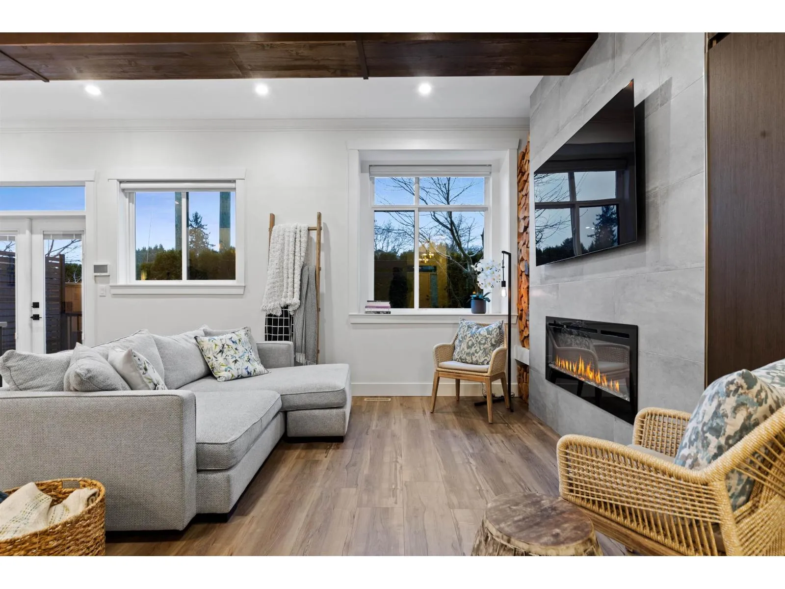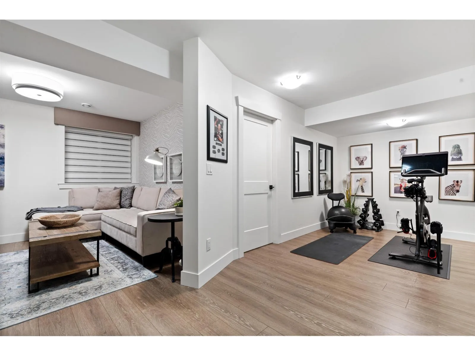 Step into luxury at Marca by Mortise, South Surrey. Former show home, Unit 2 is the former show home w/double wide garage & large driveway for 2 more vehicles. Chalet-inspired design, wood beams, smart home tech, A/C & iControl4 features. Feels like a house w/2300+sqft across 3 levels featuring many built-ins, custom shelving, new laminate flooring throughout, new carpets, newer light fixtures & fresh paint. Main offers white cabinetry, quartz counters, s/s appliances, gas range, island & SW exposure. Upstairs features 3 beds & flex, incl oversized primary w/w-i closet & ensuite w/double sinks. Downstairs includes large rec room w/custom bar, wine fridge & built-ins, plus 4th bed & storage. Enjoy 2 balconies or fenced yard. (id:27476)