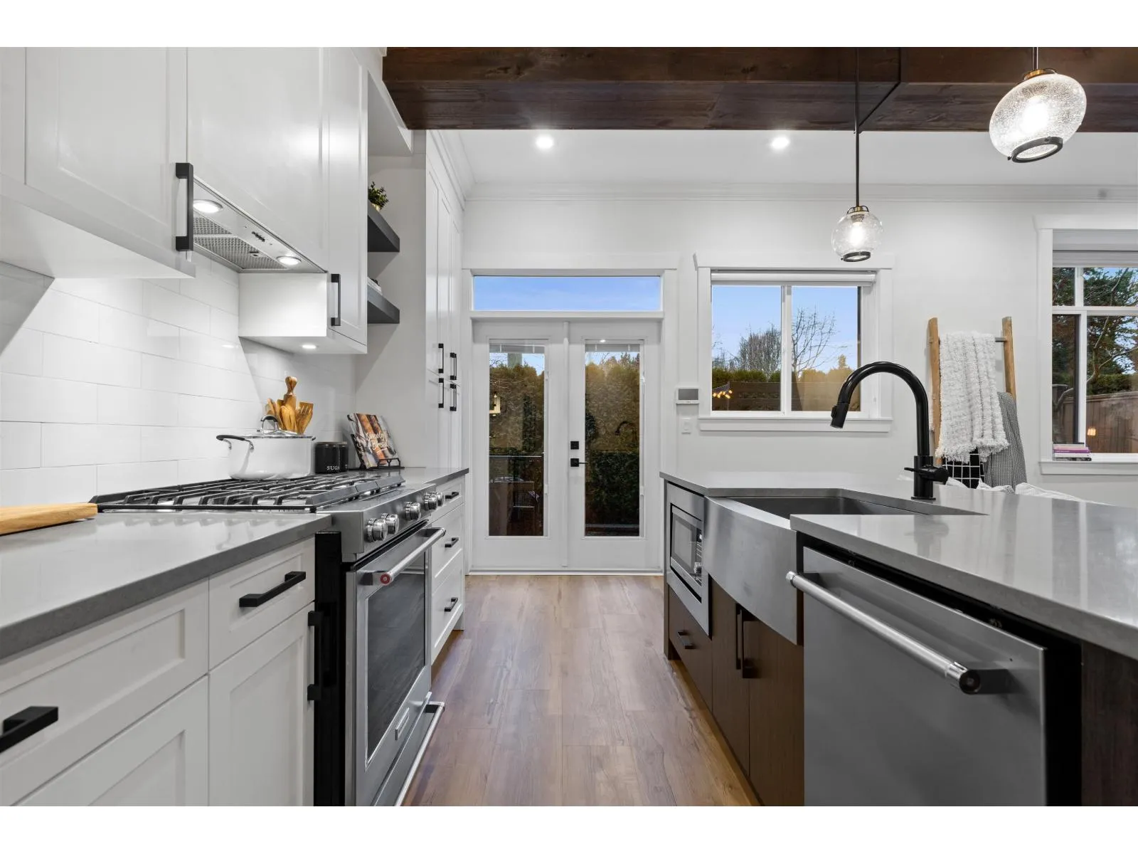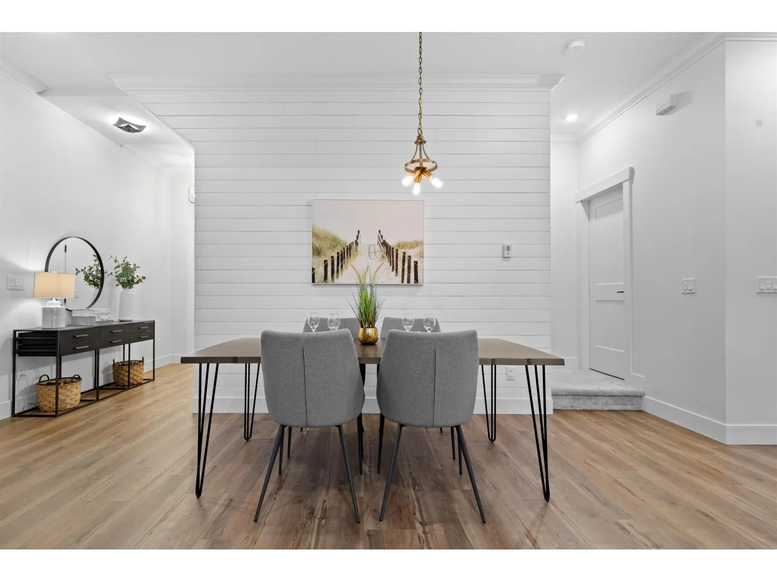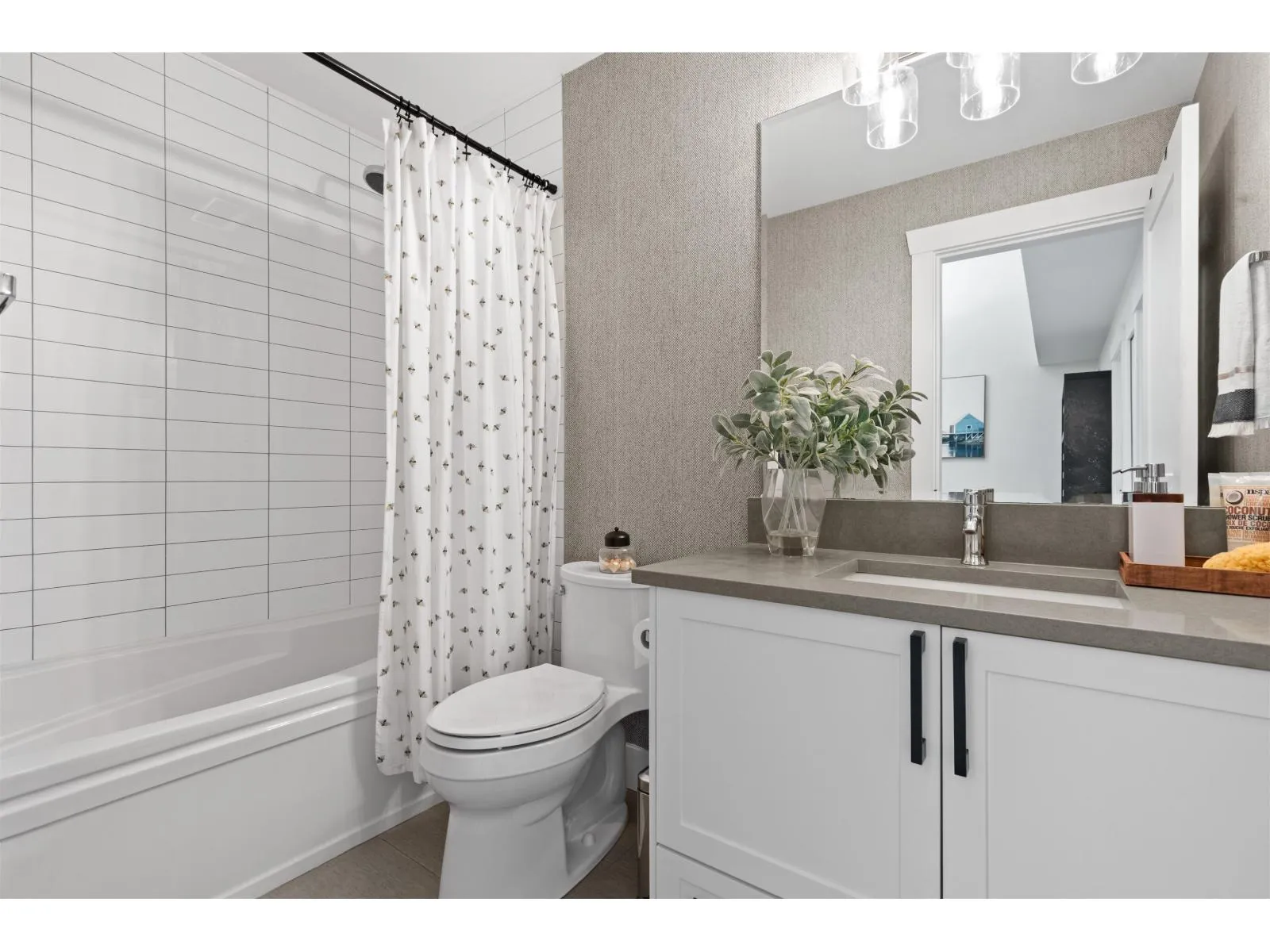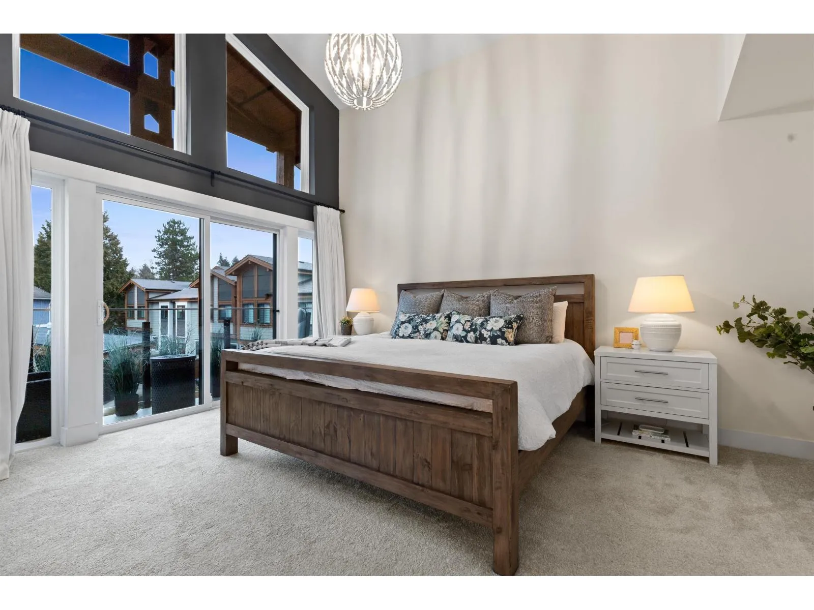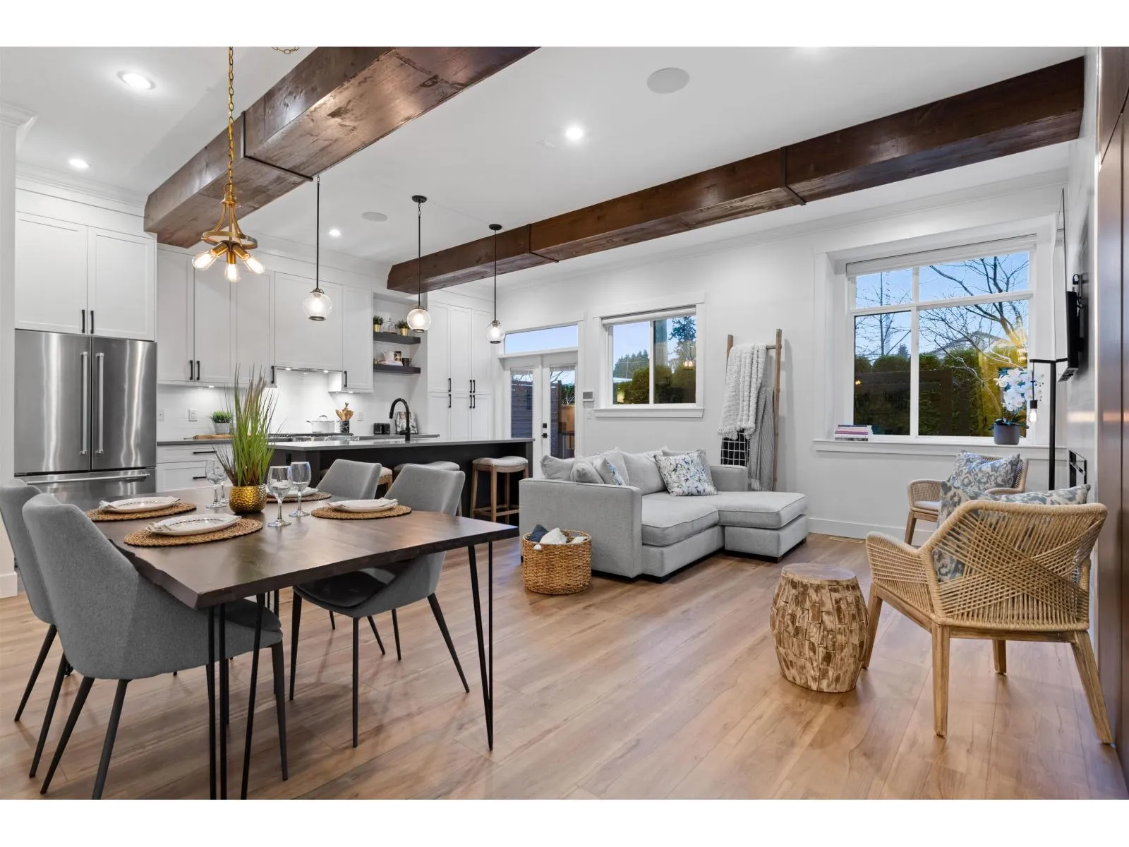 Step into luxury at Marca by Mortise, South Surrey. Former show home, Unit 2 is the former show home w/double wide garage & large driveway for 2 more vehicles. Chalet-inspired design, wood beams, smart home tech, A/C & iControl4 features. Feels like a house w/2300+sqft across 3 levels featuring many built-ins, custom shelving, new laminate flooring throughout, new carpets, newer light fixtures & fresh paint. Main offers white cabinetry, quartz counters, s/s appliances, gas range, island & SW exposure. Upstairs features 3 beds & flex, incl oversized primary w/w-i closet & ensuite w/double sinks. Downstairs includes large rec room w/custom bar, wine fridge & built-ins, plus 4th bed & storage. Enjoy 2 balconies or fenced yard. (id:27476)