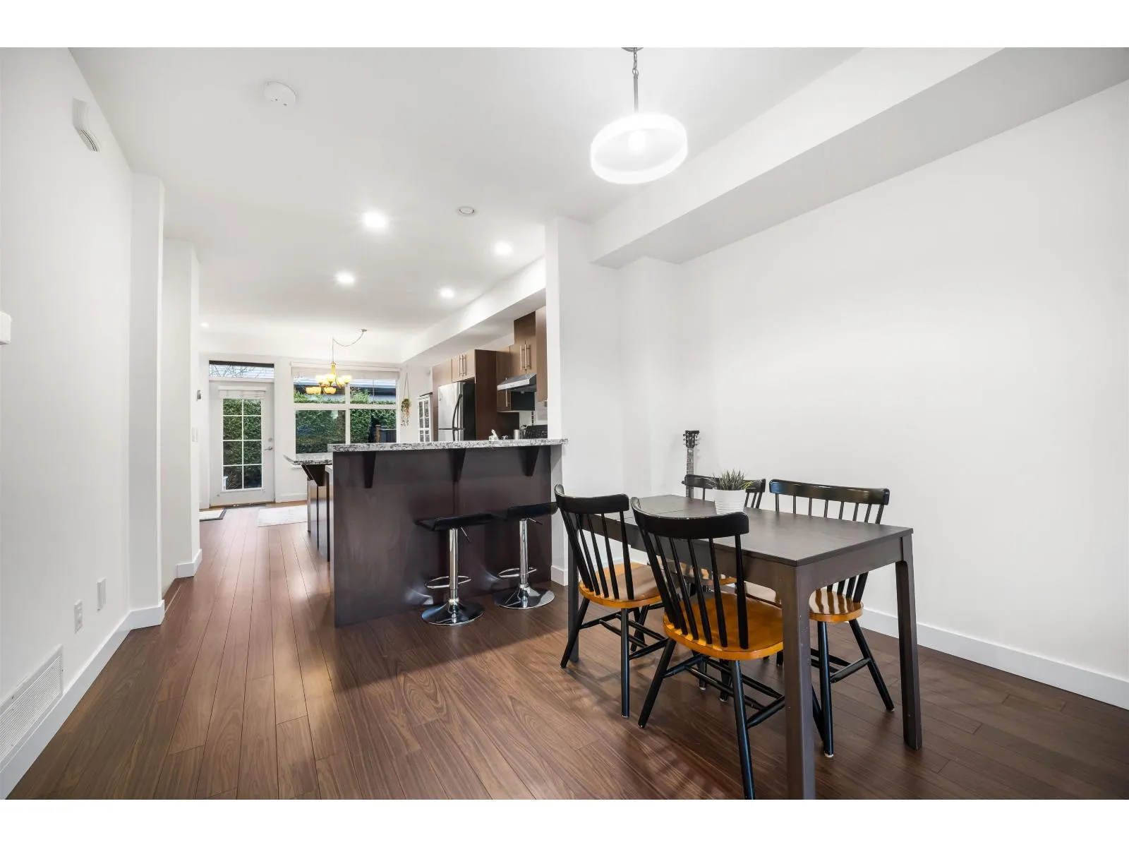 Bright and spacious 4 bed home offering over 1,700 sqft of thoughtfully designed living space in a fantastic location! Built for today's lifestyle, it features 9' ceilings and a bright open-concept layout. The kitchen shines with granite counters, stainless steel appliances, island, pantry, and eating bar-perfect for entertaining. The cozy family room with gas fireplace opens to a fully fenced south-facing backyard with a generous patio. Upstairs offers 3 bedrooms and 2 full baths, including a large, spacious primary suite. A 4th bedroom/office below adds flexibility. Major 2024 upgrades: luxury vinyl flooring, furnace & heat pump with 10-year warranty, and new hot water tank. Freshly painted in 2026. Conveniently located near shopping, schools and new SkyTrain line. Open Feb 21&22 2-4PM! (id:27476)