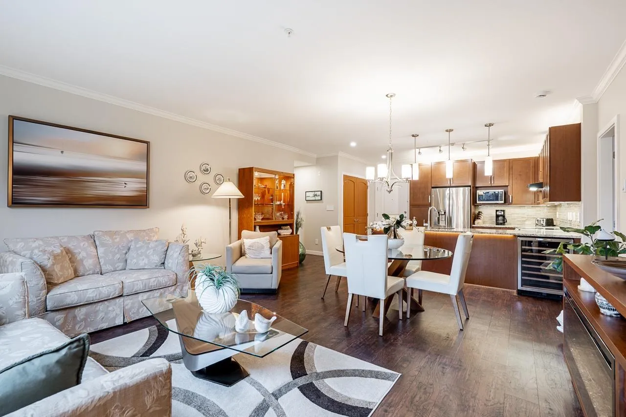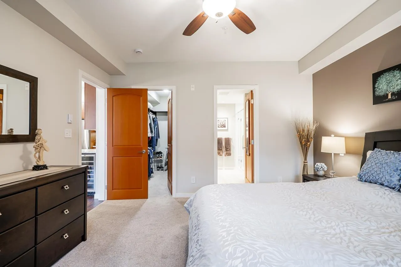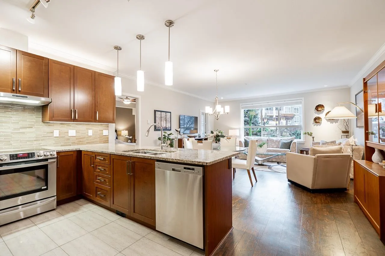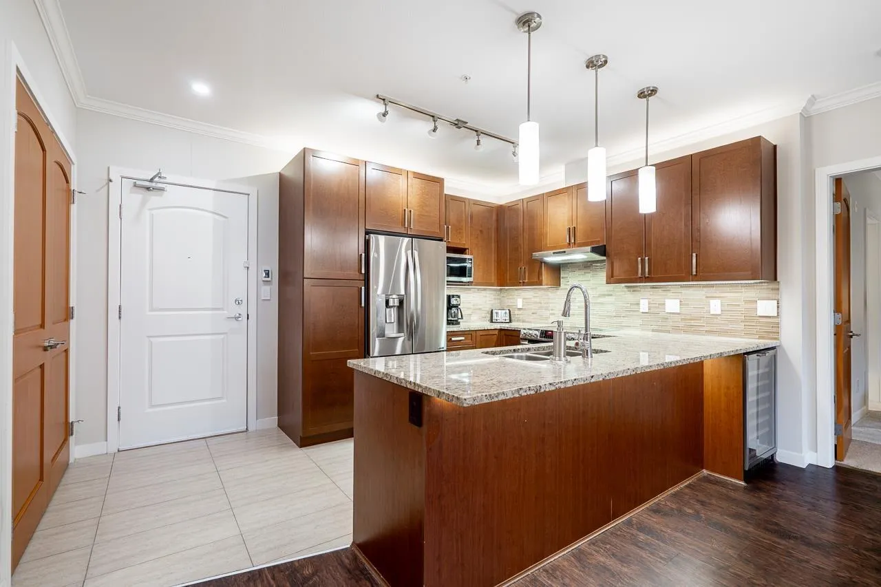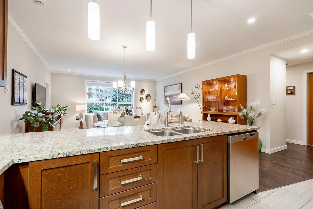 Welcome to this beautifully upgraded 2 bedroom plus den home in Waterstone, one of the most sought-after communities in Clayton. This residence offers a thoughtful layout with premium finishings, exceptional storage and parking options rarely found in condo living. Enjoy heated floors in the kitchen and both bathrooms, upgraded lighting throughout including pot lights and above and under-cabinet lighting. The primary ensuite offers a 5 ft walk-in shower and custom cabinetry, creating a spa-like retreat. This home includes 2 parking stalls, an extra-deep mini garage capable of EV charging, and an abundance of additional storage. North-facing exposure overlooks the beautifully landscaped gardens, providing a private and cooler outlook in the summer months. Residents enjoy resort-style amenities including an indoor pool, hot tub, gym, theatre, party room, and guest suites, all within walking distance to shops, restaurants, transit, and schools. (id:27476)