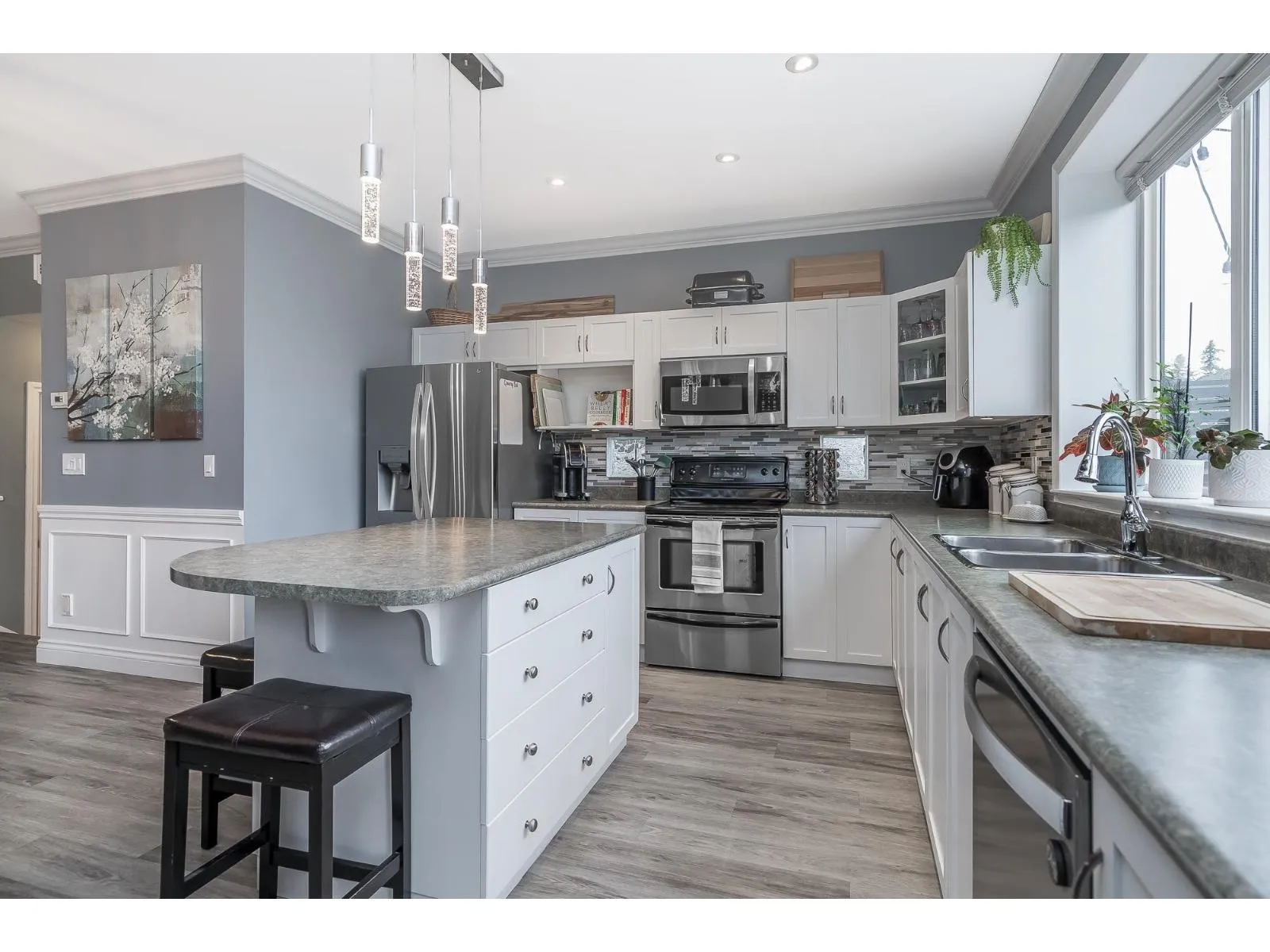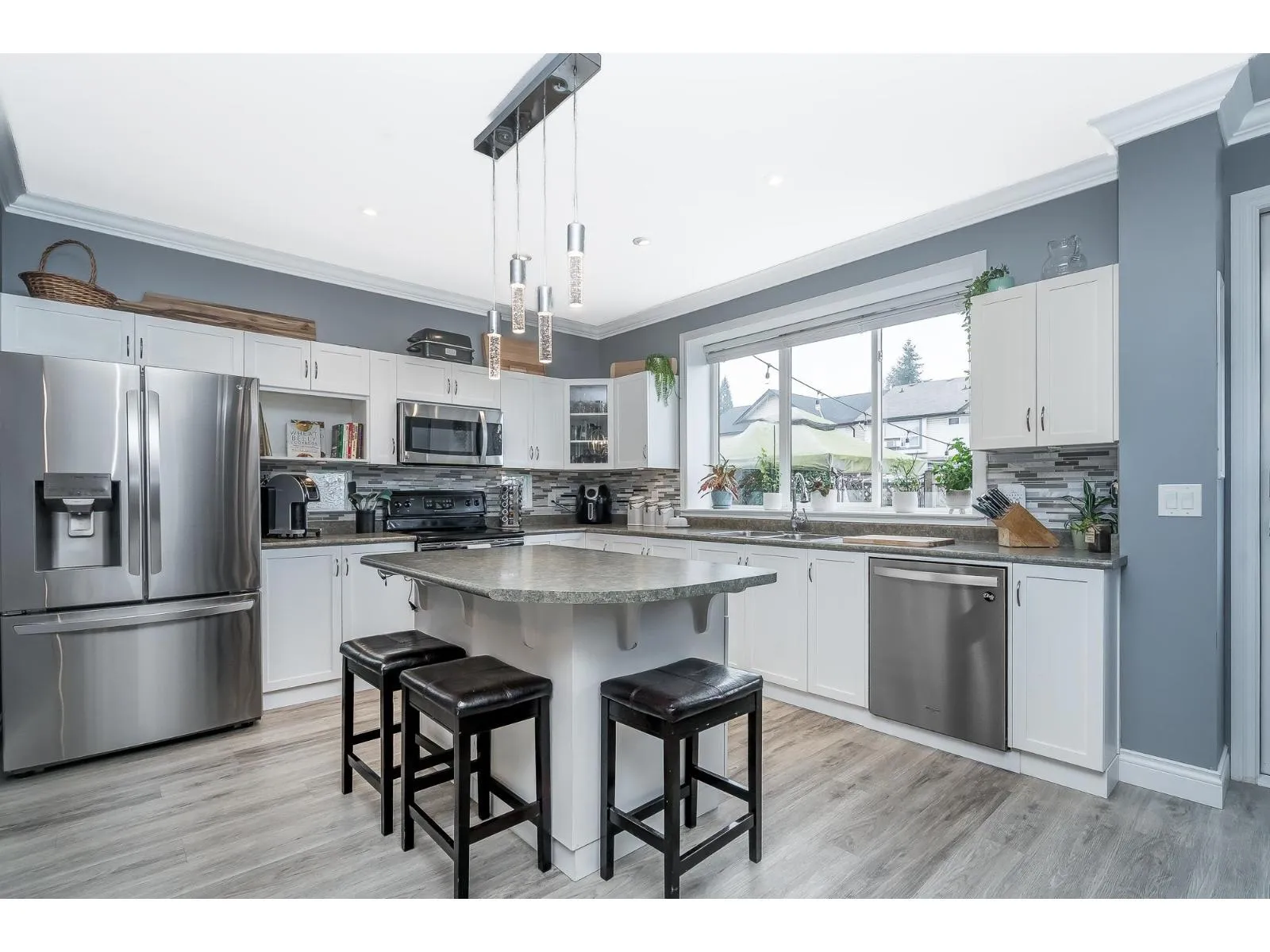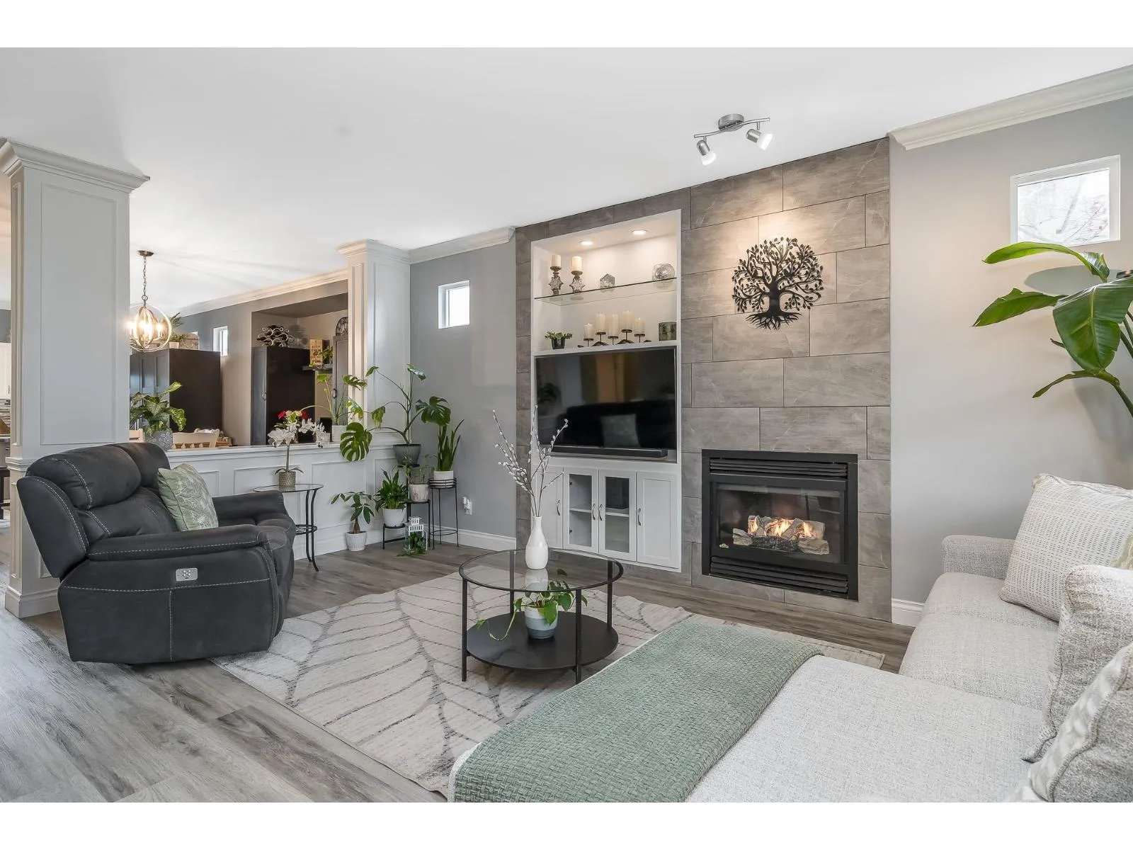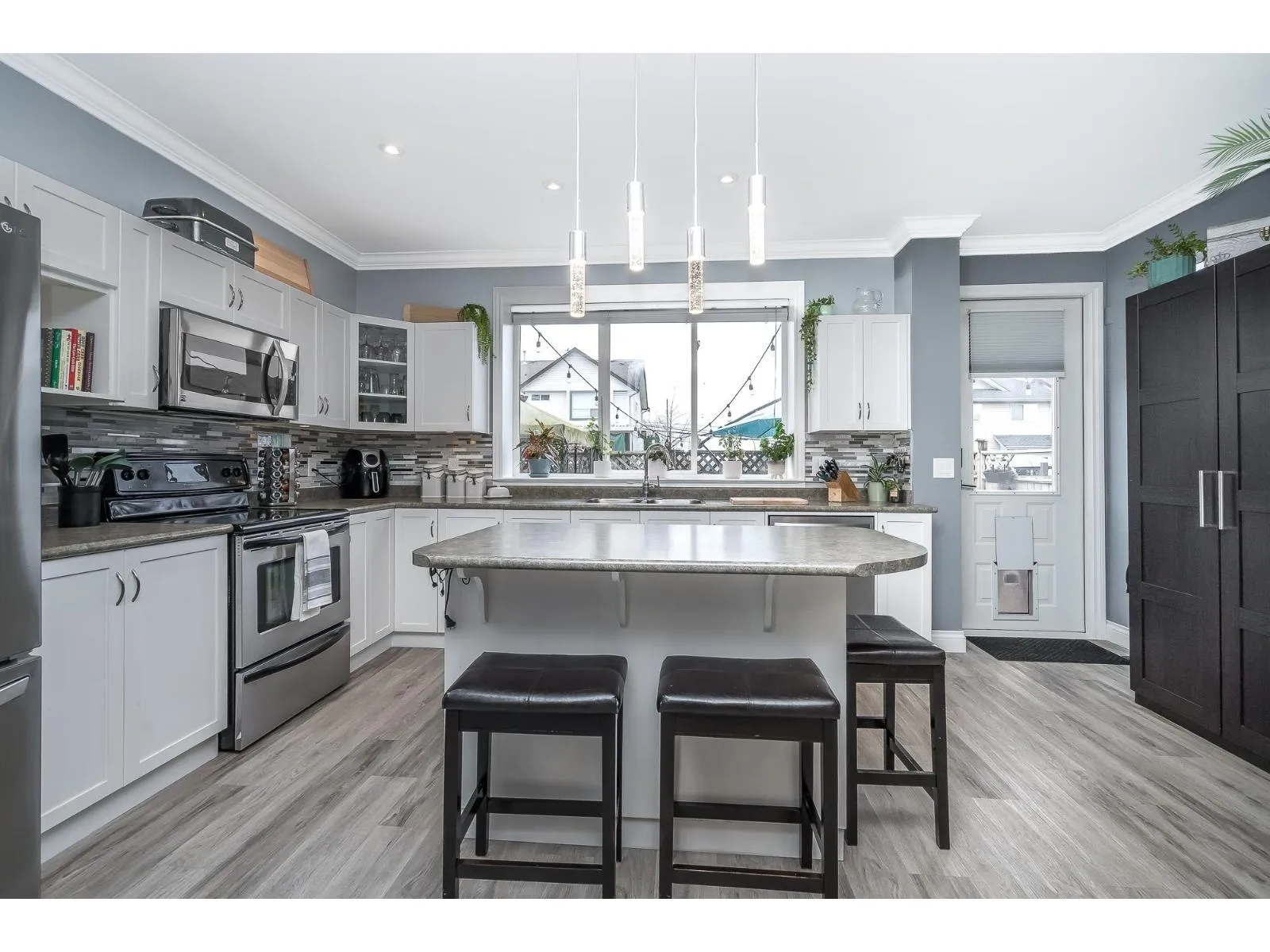Beautifully updated home with wide plank vinyl flooring, custom millwork, wainscotting, baseboards, and trim. The open-concept main floor features a custom fireplace with designer surround and a bright white kitchen with island, mosaic tile backsplash, and stainless steel appliances. PEX plumbing (no Poly B), a newer roof, A/C, new lighting, fresh paint, and smooth ceilings with pot lights. Enjoy a large back deck with a hot tub, new landscaping rocks, turf, and a charming front porch for great curb appeal. Located across from a community park, perfect for kids, a 9 min. walk to the future skytrain station, and a 5 min walk to Hillcrest Elementary school. Rear lane parking with room to build a garage. (id:27476)