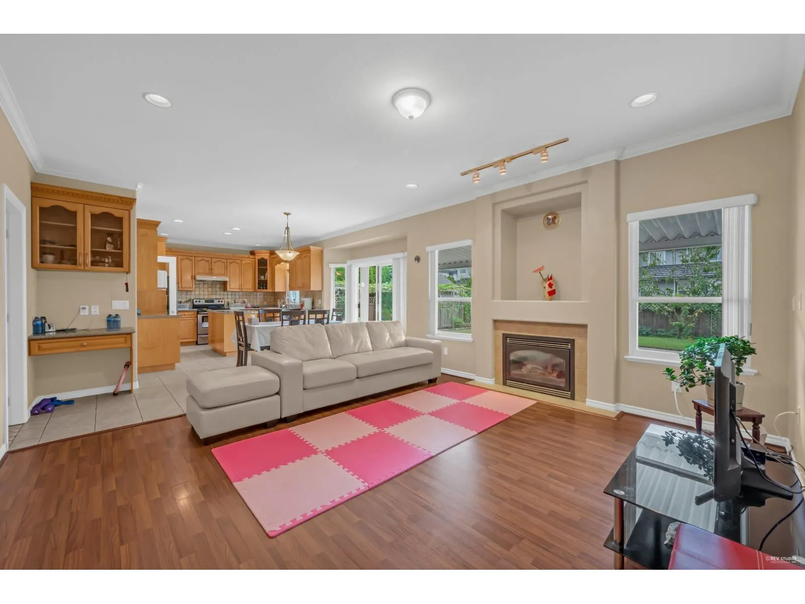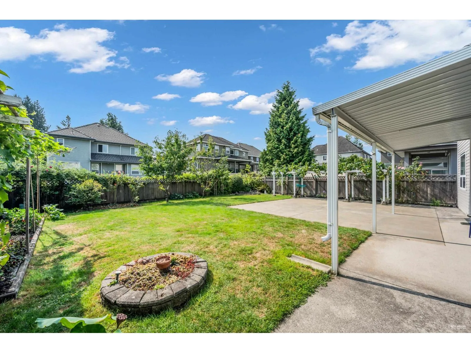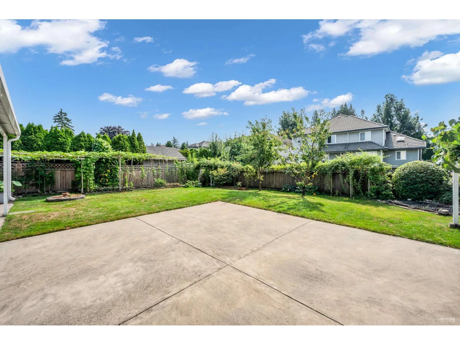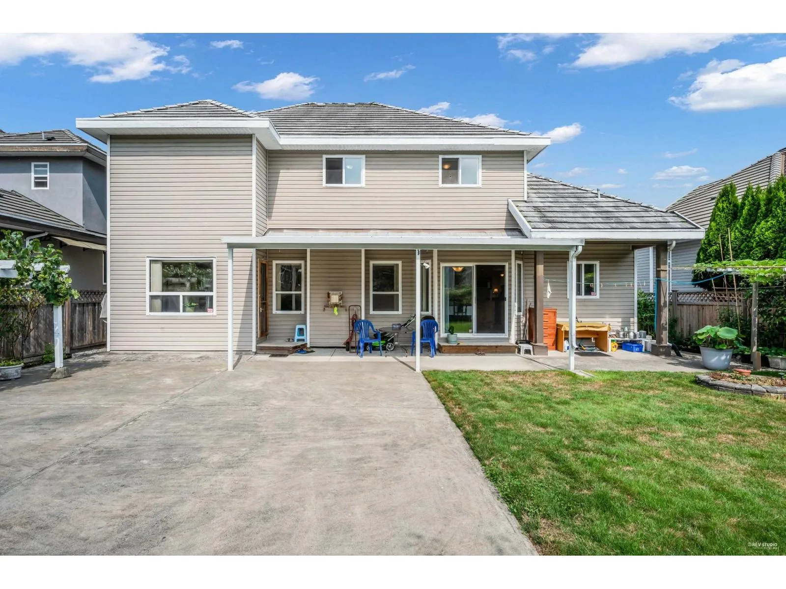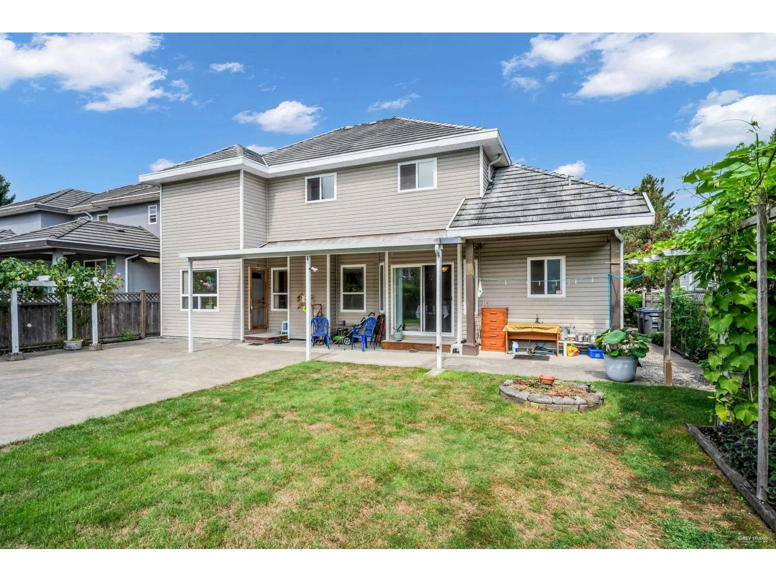 This spacious two-storey home on a large south-facing lot offers an open and bright layout with generous living spaces, a maple kitchen with center island, two gas fireplaces, raised ceilings, four bedrooms upstairs plus a main-floor den, and a one-bedroom suite with private entrance. The heat pump air conditioning system, ensuring year-round comfort. The fully fenced yard is beautifully landscaped with vibrant flowers, while the backyard features a grapevine-covered arbor full of grapes, along with a large play area for kids. A rare blend of comfort, charm, and great value in a sought-after Fraser Heights neighborhood! (id:27476)