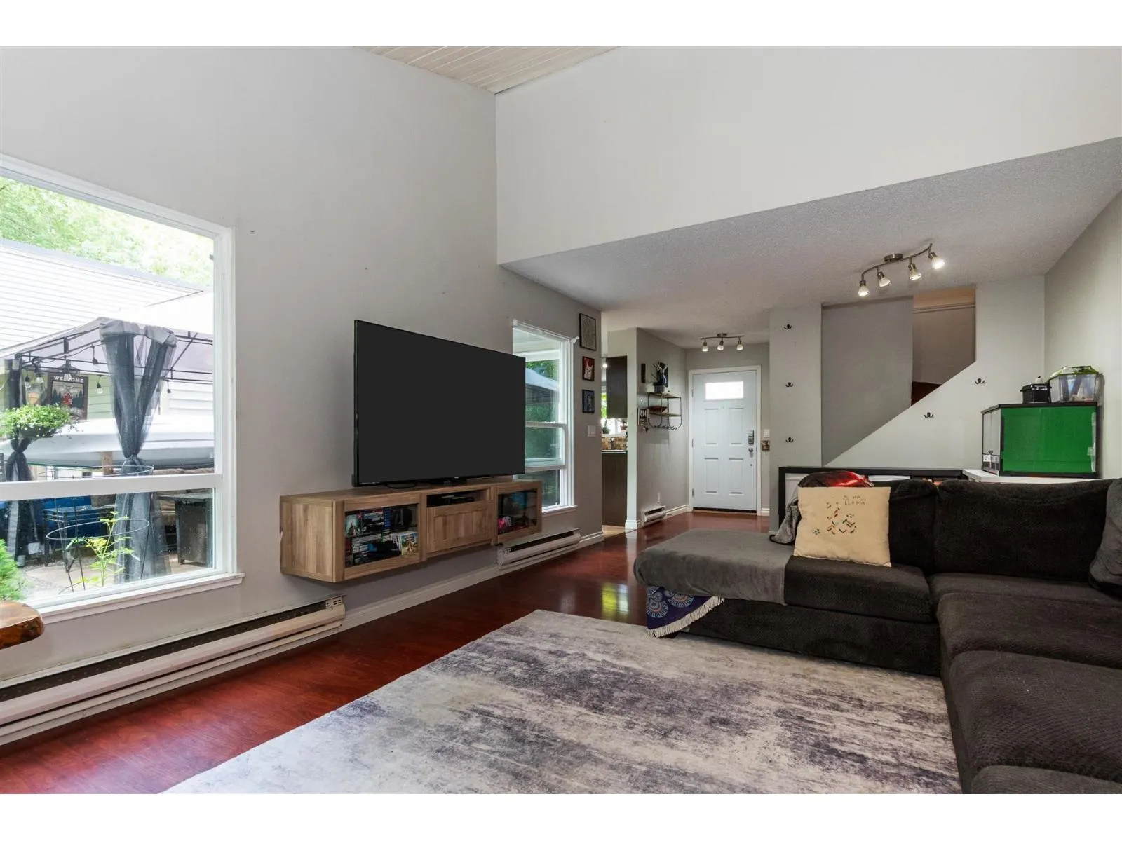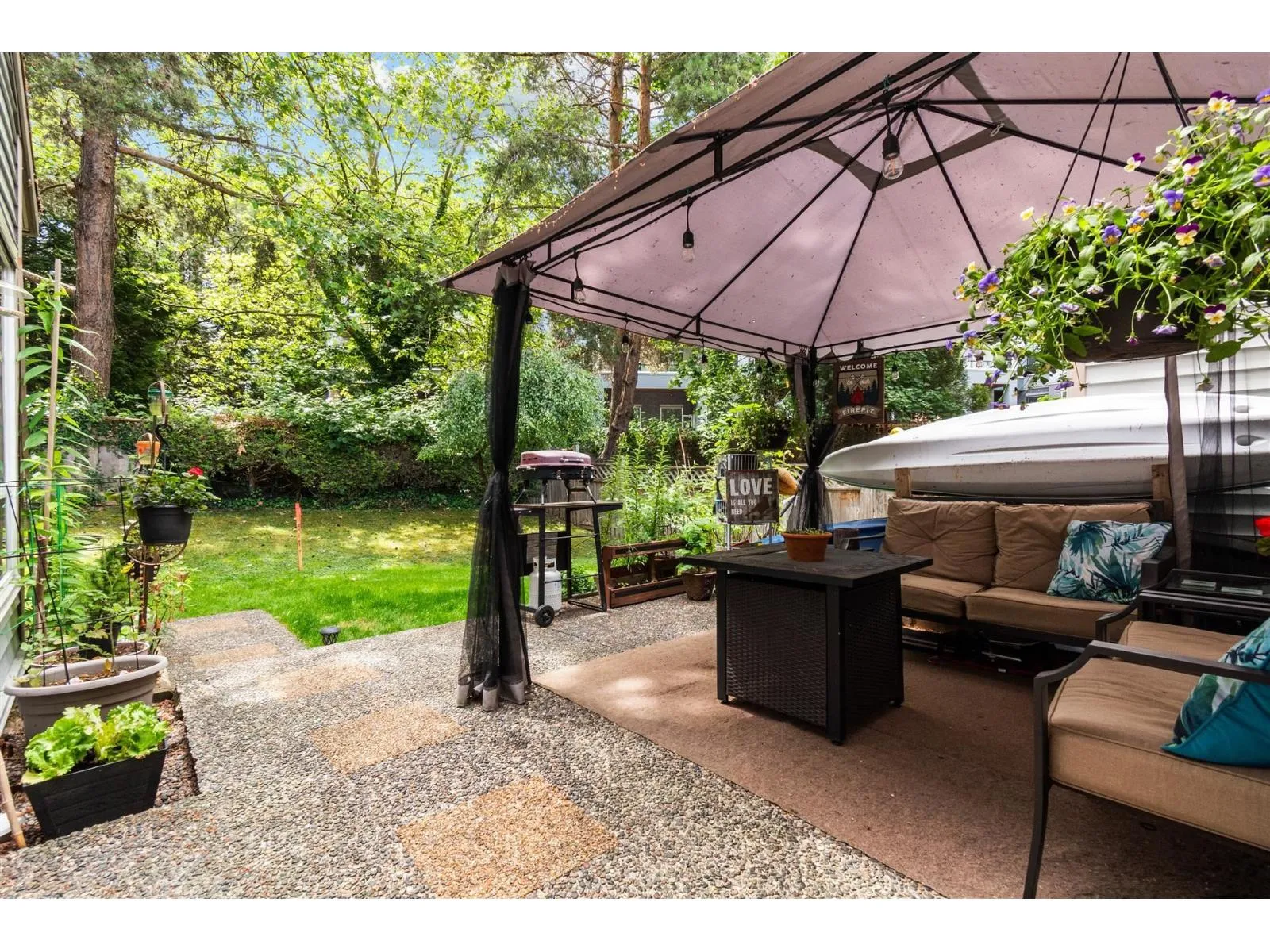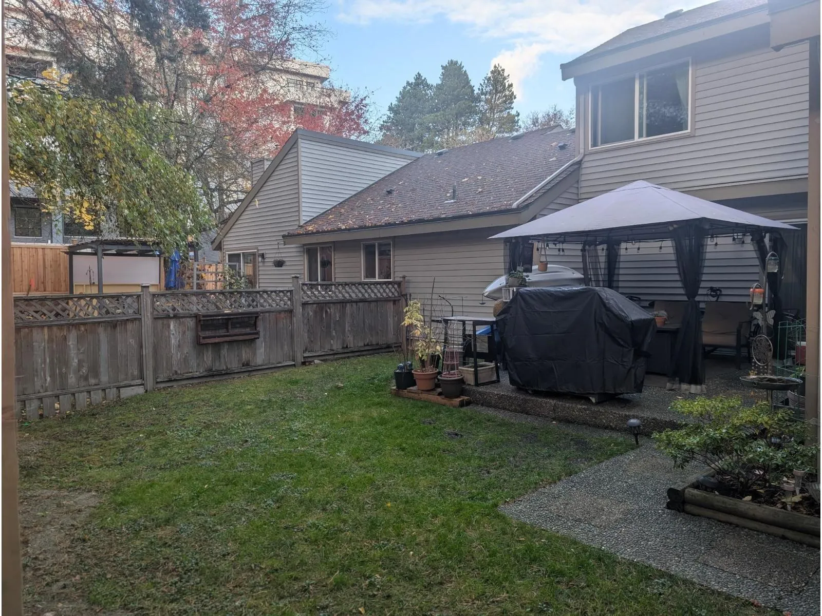 Nicely renovated end unit twnhm with fabulous fenced rear yard filled with beautiful greenery. Open concept flr plan on main has entertainment sized liv/ dnrm room with efficient gas fireplace. Kitchen with wood cabinets, S/S appliances, dishwasher, tiled flr and backsplash conveniently next to utility/lndry rm (possible 2 piece bathroom). Kitch also has sliding glass drs out to concrete patio area and playgrnd friendly yard fabulous for those summer BBQs. 2 generous sized bdrms up with full bthrm. Complex updates include roof, vinyl windows and siding. Great rec facilities with play court, outdoor pool and well equipped exercise center. 2 side by side parking stalls at front entrance. Walk to Elementary School, shops and transit. 6 months of free strata fees included in list price. (id:27476)