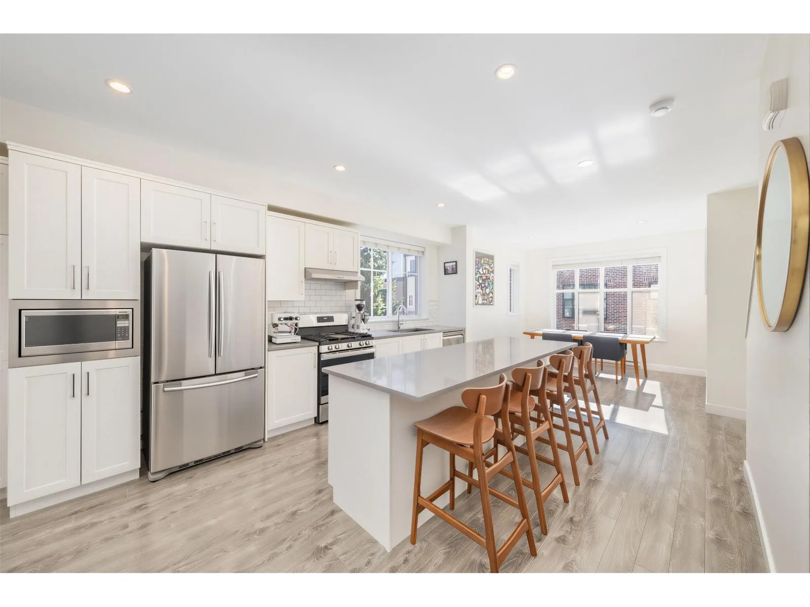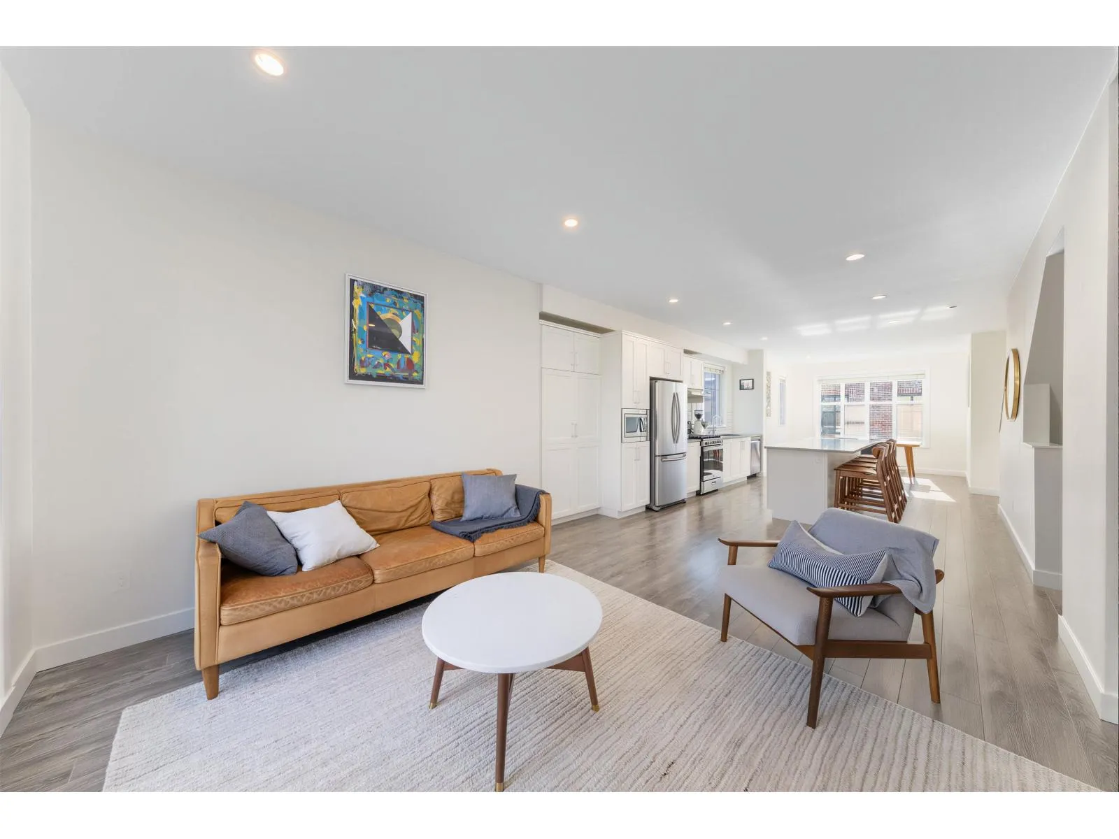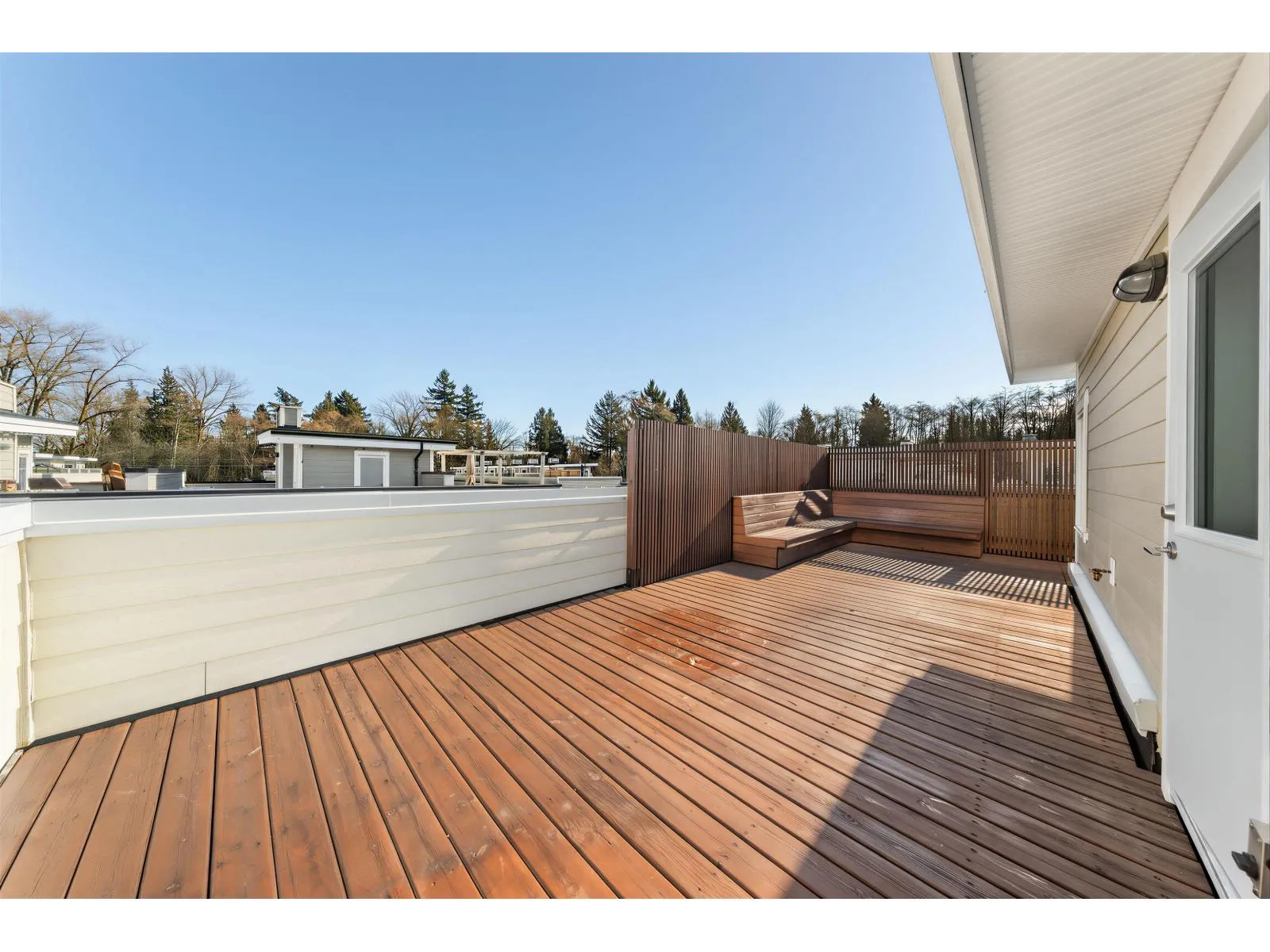 BEST LOCATION end-unit townhome in the Complex offering 3 bedrooms, 3 bathrooms plus a den, with bright, move-in ready living space. Enjoy two outdoor areas - a private main-floor balcony and a 388 sq.ft. rooftop deck featuring a custom wraparound bench and privacy wall, perfect for entertaining while overlooking peaceful greenbelt views. The open-concept kitchen showcases a large quartz island, ample cabinetry, a 2026 gas range, along with a convenient powder room on the main level. As a desirable end unit, extra windows throughout provide abundant natural light. Rare live/work zoning allows for a legal home-based business or private office with separate garden entry. Ideally located between Grandview and Morgan Creek Golf Course, with easy access to shopping, schools, transit, and Hwy 99. (id:27476)