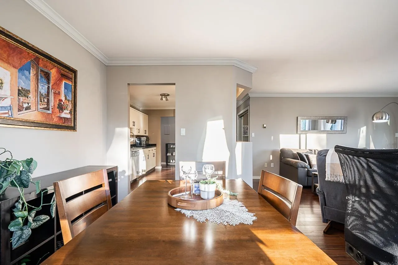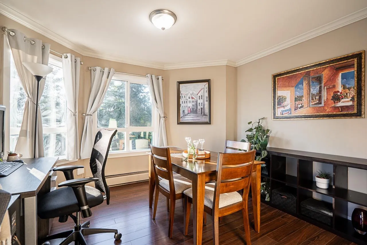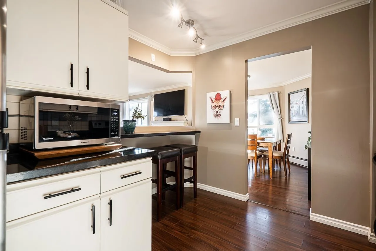 Bright and beautifully updated top-floor home in desirable Southmere. This inviting residence offers a spacious living room with a cozy gas fireplace, laminate flooring, and large windows that bring in abundant natural light. The kitchen features a generous layout with ample cabinetry and storage, providing plenty of space to cook and gather. The building has undergone extensive interior and exterior renovations, adding long-term value and peace of mind. Enjoy your private balcony overlooking trees, with BBQs allowed. Well-maintained complex with outdoor pool and in-suite laundry. Steps to Semiahmoo Shopping Centre, transit, parks, restaurants, and minutes to White Rock Beach. Ideal for first-time buyers, downsizers, or investors. Book your showing today! (id:27476)