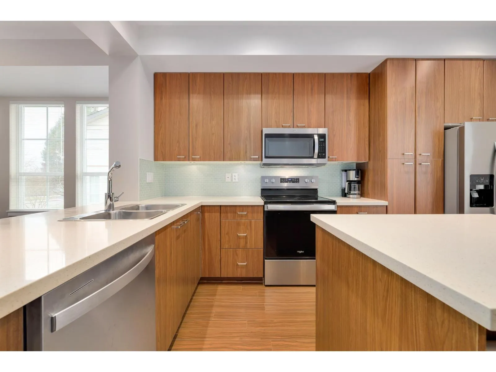 GLENMORE - Rare, End Unit Townhouse; 4bd/3ba 1,759sf in highly sought after, well established complex in Morgan Heights. Rich laminate floors and 9' ceilings on the main, with spacious living room, fireplace, and generous dining area. Oversized windows fill the home with light. Kitchen with stone counters, ample storage, eat-up bar, & newer stainless-steel appliances. Family room opens to large sundeck. Above: laundry and 3 bedrooms, including spacious primary w/spa ensuite. Below: 1 bedroom & 3pc bath. Side by side garage. Huge sunny south-facing fenced backyard. Amenities include pool with hot tub, fitness, clubhouse, hockey rink, party room, billiards, & lounge. Walk to shops, schools, & transit. Southridge priv. School, Sunnyside Elem. & Grandview Heights Sec. Call Today! (id:27476)